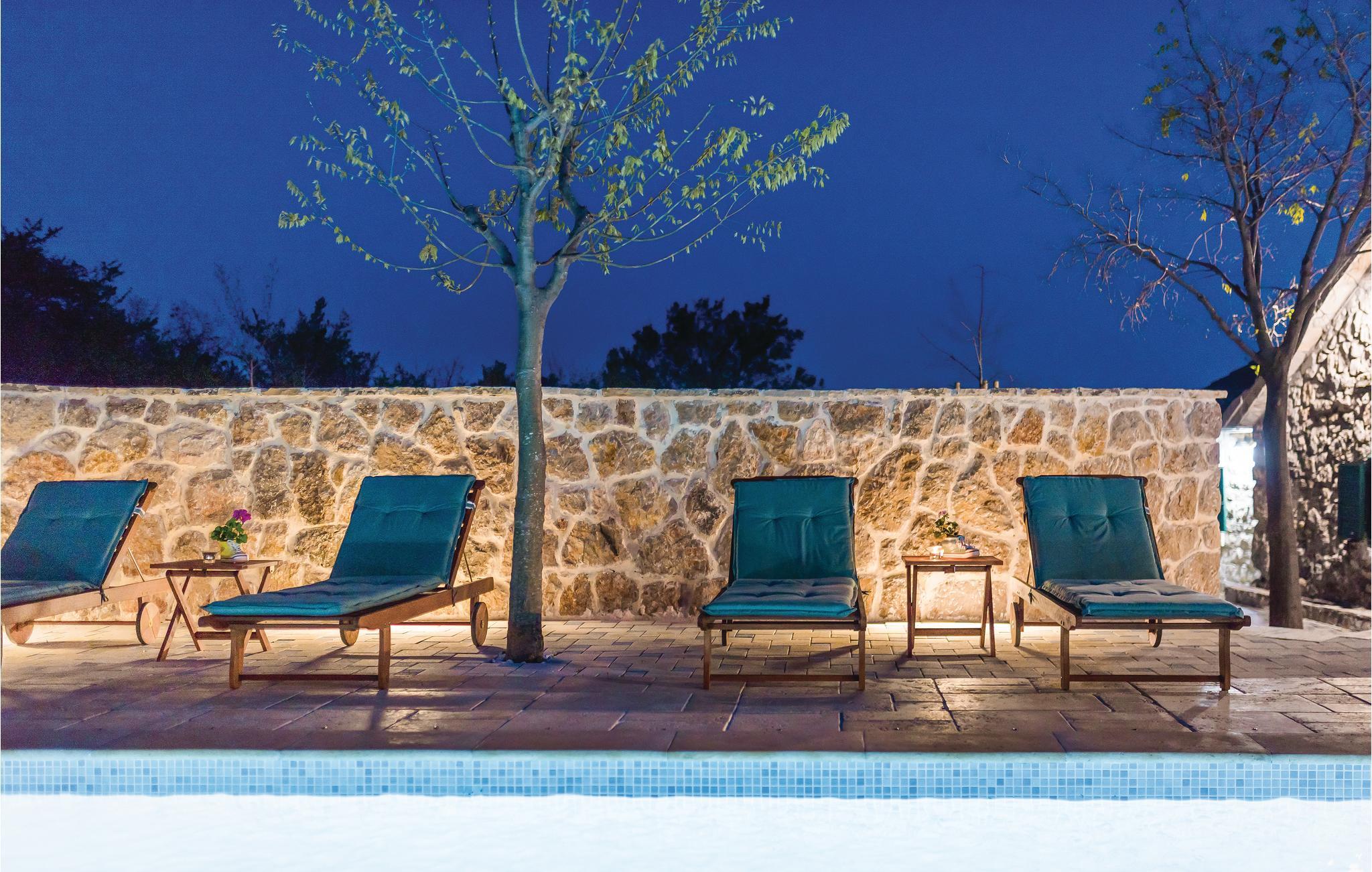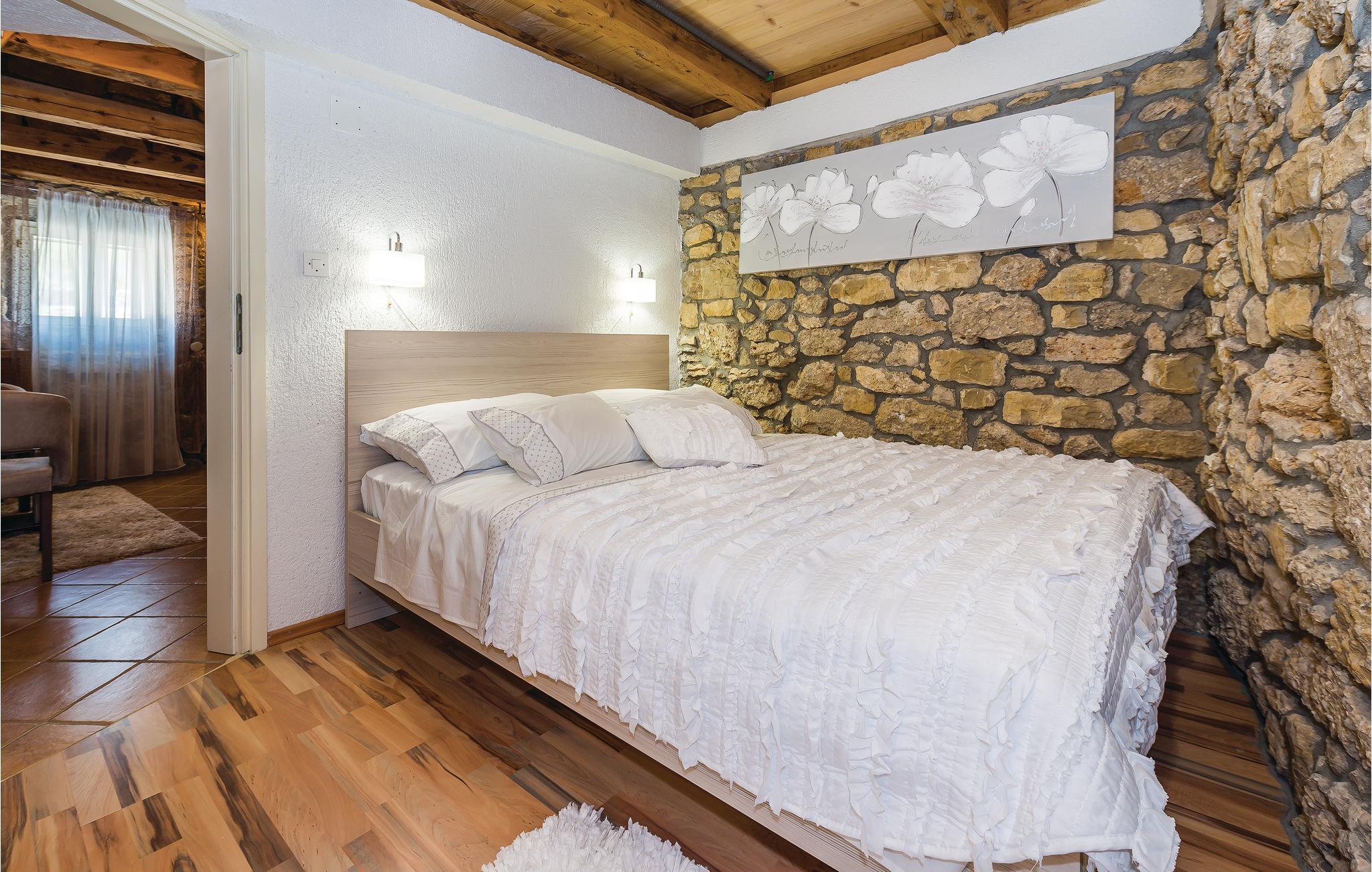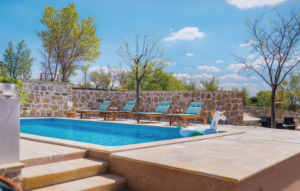 Dette feriehus ligger på en 1300 m² stor grund og består af to bygninger, hvor der i hovedhusets stueplan er stue, to soveværelser, to badeværelser og stejle trapper af træ, der fører op til hemsen. Her ligger husets tredje soveværelse med en minimums lofthøjde på ca. 60 cm i siden (skrå vægge), mens der i den tilstødende bygning er et køkken, badeværelse og et værelse med sauna og whirlpool. Udendørs i haven står en grill, hvor I kan lave lækre måltider. Benyt den gode belligenhed og besøg den nærliggende Krka Nationalpark eller nationalparkerne Plitvicesøerne, Kornatiøerne, Paklenica og Nordvelebit. Inden for 25 km ligger byerne Vodice og Šibenik og kroatiens største vandfald: Manojlovac. Der er restauranter og butikker i byen Drniš, samt arkæologiske ruiner efter tyrkiske bygninger, hvis herredømme de gamle moskeer og en fæstning stadig bærer vidne om. Regionens gastronomiske specialiteter er skinke, ost, svampe, vine og desuden skal I smage de traditionelle retter på en af de mange restauranter.
