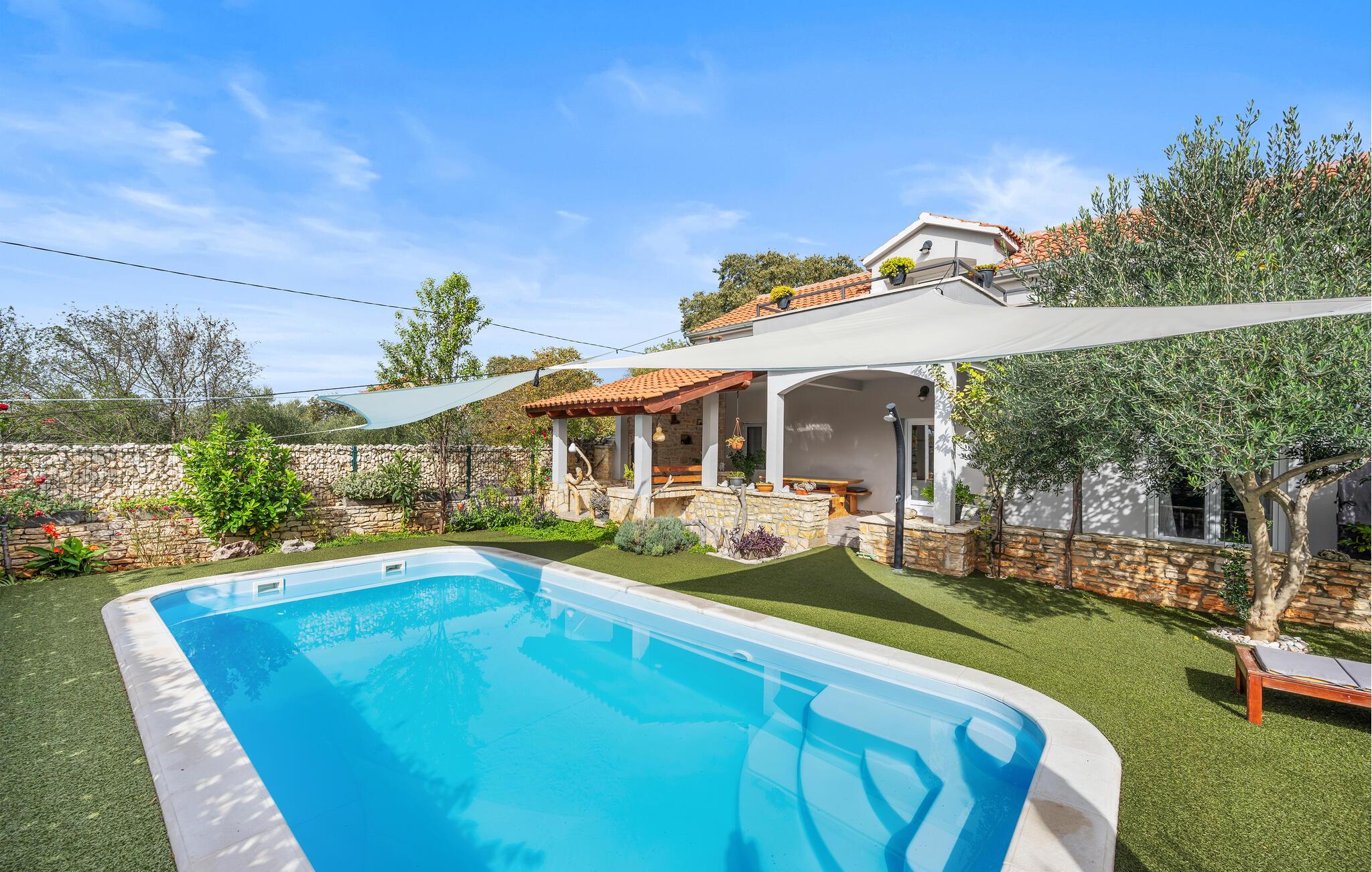 Stort feriehus med rolig beliggenhed samt indbydende pool og privat atmosfære.