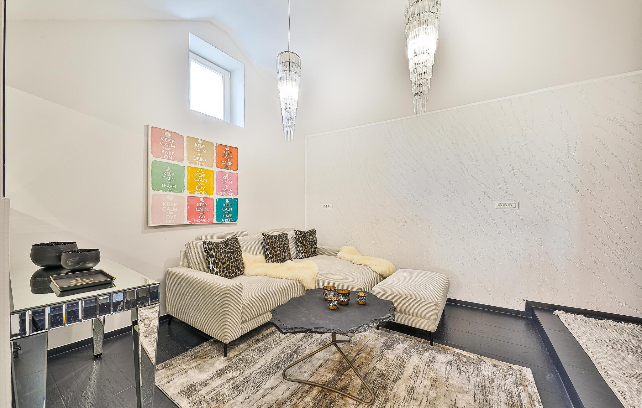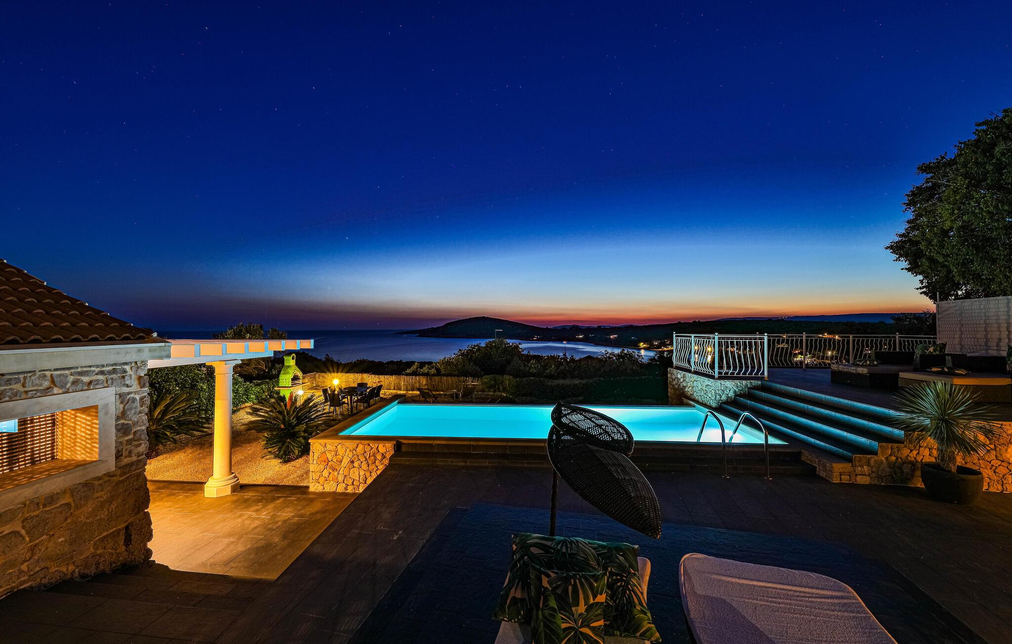 Udenfor er der en helt vidunderlig infinity-pool med panoramaudsigt over havet. I kommer uden tvivl til at tilbringe mange dejlige timer her. Slap af på en af ??liggestolene under den bagende kroatiske sol, mens de små plasker fornøjeligt rundt i poolen. Ejendommen er fuldstændigt indhegnet og tilbyder derfor komplet privatliv og desuden mange hjørner til leg og afslapning. På terrasserne kan I nyde jeres feriemåltider sammen og beundre fortryllende solnedgange til et godt glas vin. Trænger I til et afbræk fra poolen, er der kun 300 meter til den nærmeste grusstrand, hvor I kan bade i krystalklart vand.