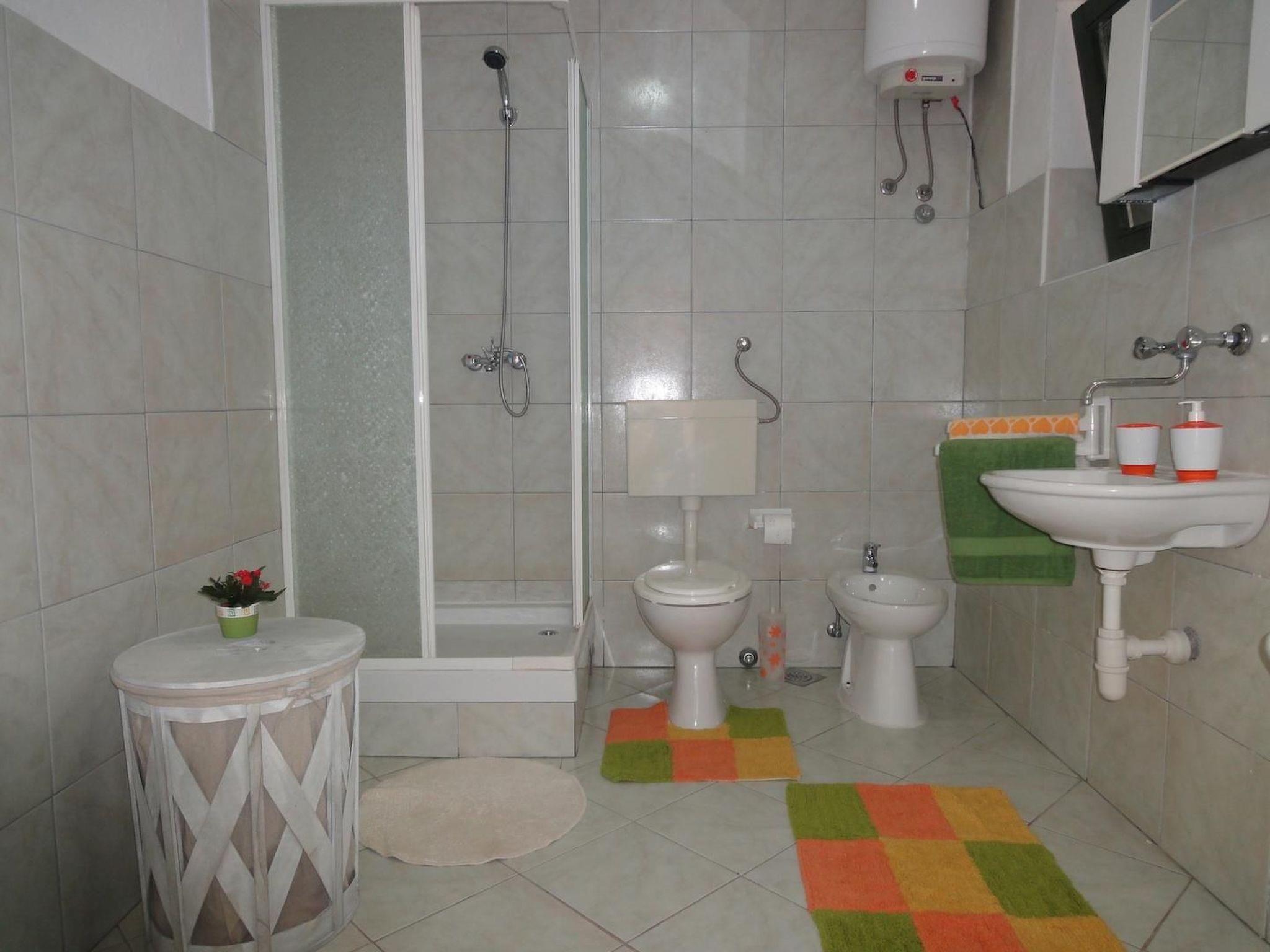 The apartment with a separate entrance is on the ground floor and can accommodate up to nine people. There are three bedrooms, two of which each have a double bed, while the third has three single beds. Two children can sleep on the sofa bed in the living room. The open living and dining room with a kitchen has satellite TV and a big dining table with chairs. The kitchen is fully-equipped with a stove, oven, fridge-freezer, microwave, coffee machine and dishwasher. The two bathrooms each have a shower, washbasin and toilet. The larger bathroom also has a bidet.