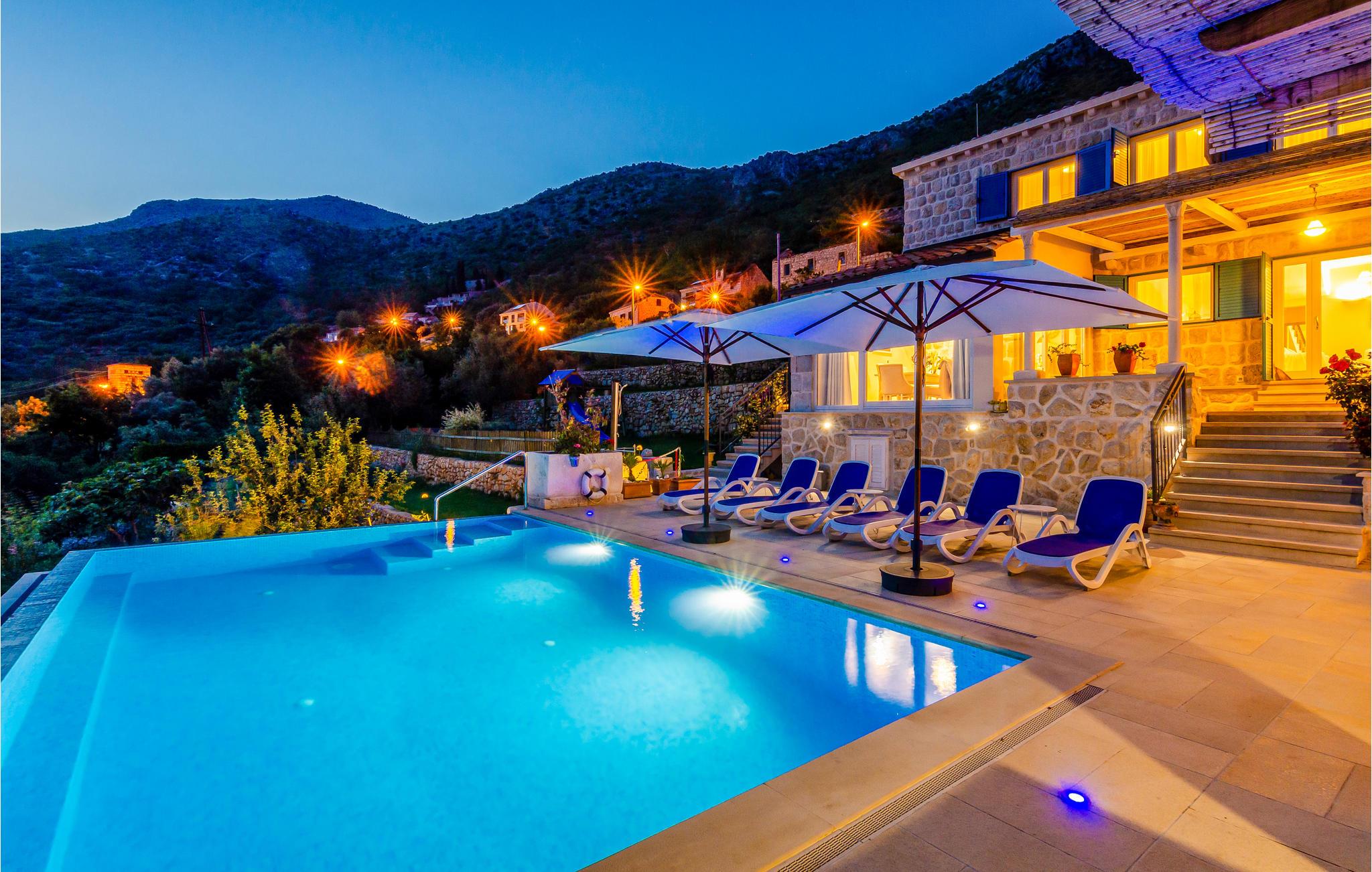 Omhyggeligt renoveret dalmatisk hus af sten, med skøn udsigt over havet og øerne. Husets indre er moderne og rustikt møbleret, med god stil og masser af dagslys. I stueplan er der køkken, spise- og opholdsstue og et badeværelse. På første sal ligger tre soveværelser og to badeværelser. Her er aktivitetsrum med billard, bordfodbold, dart og forskelligt legetøj til de små. Den del af huset som måske er den dejligste er terrassen med pool, med alle former for komfort og privatsfære og en spektakulær udsigt over solnedgangen. Brsecine er en dalmatisk by nær Dubrovnik, med mange former for sommerunderholdning. Det tager kun fem minutter I bil at køre til den dejligste kiesstrand. Her kan hele familien holde en uforglemmeligt dejlig ferie under den varme sol.