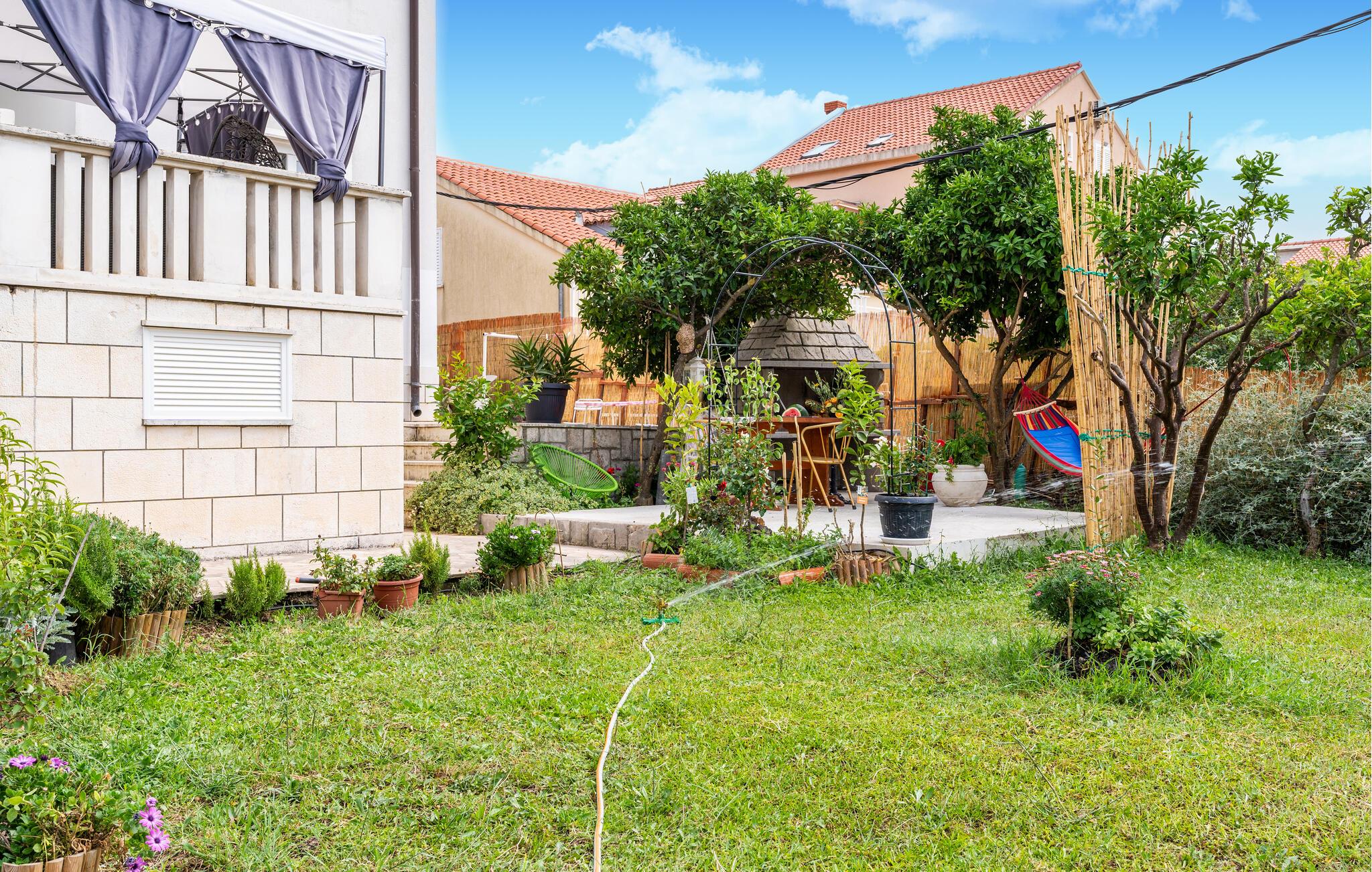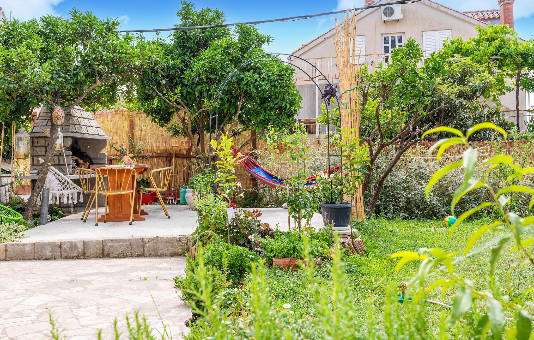 Jeres venlige ferielejlighed byder på en rolig beliggenhed og en atmosfære, der lover ren afslapning. Den smagfulde indretning kombinerer moderne faciliteter med farverig og dekorativ flair. De lyse opholdsrum indbyder til afslapning, mens flere terrasseområder, inklusiv en med muret grill i fælleshaven, er dejlige steder til hyggelige aftener. Den opstillede pool i haven sørger for forfriskning og badesjov for hele familien.