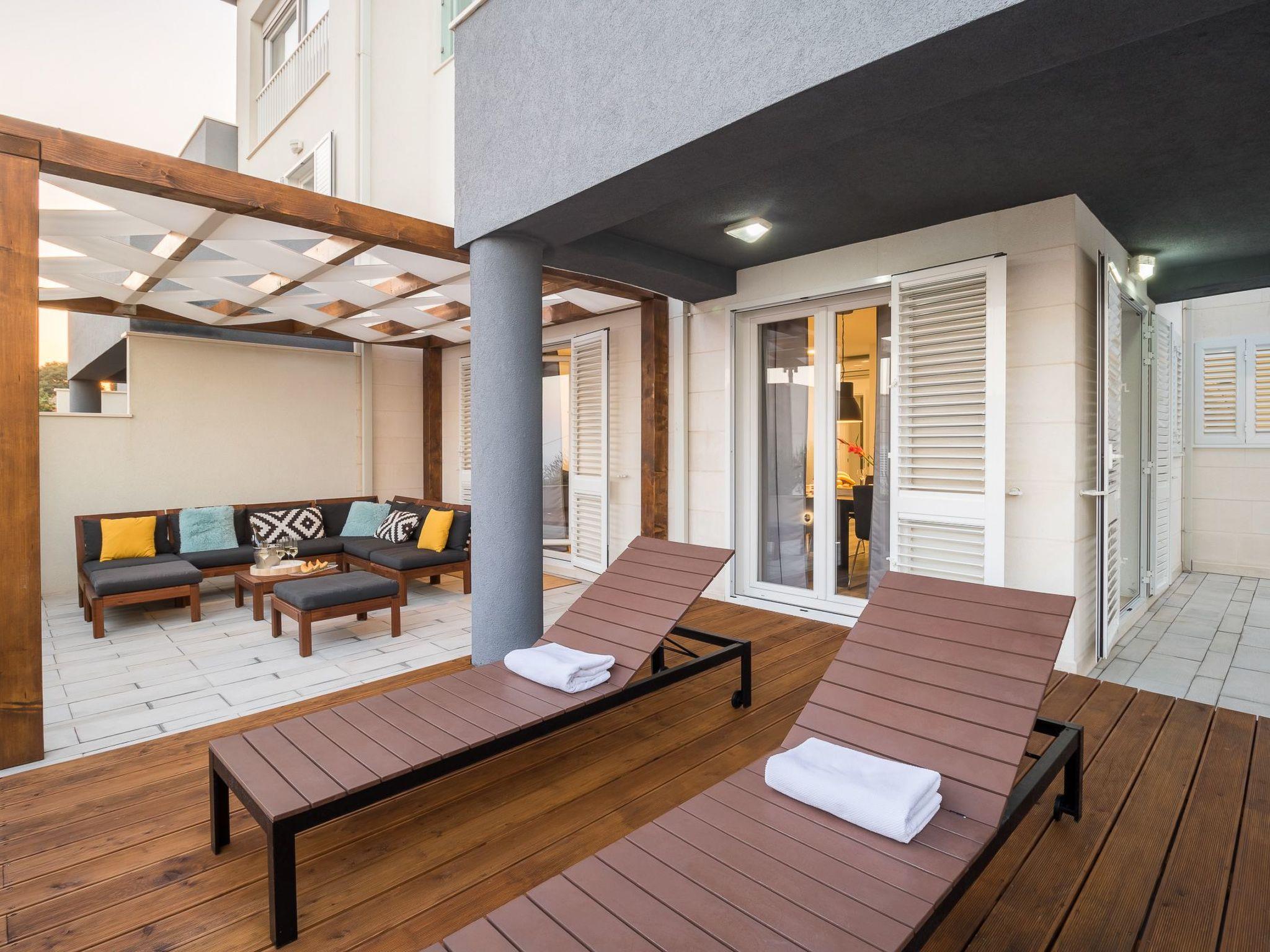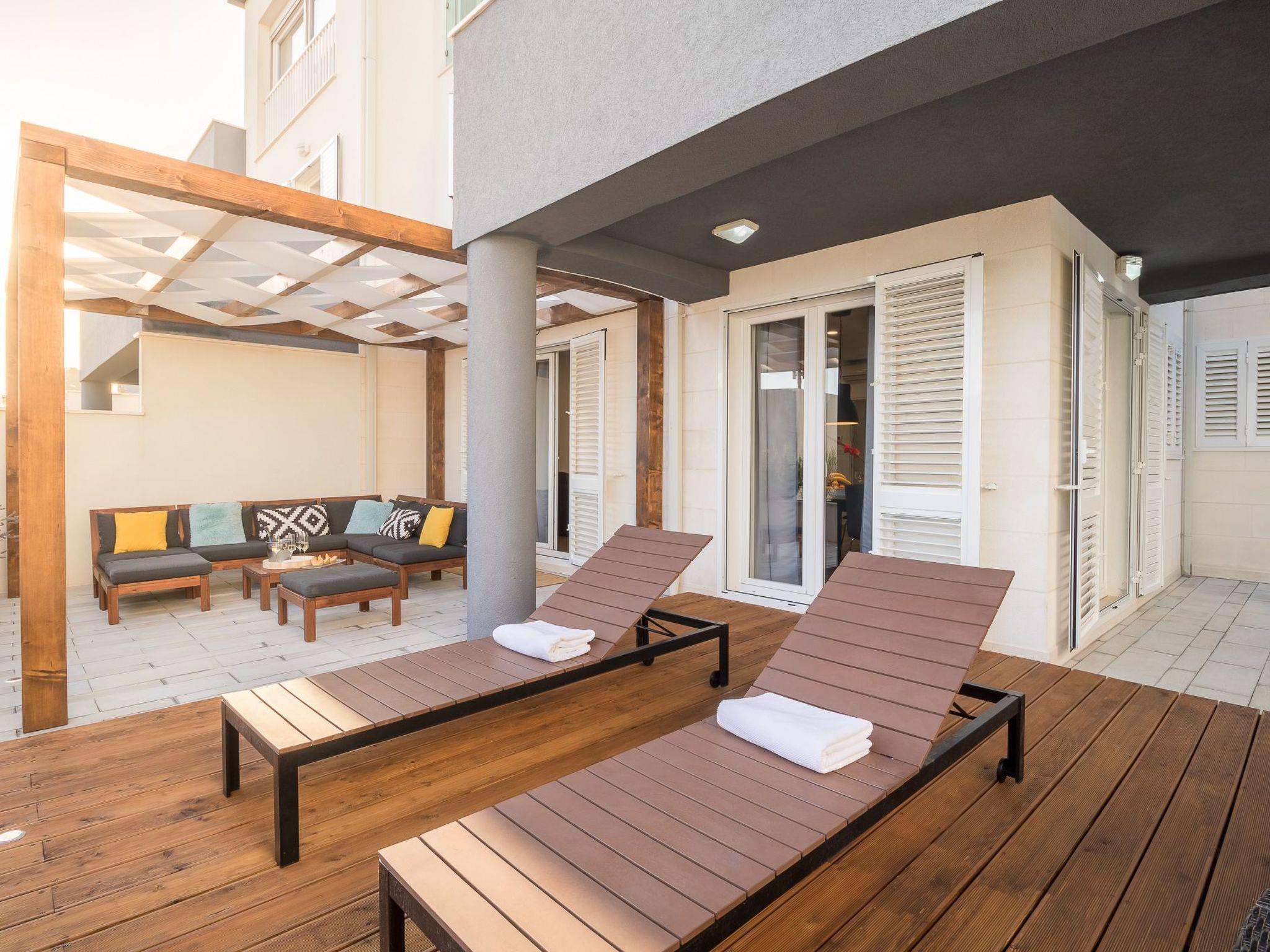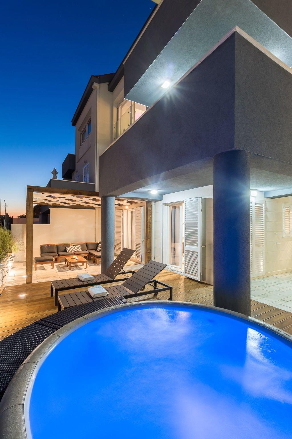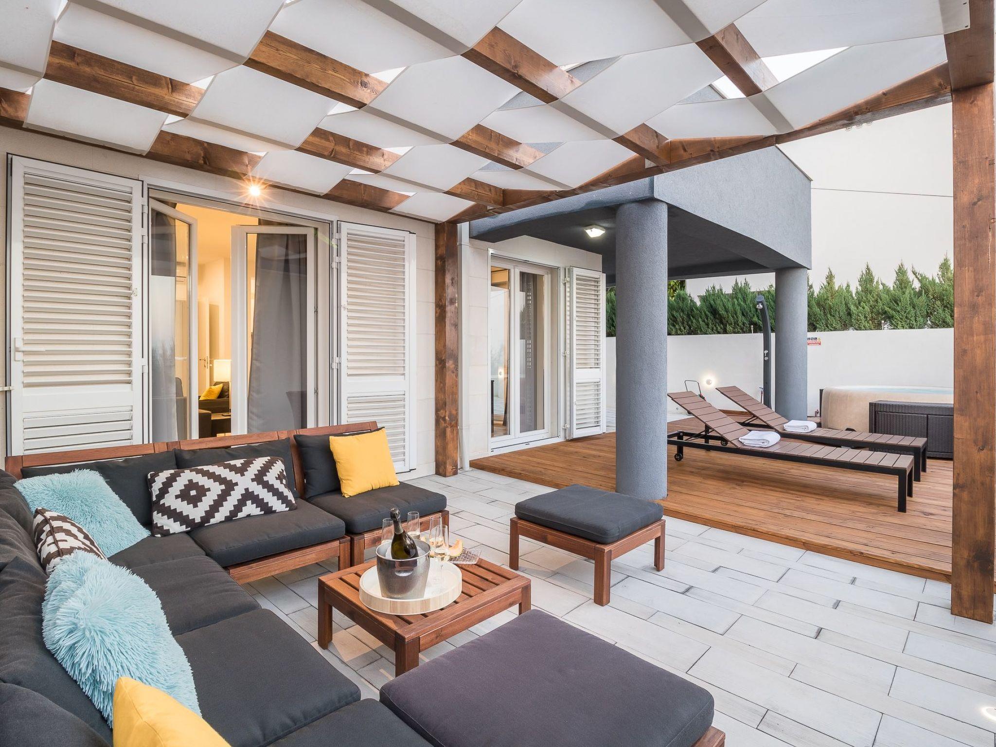 The outdoor area with terrace, comfortable garden furniture and jaccuzi has an area of 120 m².
