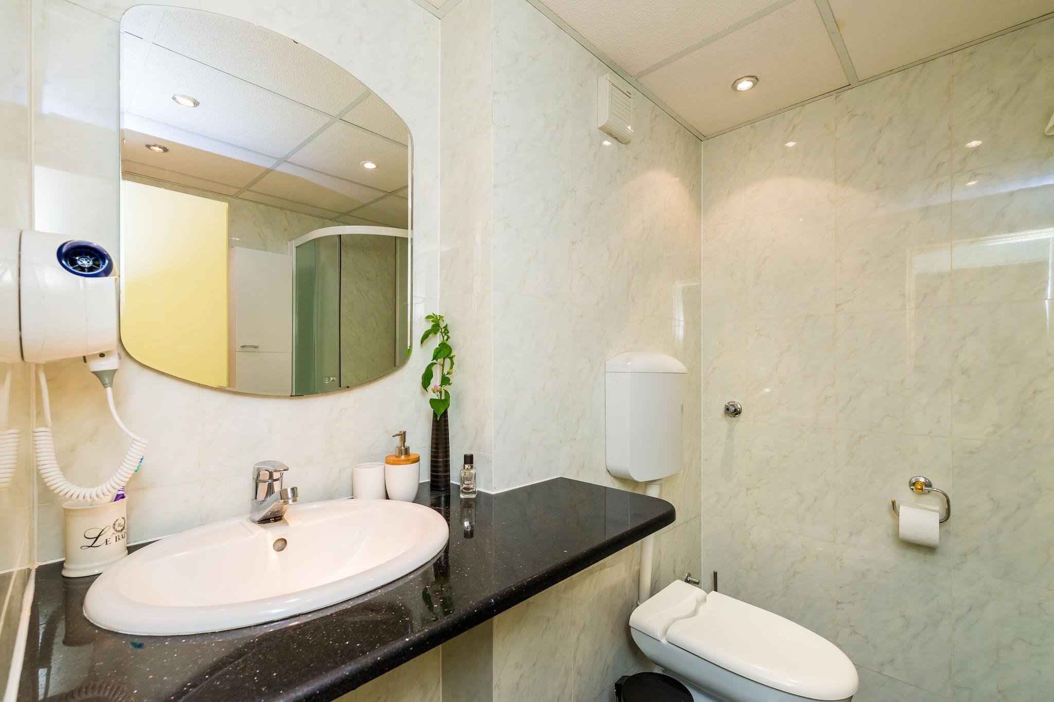 På 2. etage: (Stue(Fjernsyn, sofahjørne), Køkken(kakkelovn, elkedel, brødrister, emhætte, kaffemaskine, mikrobølgeovn, køleskab), Stue/soveværelse(dobbeltsovesofa), soveværelse(dobbeltseng), badeværelse(bruser)) spisestue, toilet, spisebord, vaskemaskine, balkon, klimaanlæg, parking lot(public), strygebræt, strygejern, føntørrer
