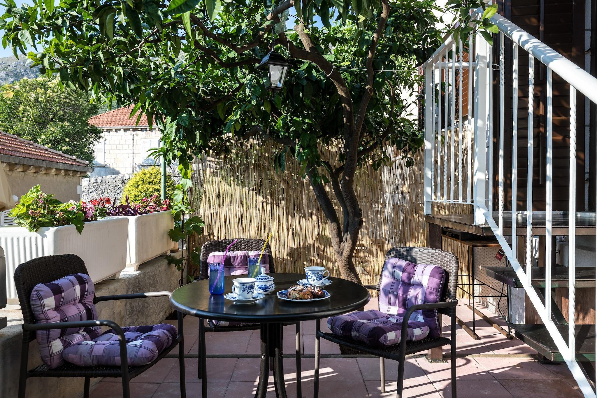 Fantastic place to stay and chill but easy to get to the old city,Lovely property in a quiet part of town but close to buses, It was part of our hostâs home but self-contained with its own private entrance, Spacious and airy bed/,sitting room, separate kitchen and shower room, Shuttered windows help to keep it cool and there is an efficient and quiet air conditioner, It has a small private terrace with table and chairs and sun loungers shaded by a mandarin tree and grapevines, The property was spotlessly clean and there were plenty of towels and storage space, The kitchen had dishes, pans and utensils enough for cooking simple meals as well as a washing machine, There is a small shop nearby selling food, alcohol and toiletries, Ana, our host, made us very welcome, showed us how everything worked and gave us some tips about things to see in the city, Dubrovnik is a hilly city so there are steps everywhere and it was about 10-15 minutes to walk downhill to the walled city, We would definitely stay here again,