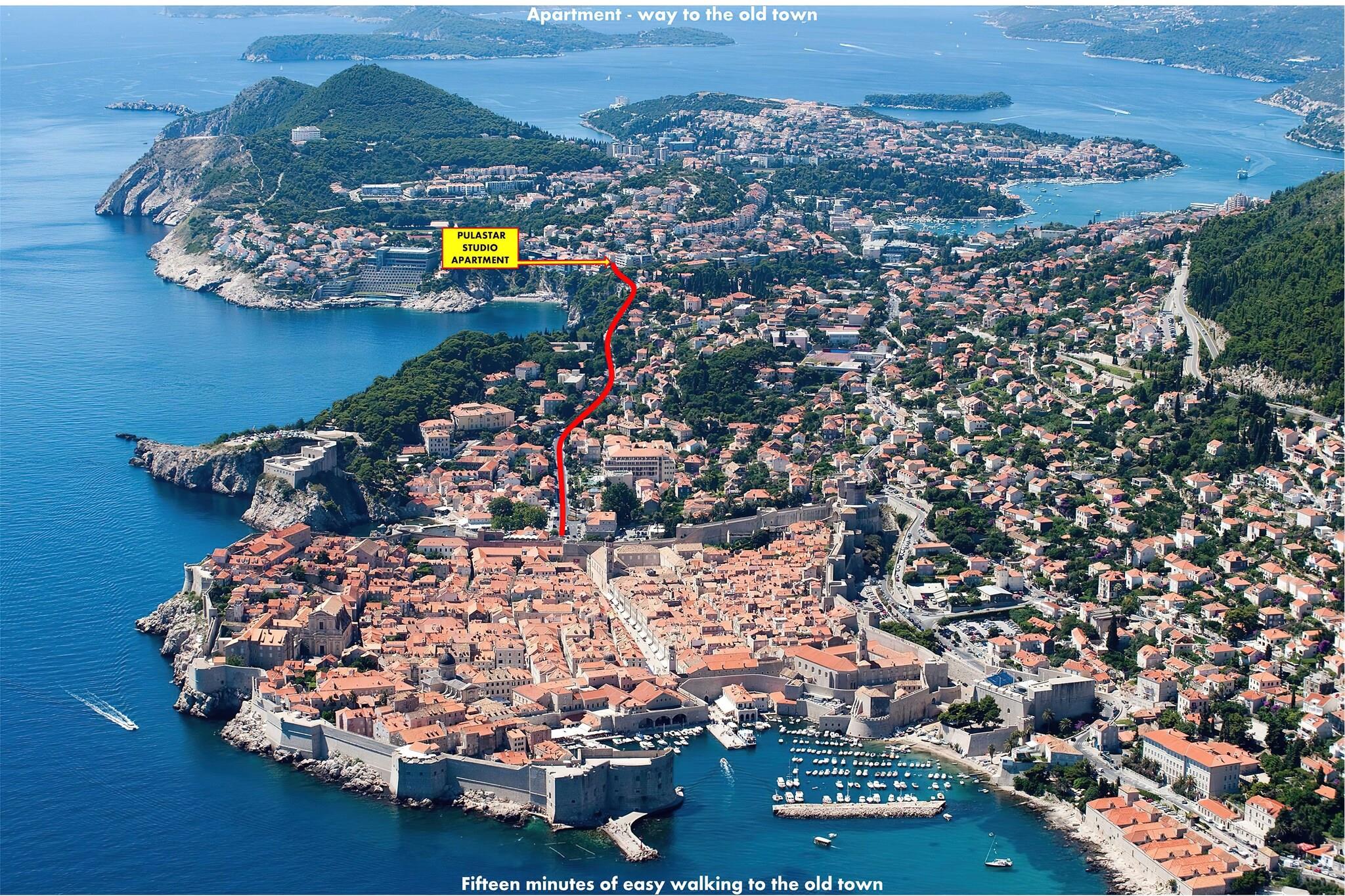 Apartment Pulastar tilbyder indkvartering med egen forplejning beliggende i et roligt område kun 15 minutters gang fra Dubrovniks gamle bydel. Bagageaflevering er muligt både før indtjekning og efter udtjekning. Dette dejlige studie med terrasse er perfekt til op til to personer. Det har gratis WiFi, aircondition og LCD Smart TV samt udstyret køkken (komfur, ovn, køleskab/fryser, espressomaskine, elkedel, brødrister), spisebord og privat badeværelse med bruser og hårtørrer. Der er pengeskab til rådighed. Lejligheden Pulastar ligger i et område, hvor alt hvad man kan få brug for er meget tæt på. Gæsterne kan nå den gamle bydel på mindre end 3 minutters kørsel eller 15 minutters gang. Købmand, busstation, restauranter, barer og caféer kan findes inden for mindre end 100 meters rækkevidde, såvel som bagerier og pengeautomater. Nærmeste strand ""Bellevue"" ligger få minutters gang fra lejligheden.Dubrovnik Busstation og Færgehavnen, der forbinder fastlandet med forskellige dalmatiske øer, ligger 2,4 km fra lejligheden, mens Dubrovnik Lufthavn ligger 21 km derfra.