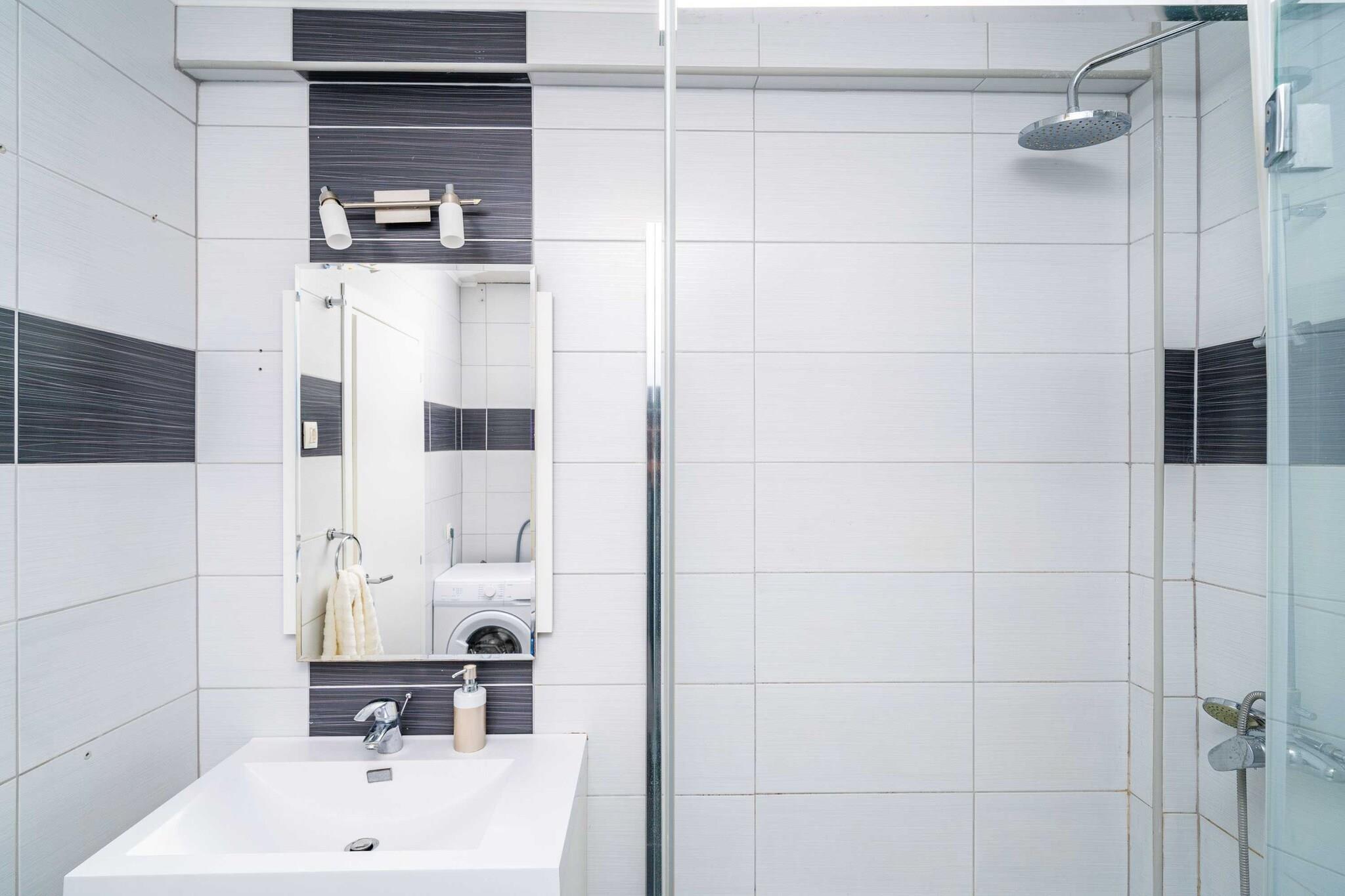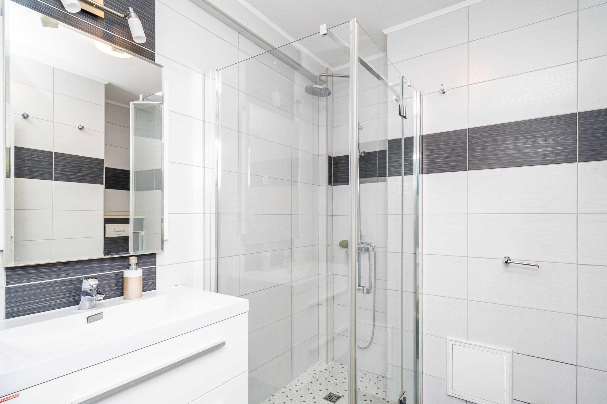 On the 2nd floor: (Kitchen(oven, dishwasher, fridge, freezer, washbasin), Living/bed room(2x single sofa bed, TV, dining table, seating area), bedroom(double bed), bedroom(small double bed), bathroom(shower, washbasin, washing machine)) hood, balcony, air conditioning, ironing board, iron, hairdryer