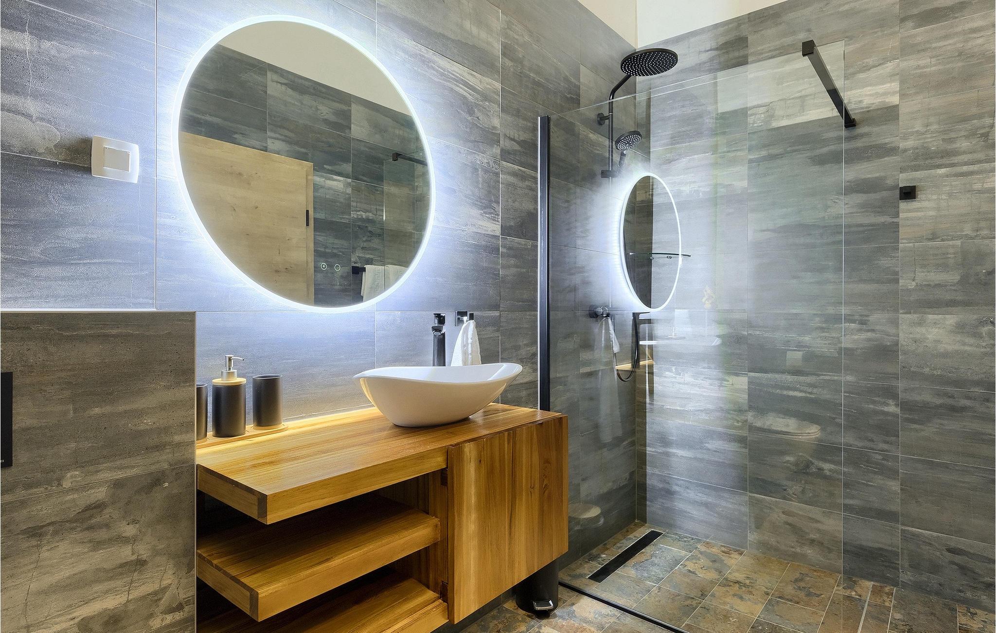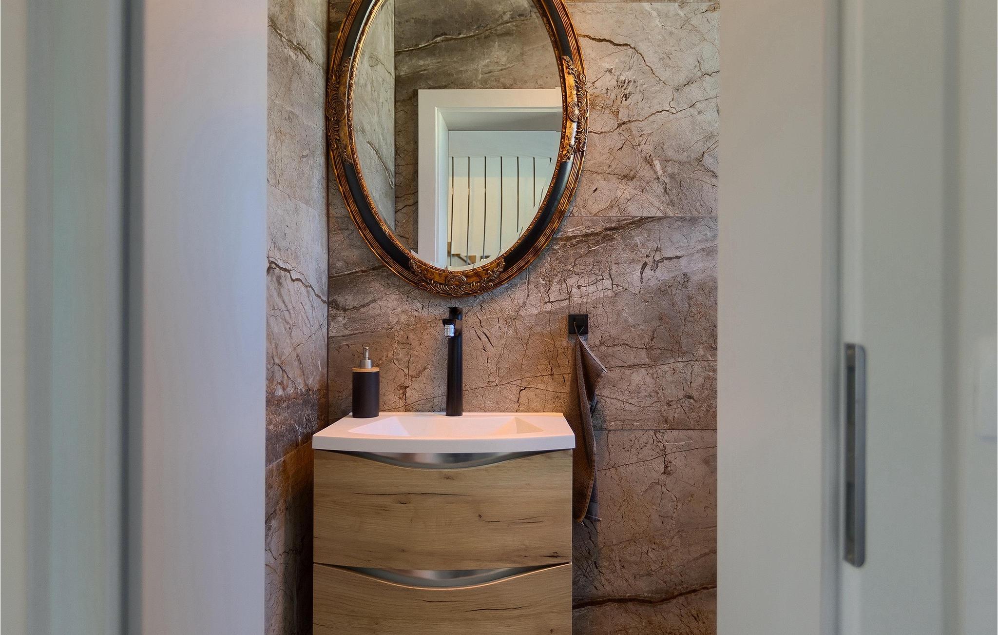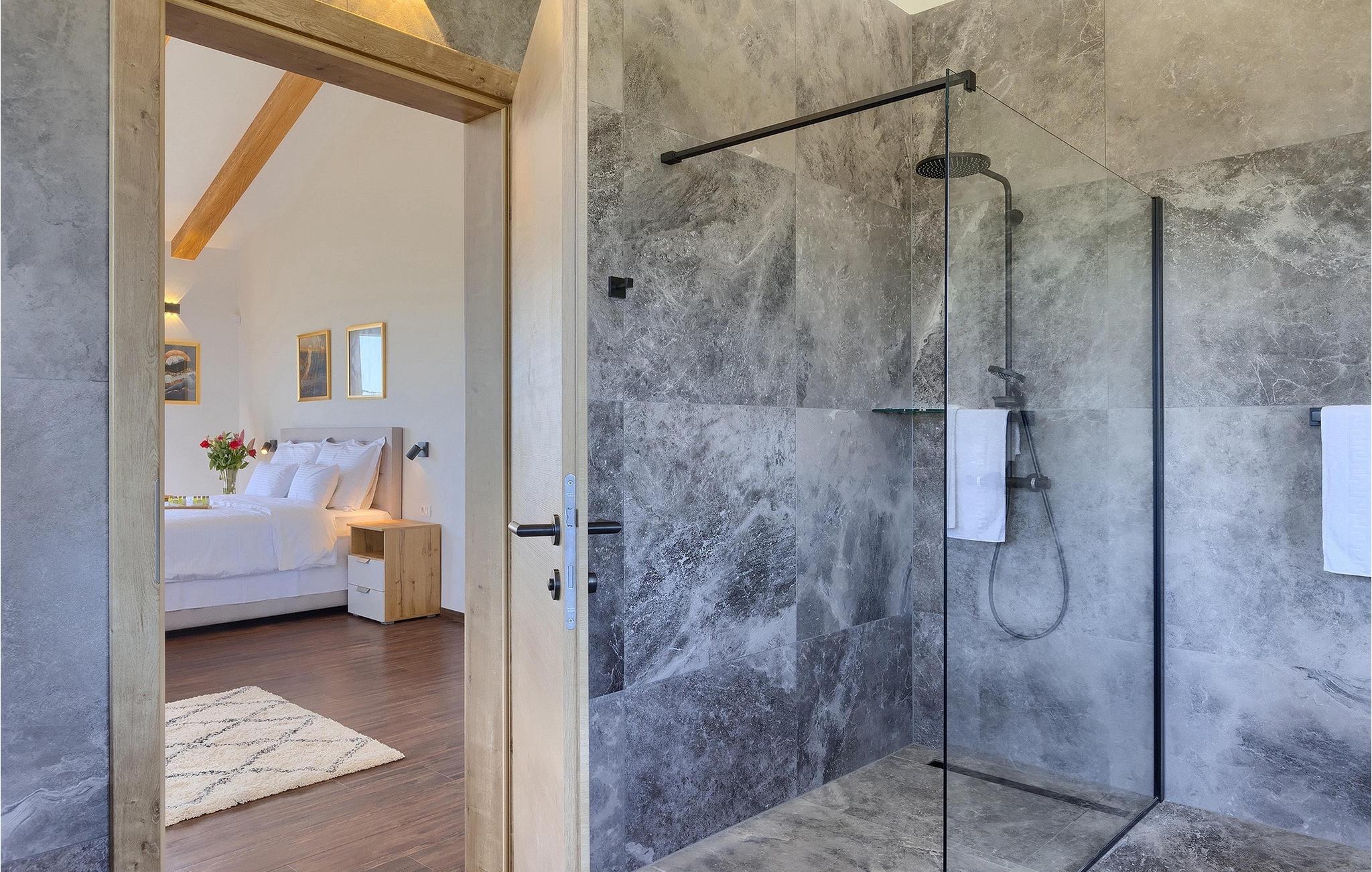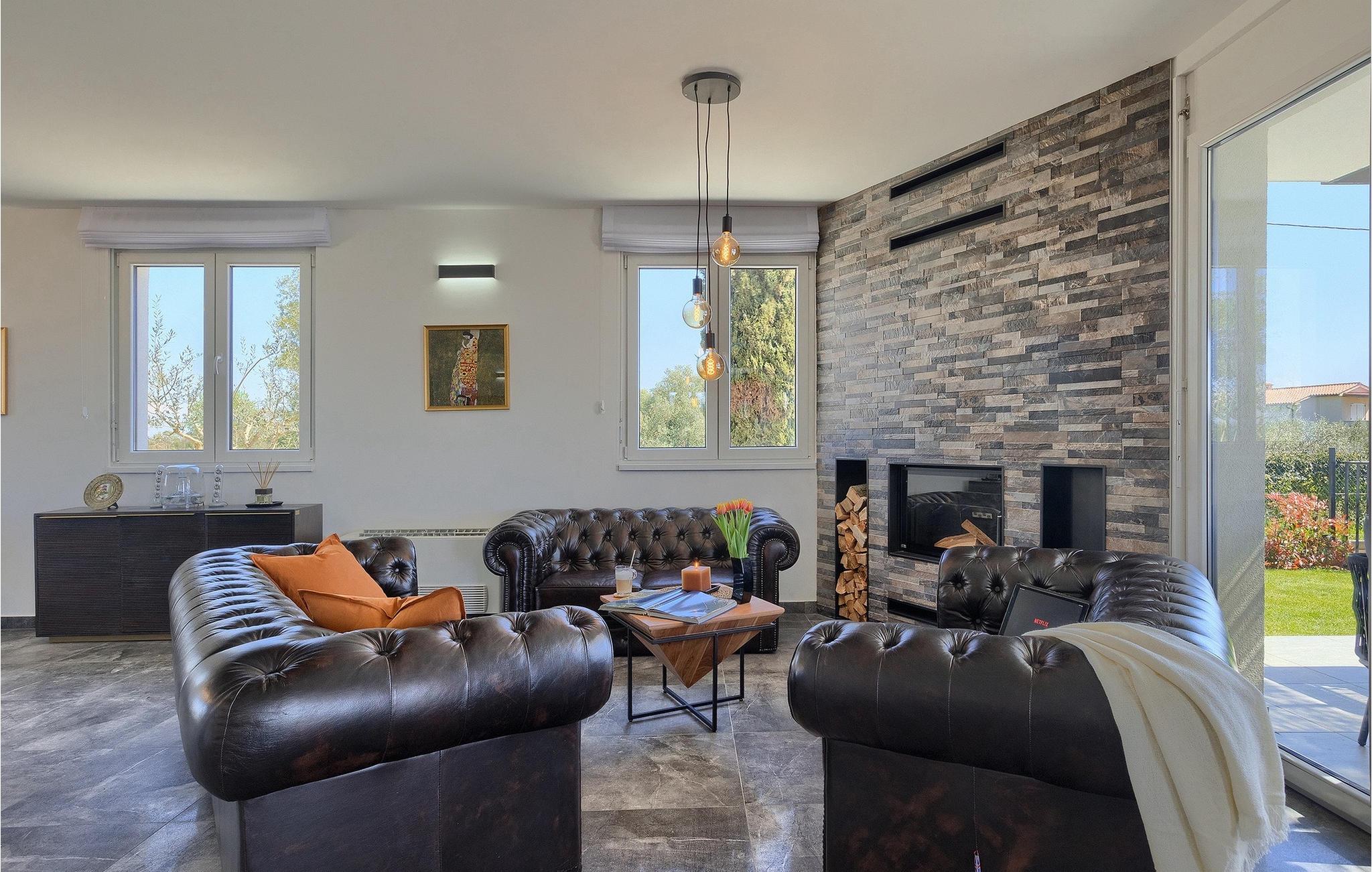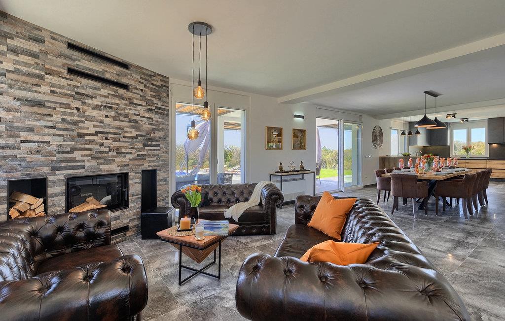 Gå ind i husets indre fra terrassen, som vil forbløffe dig! Det smagfuldt indrettede interiør er moderne og elegant, men der er samtidig sørget for at bevare et stykke tradition. Interessante detaljer og materialer minder om traditionel istrisk konstruktion.