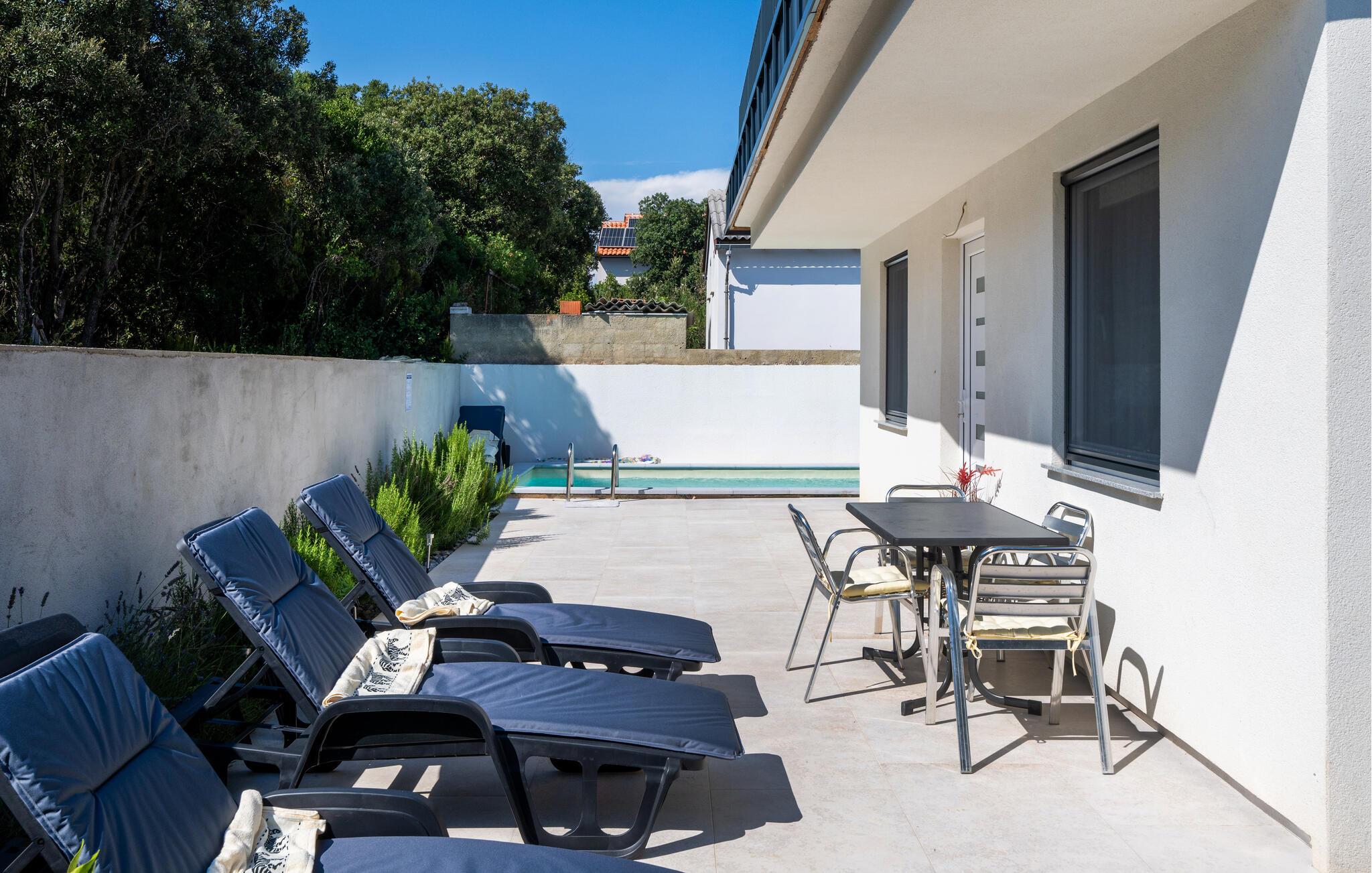 Nyde dette smukke feriehus med swimmingpool, stor terrasse og havudsigt.