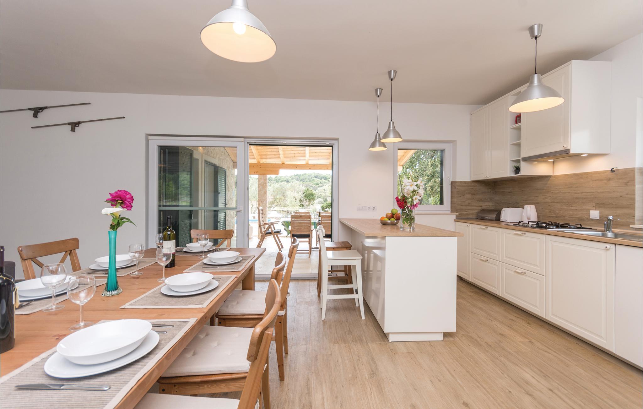 Dette skønne feriehus med pool ligger lige ud til havet, på en indhegnet og frodig grund. Nærmeste nabo ligger ca. 20 m væk. Huset rummer fem soveværelser, køkken og spisestue og er et rent ferieparadis, til alle, der gerne vil slappe af og glemme alle hverdagens problemer. Nyd at bo tæt på havet og i komfortable omgivelser. Dugi Otok er en af de skønneste øer i Adriaterhavet. Sandstranden Sakarun, som indbyder til en dejlig badedag, ligger kun ca. 1,8 km fra huset. Besøg også naturparken Telašcica med unik flora og fauna. Gå på opdagelse og find jeres helt egen fredelige badebugt.