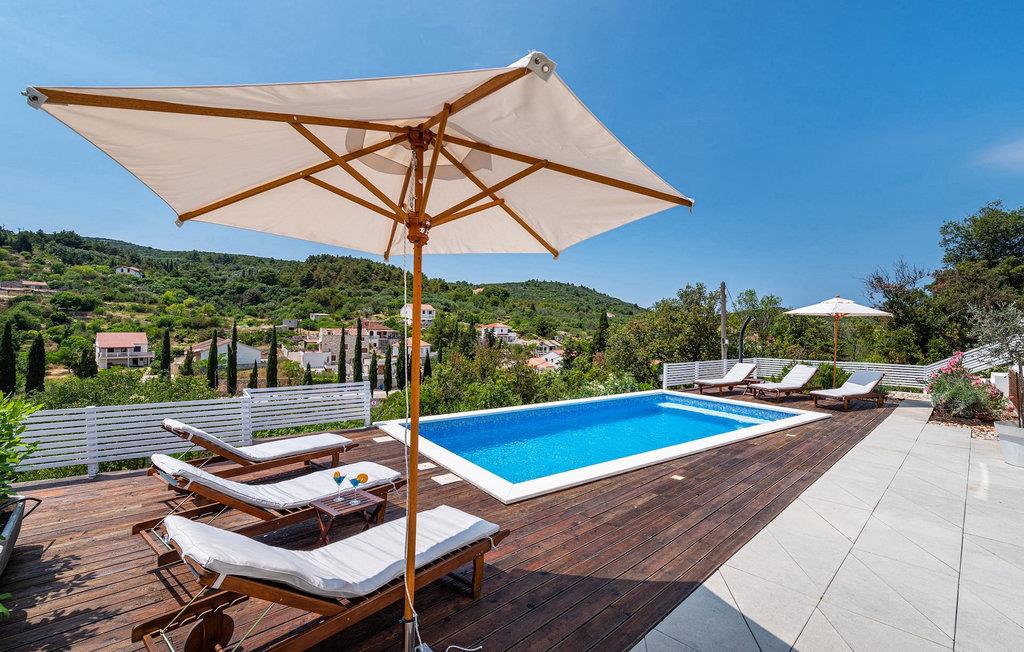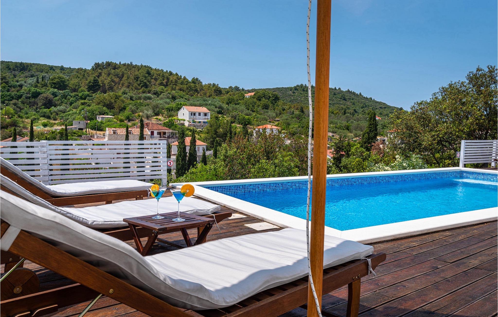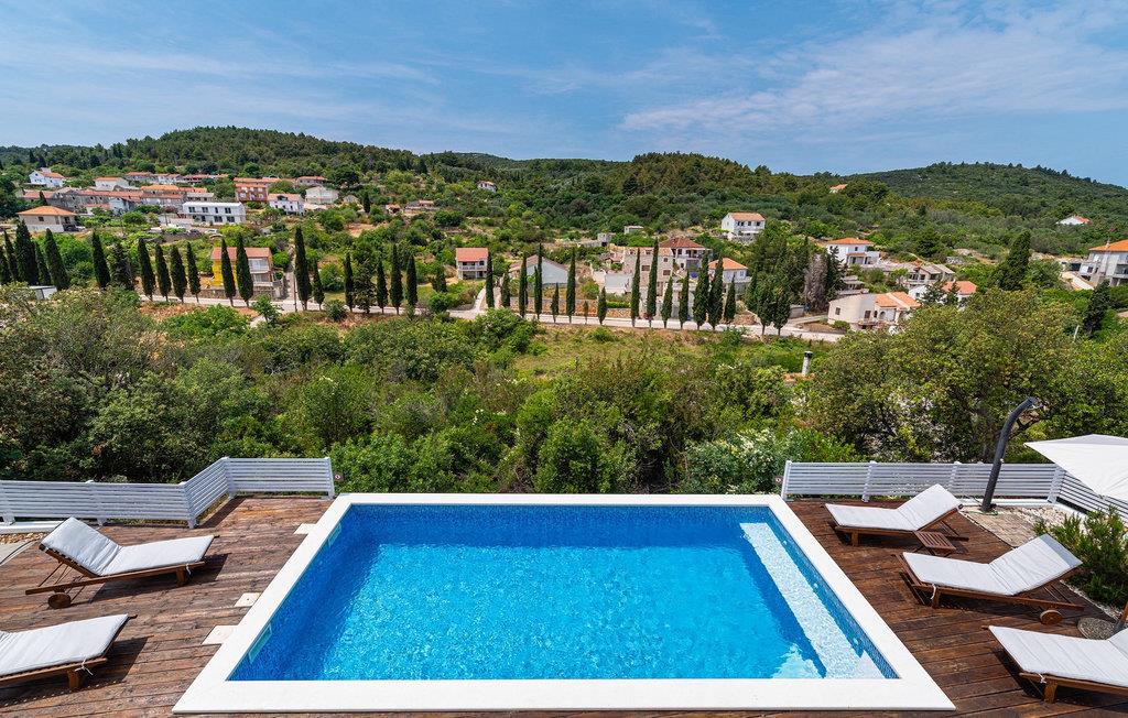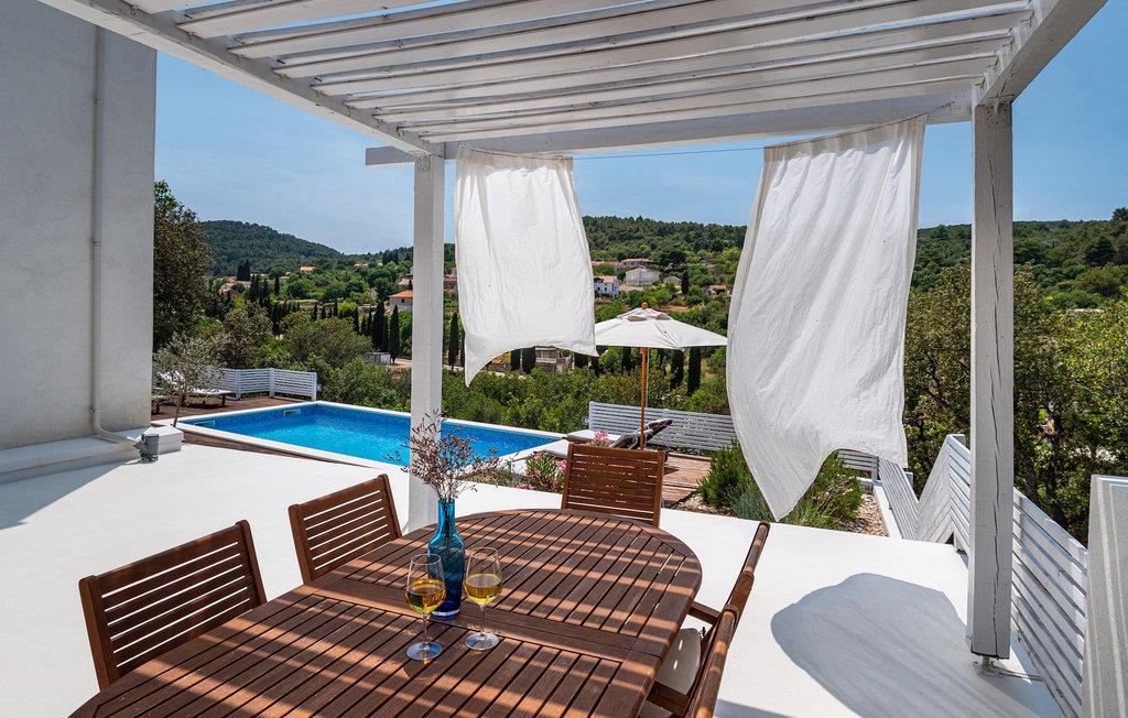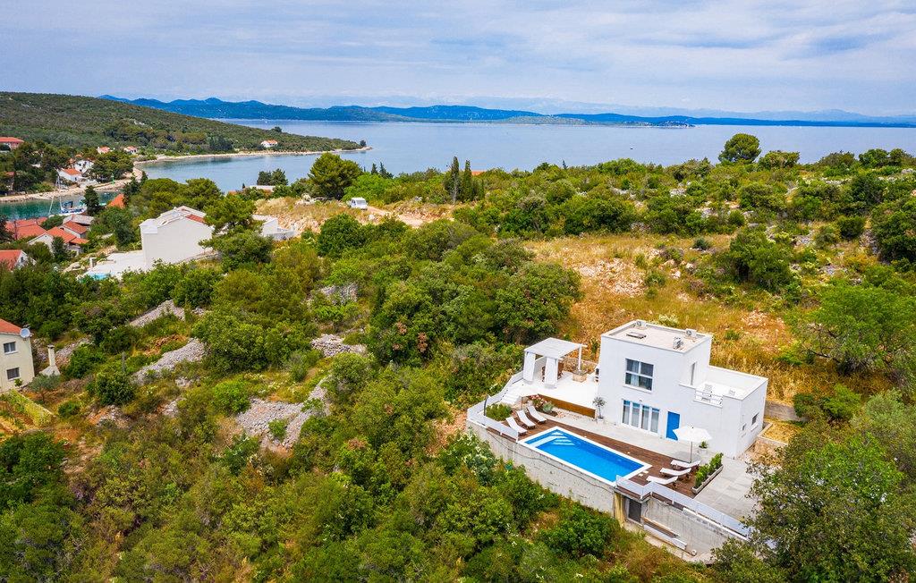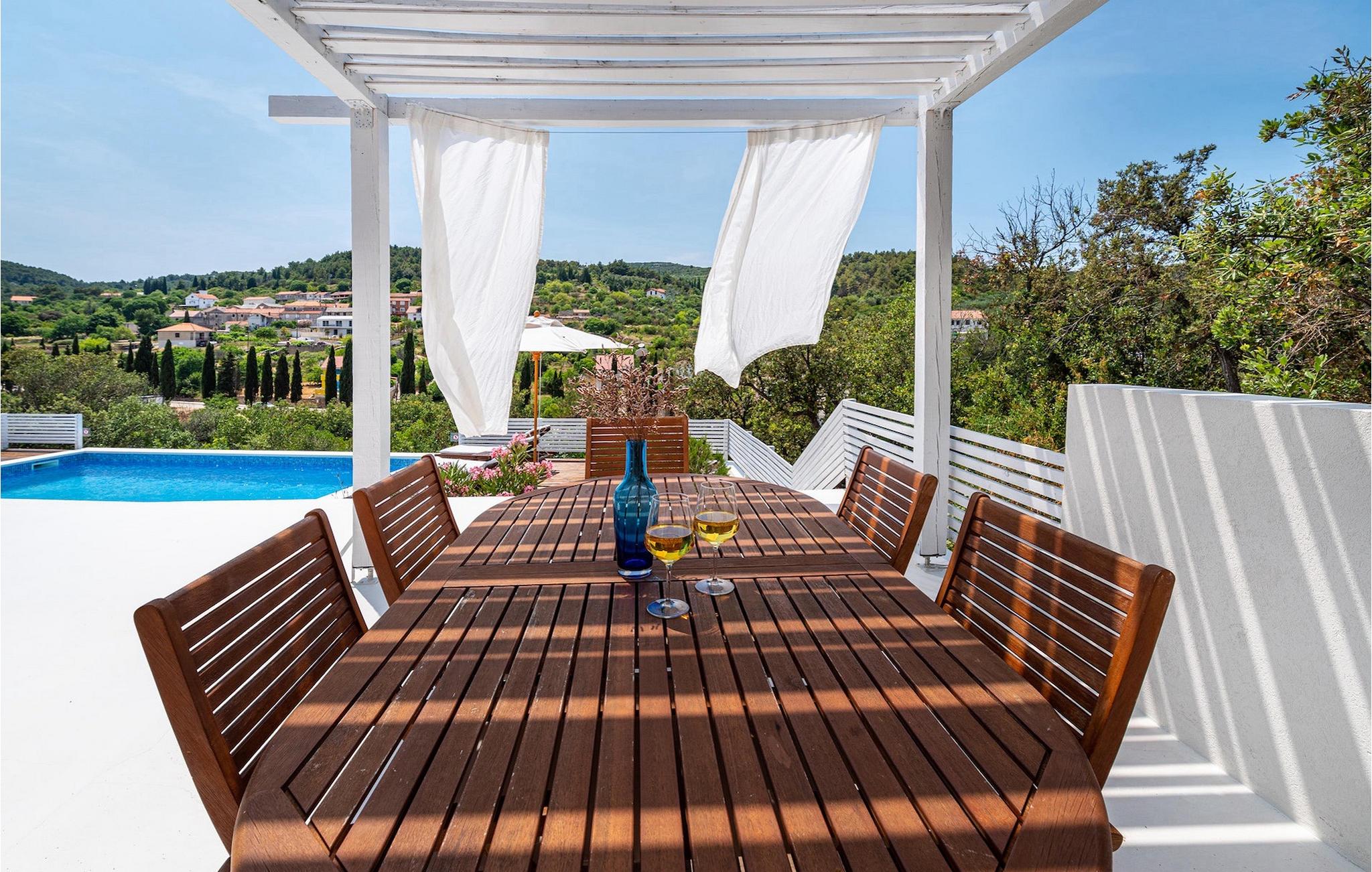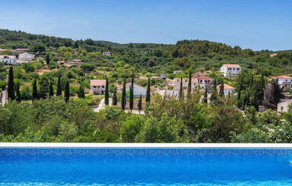 Beliggende i udkanten af den lille fiskerlandsby Zman, omgivet af natur, tilbyder denne drømmevilla alt, hvad du kan ønske dig til en afslappende ferie. Fra den 32m2 store, forfriskende pool er der en vidunderlig udsigt over dalen. God fornøjelse med en kølig drink i hånden, slap af på en af liggestolene og lad tankerne vandre. Den store terrasse med spisebord og kulgrillen er det perfekte sted til lange sommeraftener med frisk grillet fisk og andre lokale specialiteter.