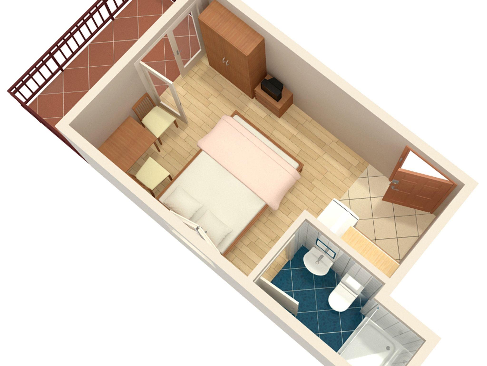 Studio bietet Platz für 2 Gäste. Die Betten sind in Schlafzimmern, die es 1 gibt, innerhalb einer Gesamtfläche von 16m2, angeordnet. Die Gäste haben eine eigene Terrasse zur Verfügung, auf der sie in warmen Sommernächten genießen können. Das Studio-Apartment bietet Meerblick. Es ist erlaubt, Speisen auf dem Gemeinschafts-Grill vorzubereiten. IM PREIS INBEGRIFFEN: Kurtaxe, Endreinigung, Klimatisierung, Parkplatz, Internet. VERBINDLICHE ZUSÄTZLICHE KOSTEN: Aufzahlung für Kurzaufenthalte (prozentualer Zuschlag pro Nächtigungsanzahl: 30% - 1, 20% - 2, 10% - 3). Die Verfügbarkeit zusätzlicher Dienstleistungen in Ihrem reservierten Termin und die Preise derselben (falls nicht aufgeführt) müssen im Voraus überprüft werden. Zusätzliche Dienstleistungen die in der Zahlungsaufforderung nicht aufgeführt sind werden direkt beim Vermieter bezahlt, angenommen der Gast nutzt auch diese.