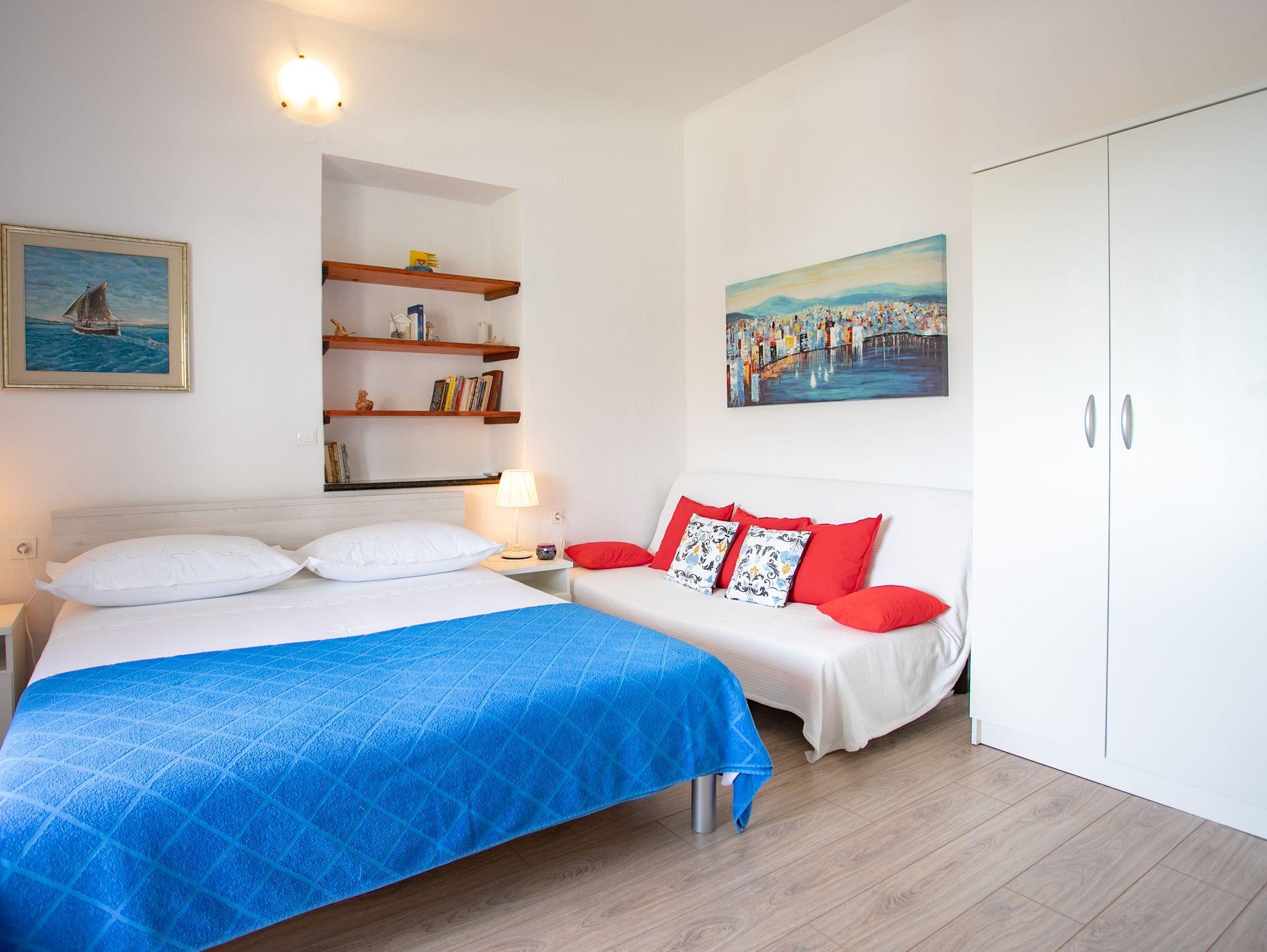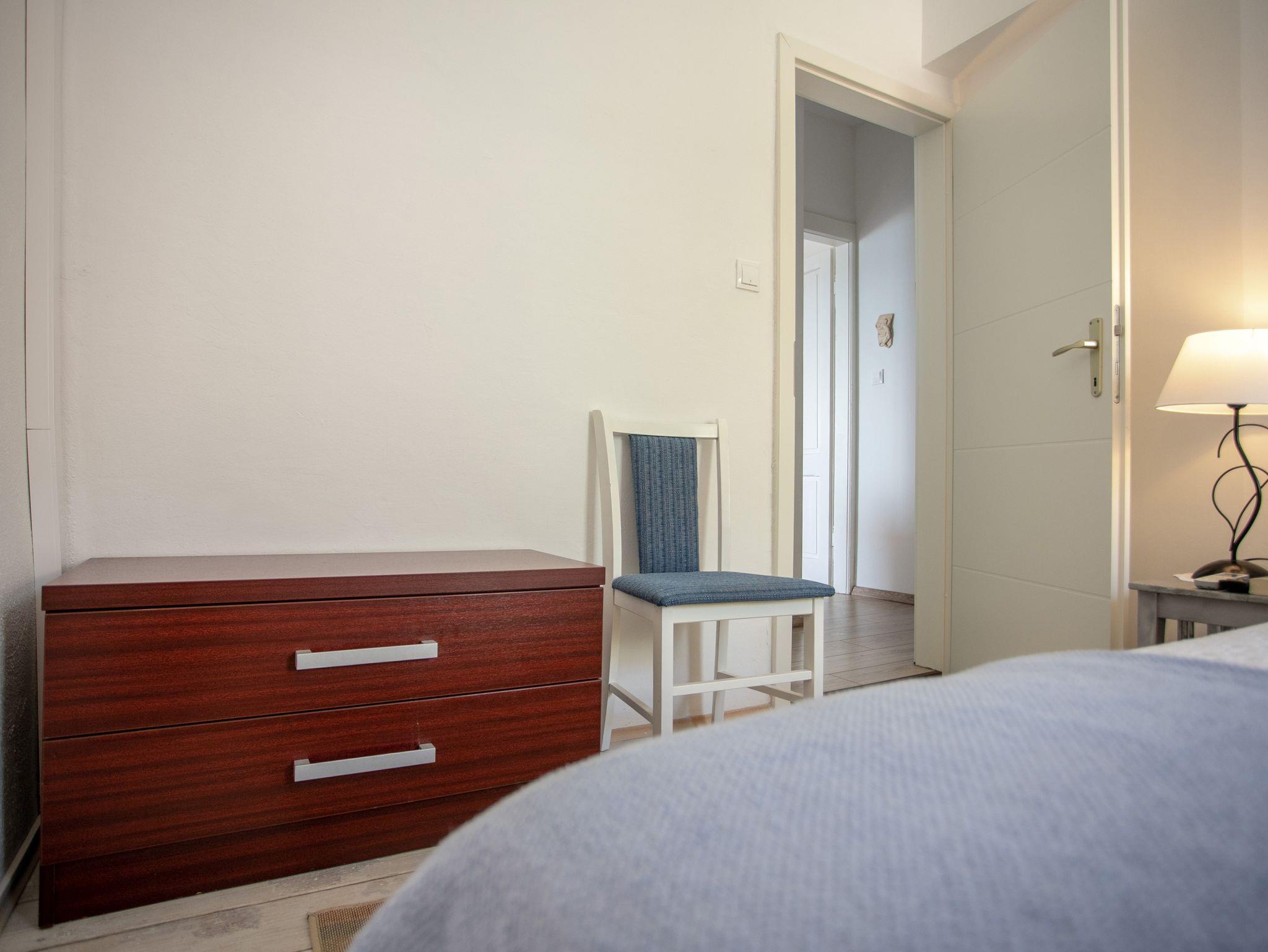 Ferienwohnung bietet Platz für 6 Gäste. Die Betten sind in Schlafzimmern, die es 3 gibt, innerhalb einer Gesamtfläche von 85m2, angeordnet. Die Gäste haben eine eigene Terrasse zur Verfügung, auf der sie in warmen Sommernächten genießen können. Das Apartment bietet Meerblick. Es ist erlaubt, Speisen auf dem Gemeinschafts-Grill vorzubereiten. Durch die Terrasse der gebuchten Unterkunftseinheit gehen auch andere Gäste oder Vermieter. Unterkunftseinheit hat Räume, die von dem Rest der Einheit abgetrennt werden. IM PREIS INBEGRIFFEN: Kurtaxe, Endreinigung, Klimatisierung, Parkplatz, Internet, Kinderbett, Bügeleisen, Bügelbrett, Föhn, tragbarer Grill, Sonnenschirm, Liegestühle, 1 Bett für Kinder (im Preis enthalten). Die Verfügbarkeit zusätzlicher Dienstleistungen in Ihrem reservierten Termin und die Preise derselben (falls nicht aufgeführt) müssen im Voraus überprüft werden. Zusätzliche Dienstleistungen die in der Zahlungsaufforderung nicht aufgeführt sind werden direkt beim Vermieter bezahlt, angenommen der Gast nutzt auch diese.