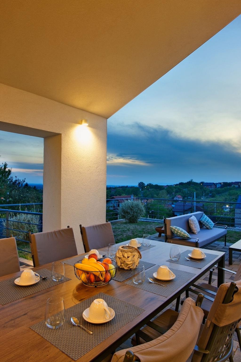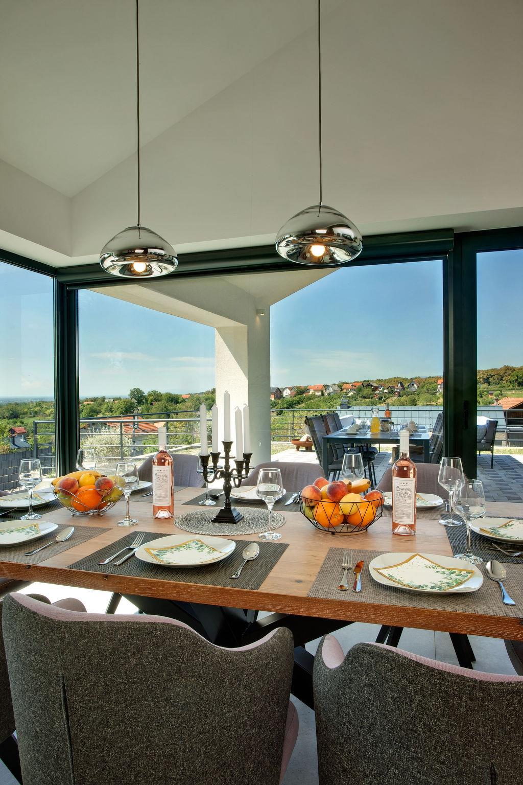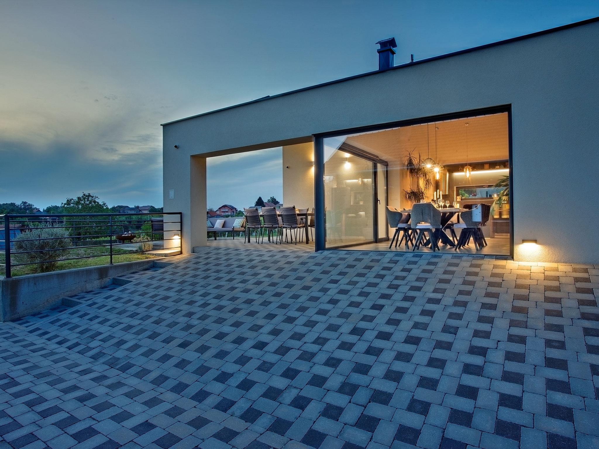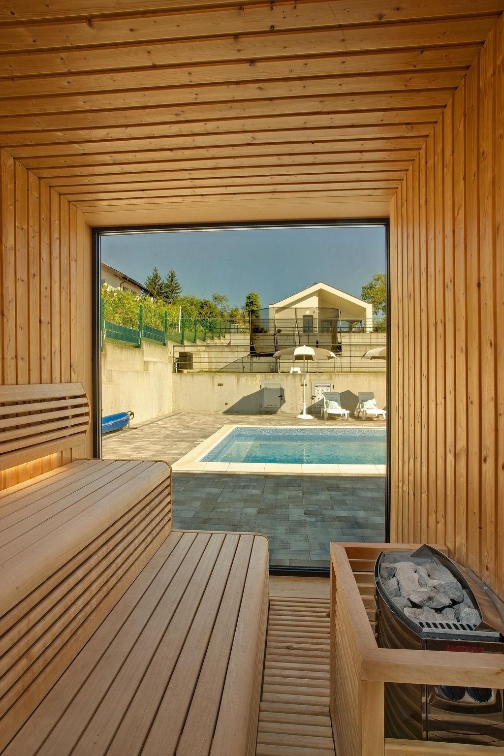Dugo Selo 30 km from zagreb: Single-family house "Das Klet". 2.5 km from the centre of Dugo Selo. Private: property 1'250 m2 (fenced), lawn, swimming pool angular (6 x 8 m, 48 m2, depth 100 - 140 cm, seasonal availability: 01.May. - 31.Sep.) with shutter cover. Pool house with shower and WC, terrace (40 m2), barbecue. In the house: internet access, sauna, washing machine, tumble dryer. Parking at the house on the premises. E-charging station. Restaurant 1 km, bus stop 2 km.