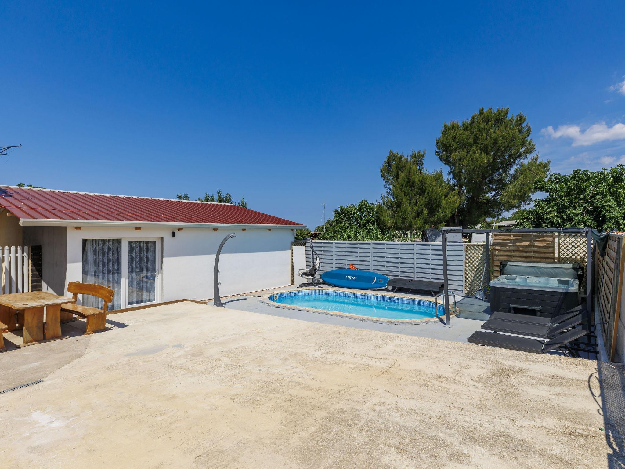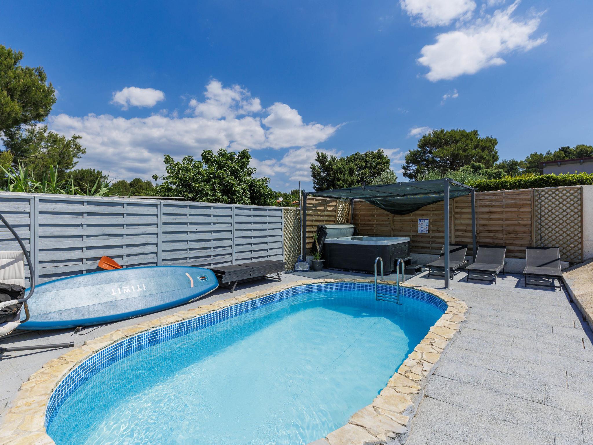 2-family house "Sabo". 1.7 km from the centre of Peroj, 3 km from the centre of Fažana, 8 km from the centre of Vodnjan, in a sunny position, 300 m from the sea, 300 m from the beach. For shared use: property 150 m2 (fenced), swimming pool angular (5 x 3 m, depth 140 cm, seasonal availability: 01.Apr. - 01.Nov.) with internal staircase. Outdoor shower. In the house: internet access. Motor access (500 m via unmade road). Parking at the house on the premises. Shop 1 km, supermarket 3 km, restaurant 1.5 km, bus stop 900 m, pebble beach 1 km, rocky beach 300 m. Please note: the owner lives on the same property. The owner has a dog.