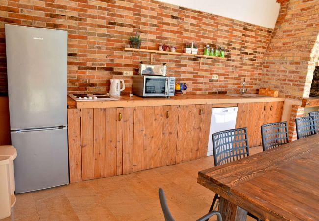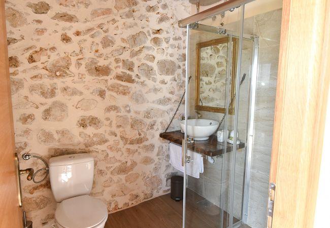 On the ground floor of the house there is a living/dining room with kitchen, two bedrooms (one with twin beds, the other with a double bed) and a bathroom with shower. From the living/dining room there is access to the terrace of the house and the swimming pool.