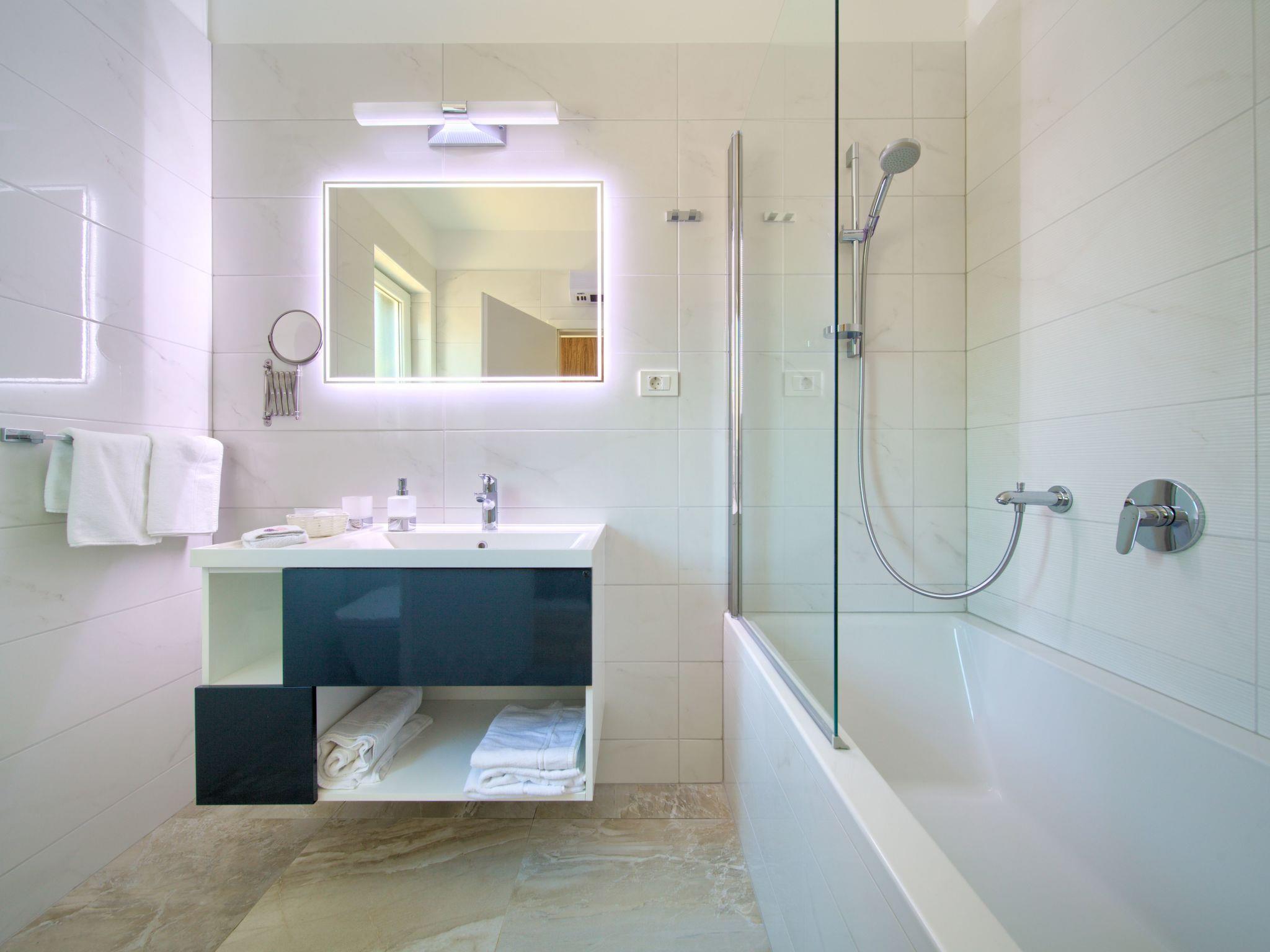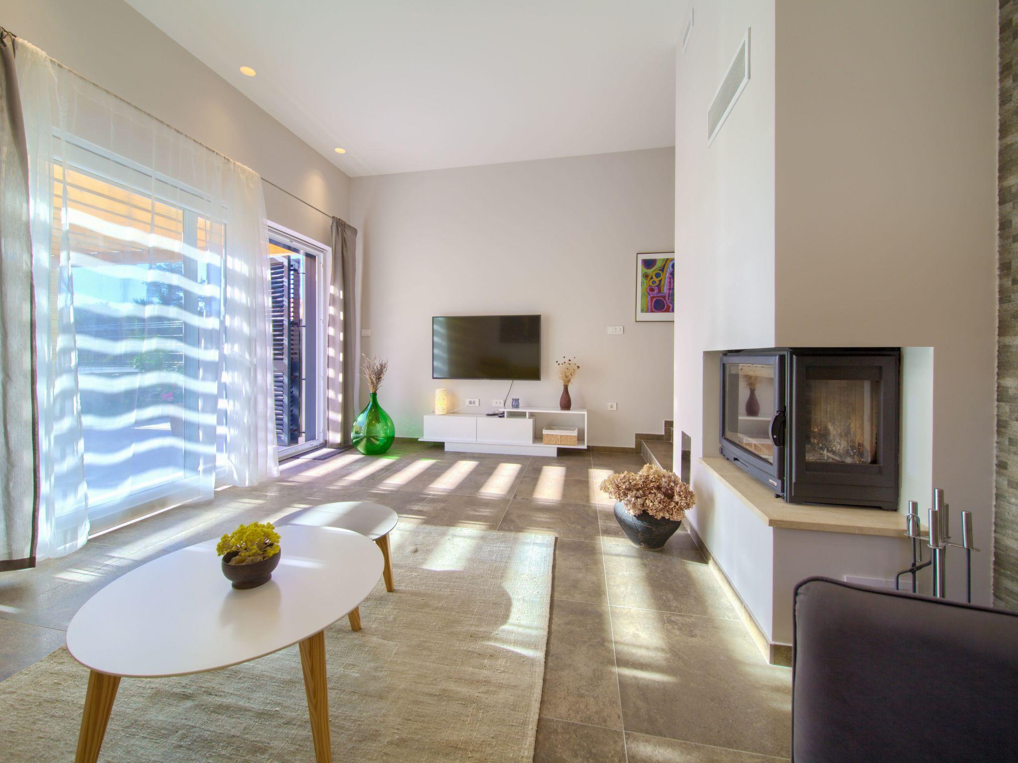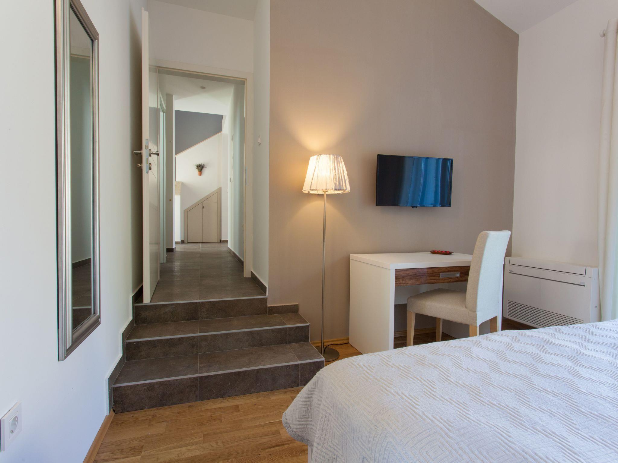 On the ground floor of the villa there is a spacious living room, fully equipped kitchen (microwave, dishwasher, deep freezer), one bedroom with bathroom and separate bathroom. Next to the living room is a terrace with a sitting set. On the ground floor there are two rooms, each with its own bathroom, air conditioning and television. The villa has a sofa bed in the space between the two rooms.