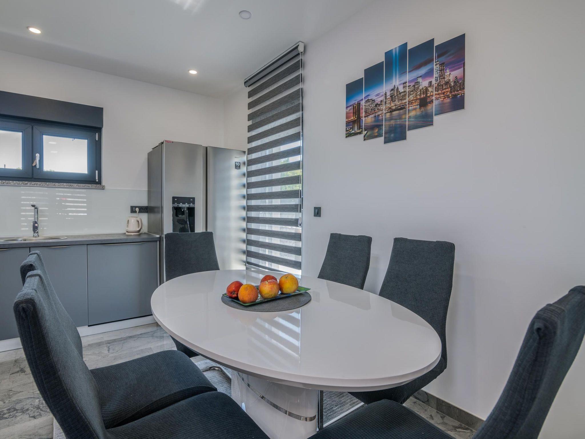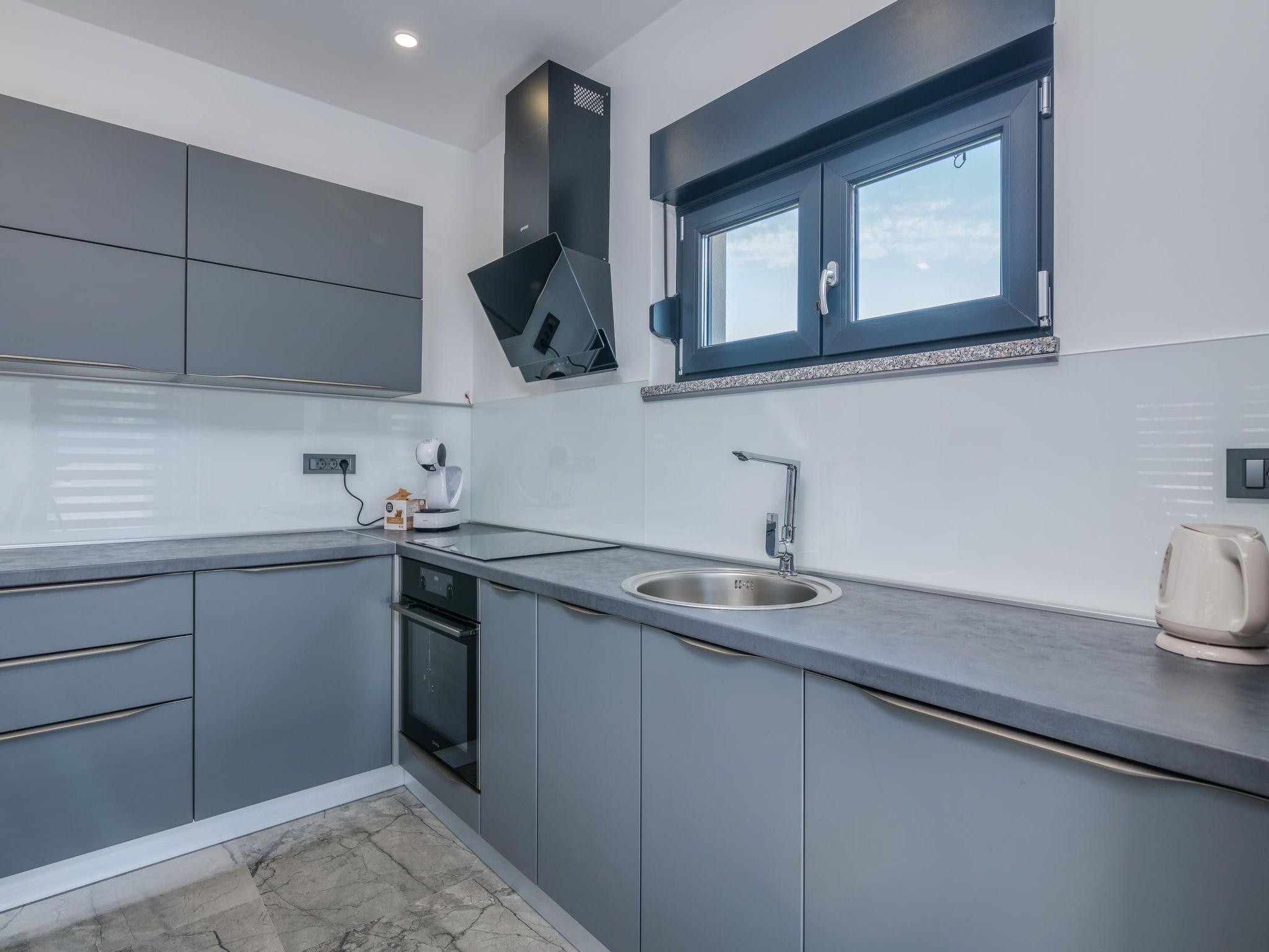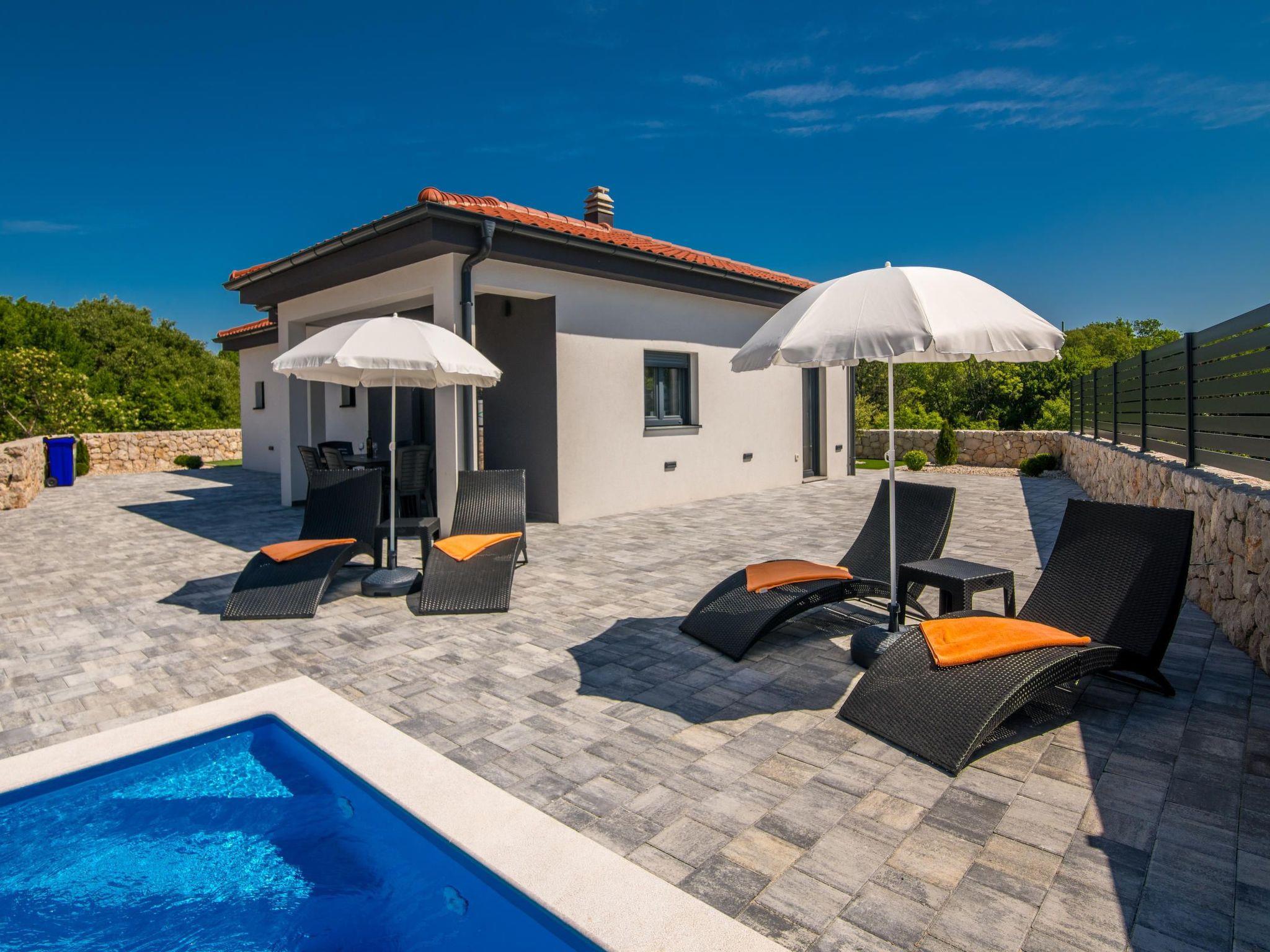 Villa Enie, a newly built, modern villa in Garica near Vrbnik has its own swimming pool and can host up to six people. It is located just a few minutes' drive from the beautiful town of Krk, where you can visit the old town and beautiful beaches, and from Vrbnik, which is famous for its local wines and local souvenir shops. Villa Enie is located entirely on the ground floor and has a wonderful view of the greenery and the forest, which you will enjoy most while drinking your morning coffee in this peaceful environment. The house consists of a spacious kitchen with dining room and living room, two double bedrooms, one single room, and two complete bathrooms with shower. There is also a covered terrace overlooking the pool. In the courtyard of Villa Enie there is a private swimming pool and an area with deckchairs, as well as an outdoor shower and barbecue. Villa Enie is air-conditioned, has WiFi and private parking for several cars.