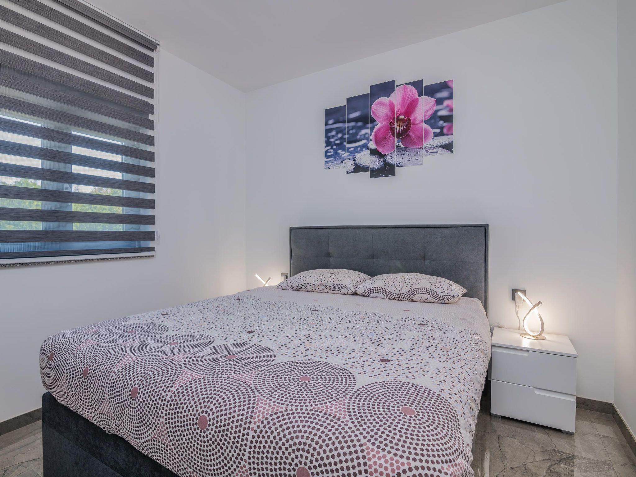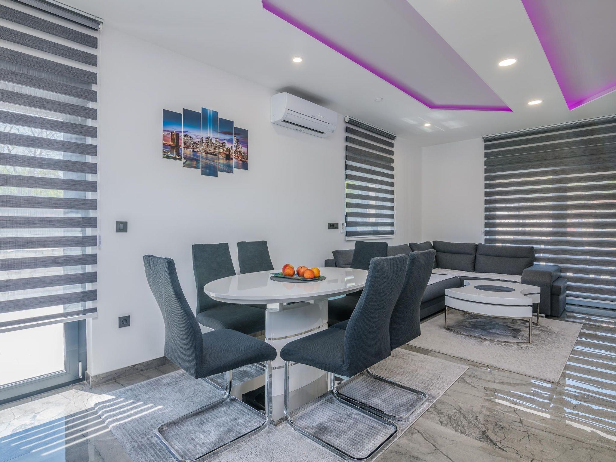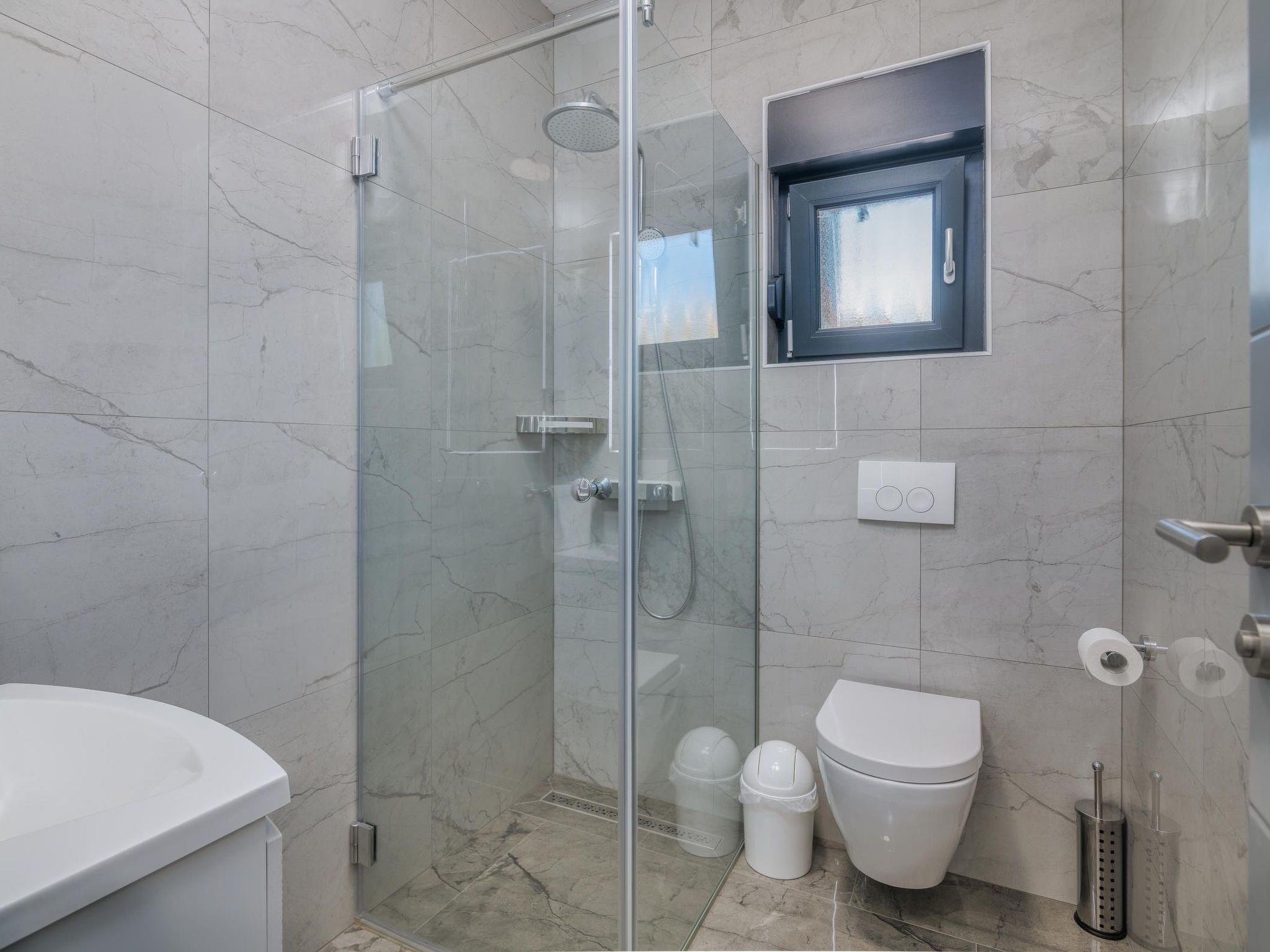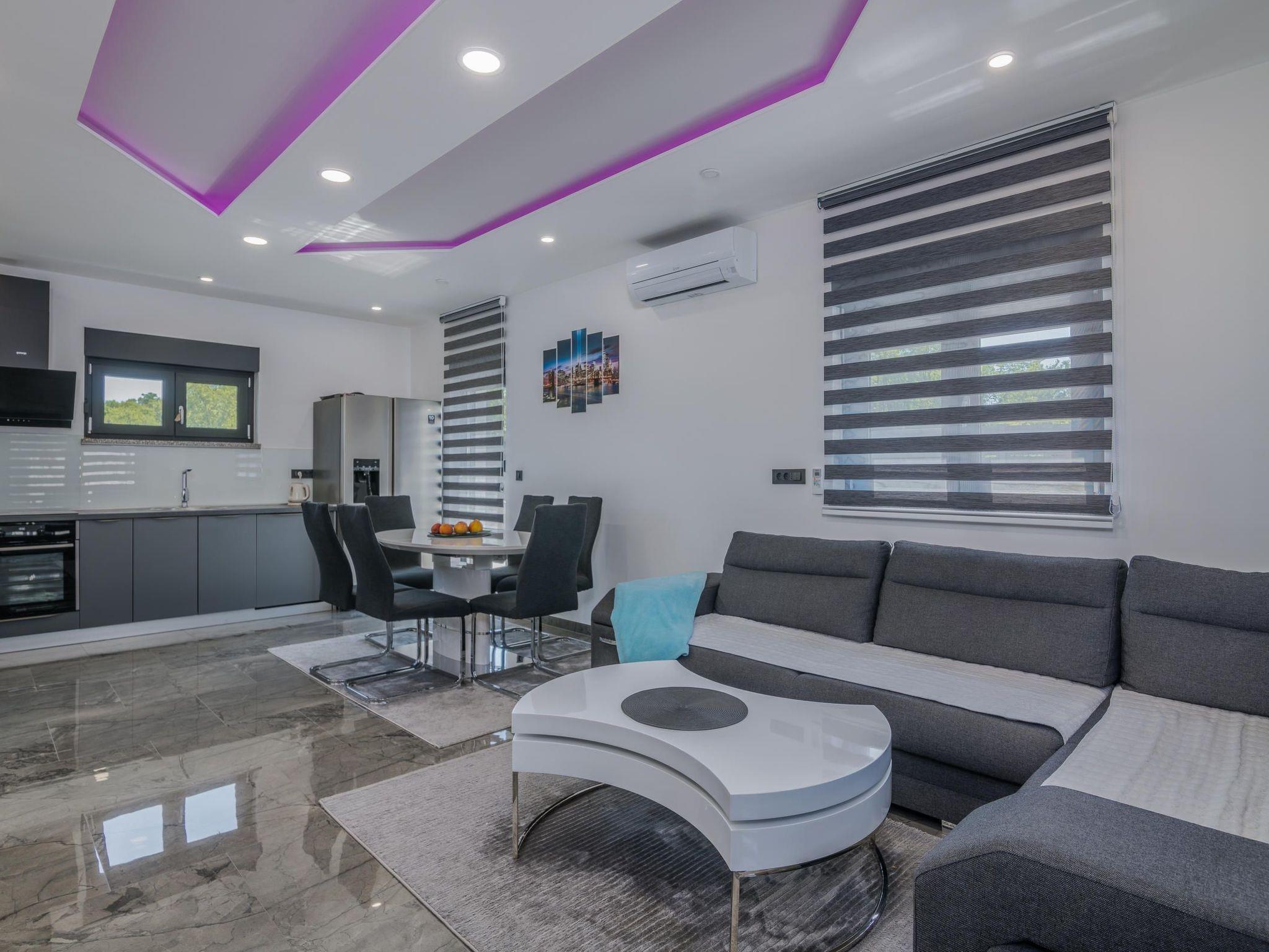 Villa Enie, a newly built, modern villa in Garica near Vrbnik has its own swimming pool and can host up to six people. It is located just a few minutes' drive from the beautiful town of Krk, where you can visit the old town and beautiful beaches, and from Vrbnik, which is famous for its local wines and local souvenir shops. Villa Enie is located entirely on the ground floor and has a wonderful view of the greenery and the forest, which you will enjoy most while drinking your morning coffee in this peaceful environment. The house consists of a spacious kitchen with dining room and living room, two double bedrooms, one single room, and two complete bathrooms with shower. There is also a covered terrace overlooking the pool. In the courtyard of Villa Enie there is a private swimming pool and an area with deckchairs, as well as an outdoor shower and barbecue. Villa Enie is air-conditioned, has WiFi and private parking for several cars.