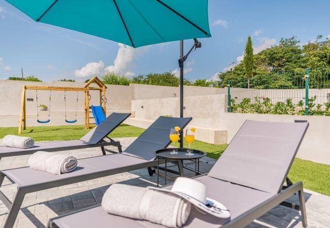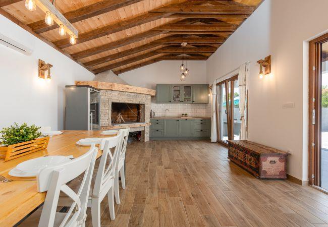 This charming villa is ideal for family vacation, since it is equipped with entertainment for all generations. While adults enjoy sipping cocktails next to the pool, kids can play on the playground which is part of the total plot of the villa. Real gastronomy enthusiast will spend the most of their vacation in a tavern next to the pool where they can prepare tasty dish on the barbecue for whole family to gather around. Villa itself consists of an open plan living room and a dining room with fully equipped kitchen, three bedrooms and two bathrooms. With two double beds , two single beds and one extendable sofa, Villa Zeleni Gaj can comfortably accommodate 8 persons.