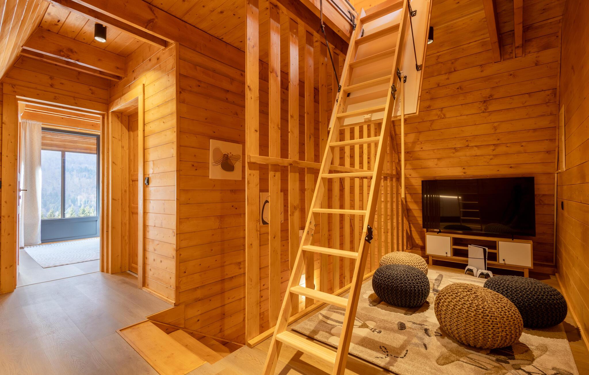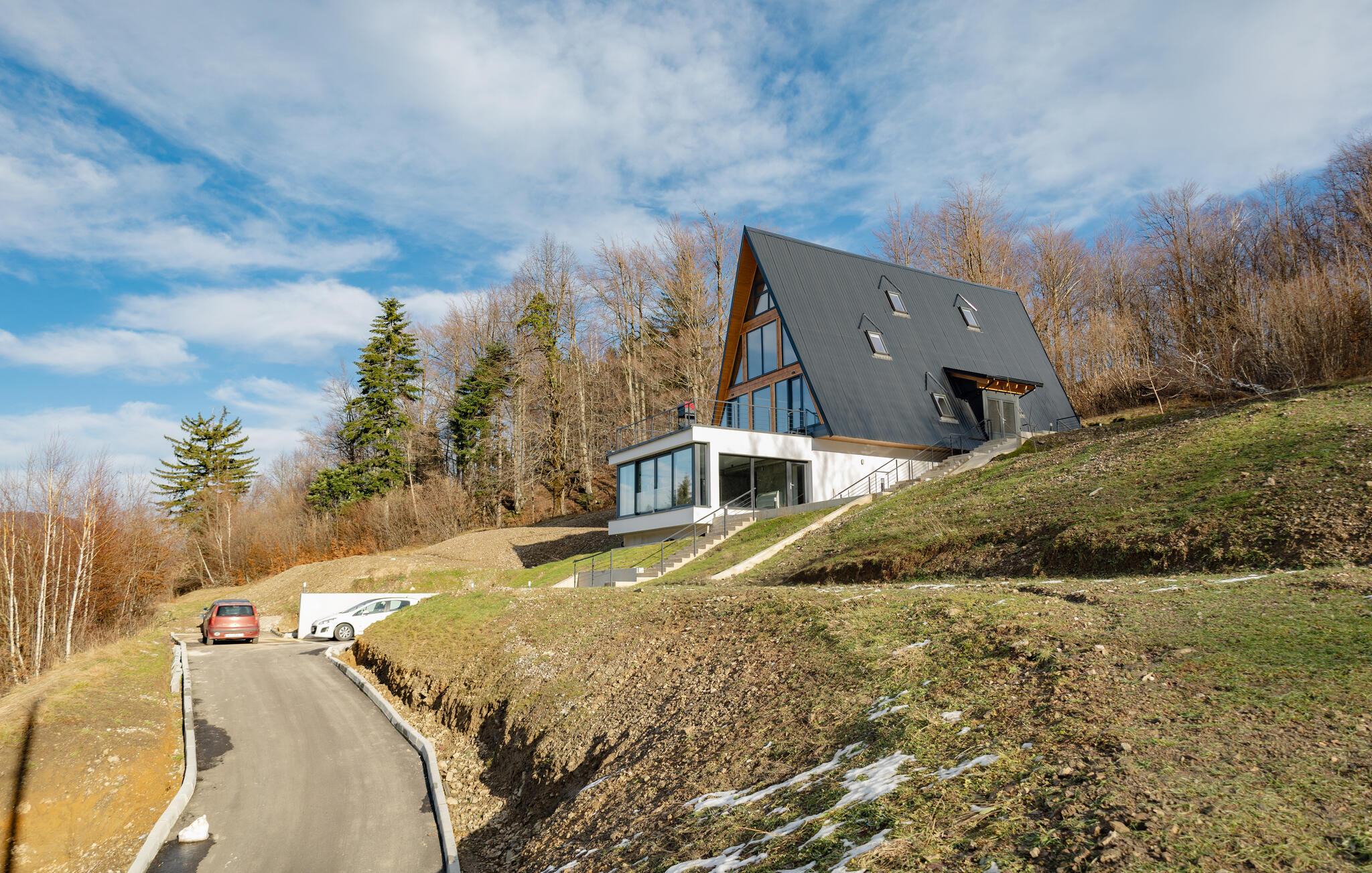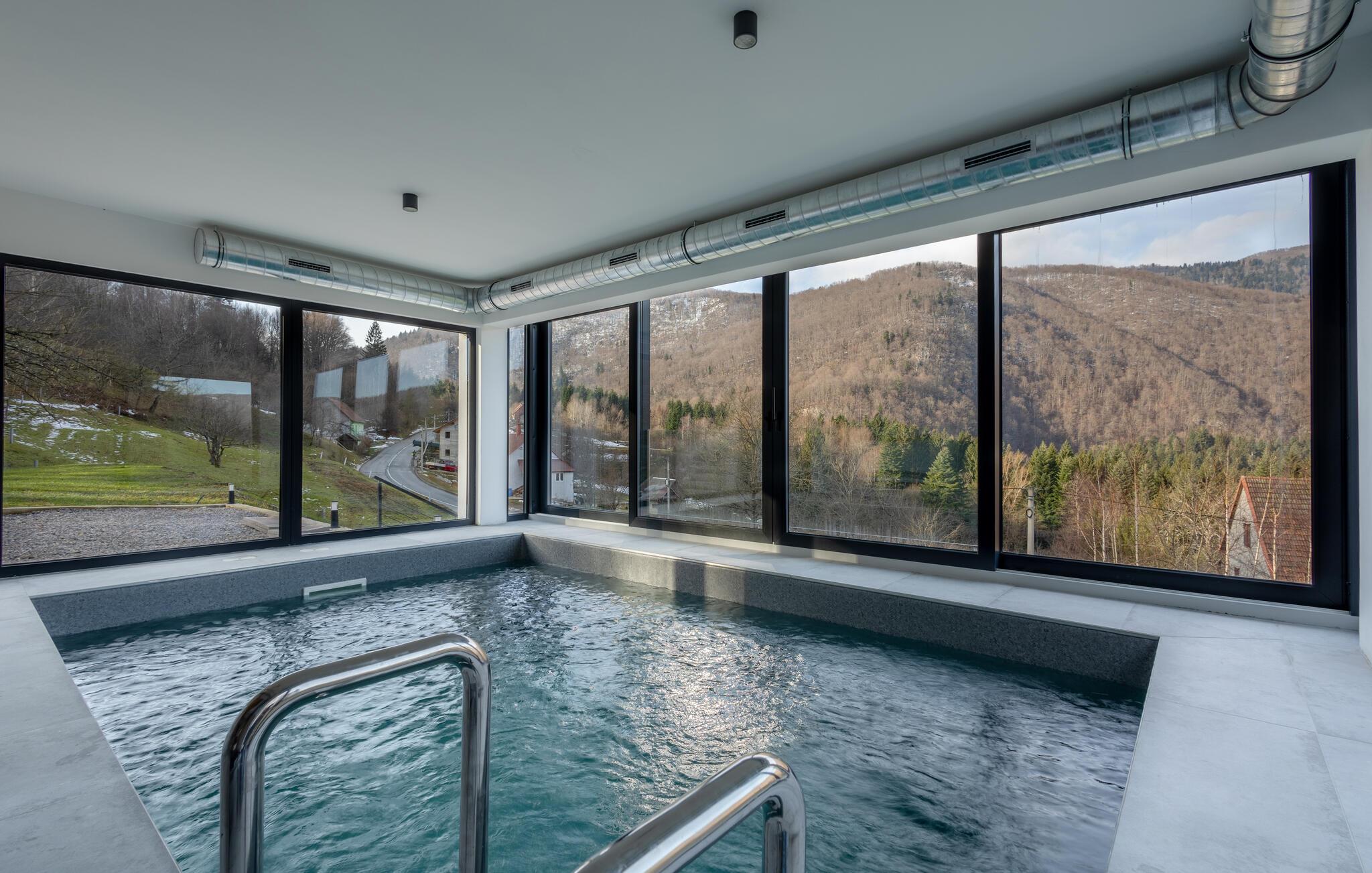 Omgivet af uberørt natur og beliggende på en skråning byder dette komfortable og smagfuldt indrettede feriehus velkommen, hvis rummelige vinduesfronter byder på en betagende udsigt over det omkringliggende landskab. Lav mad sammen i det moderne køkken og spis ved det elegante spisebord. Forkæl jer selv med afslapning i den indendørs pool, inden I synker ned i det komfortable sofaområde om aftenen, streamer en spændende serie eller slutter dagen af ??med et glas vin foran pejsen.