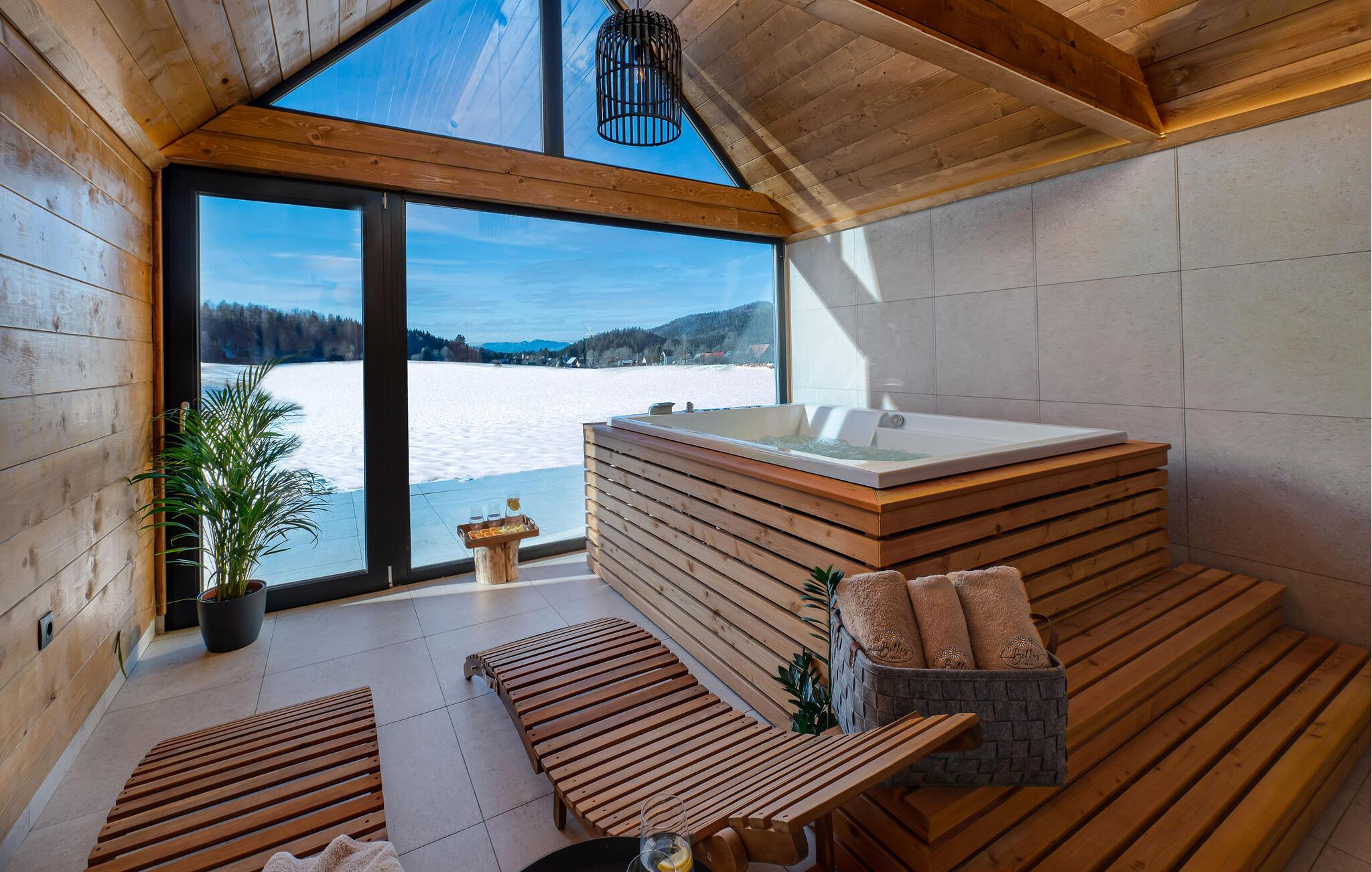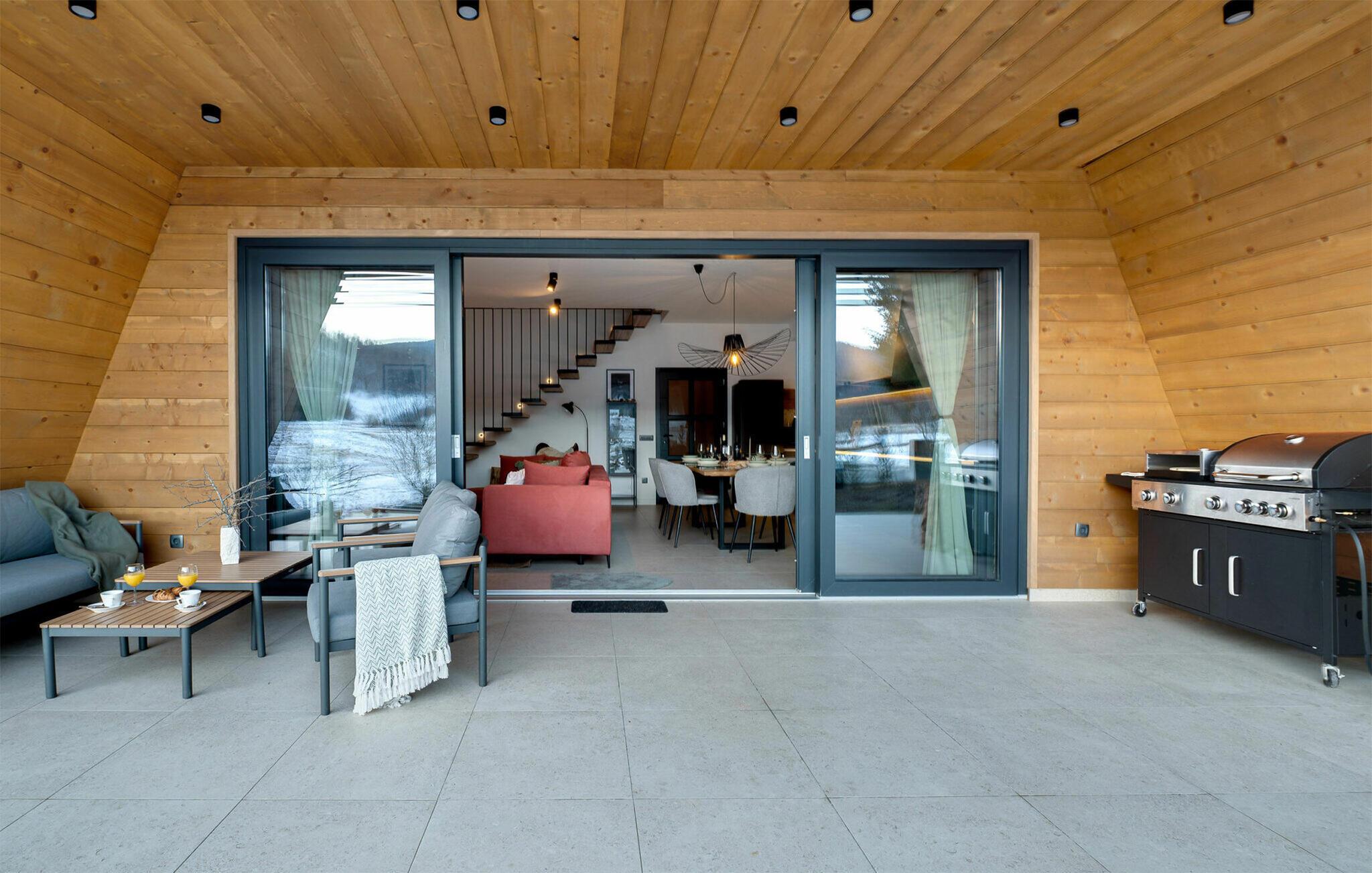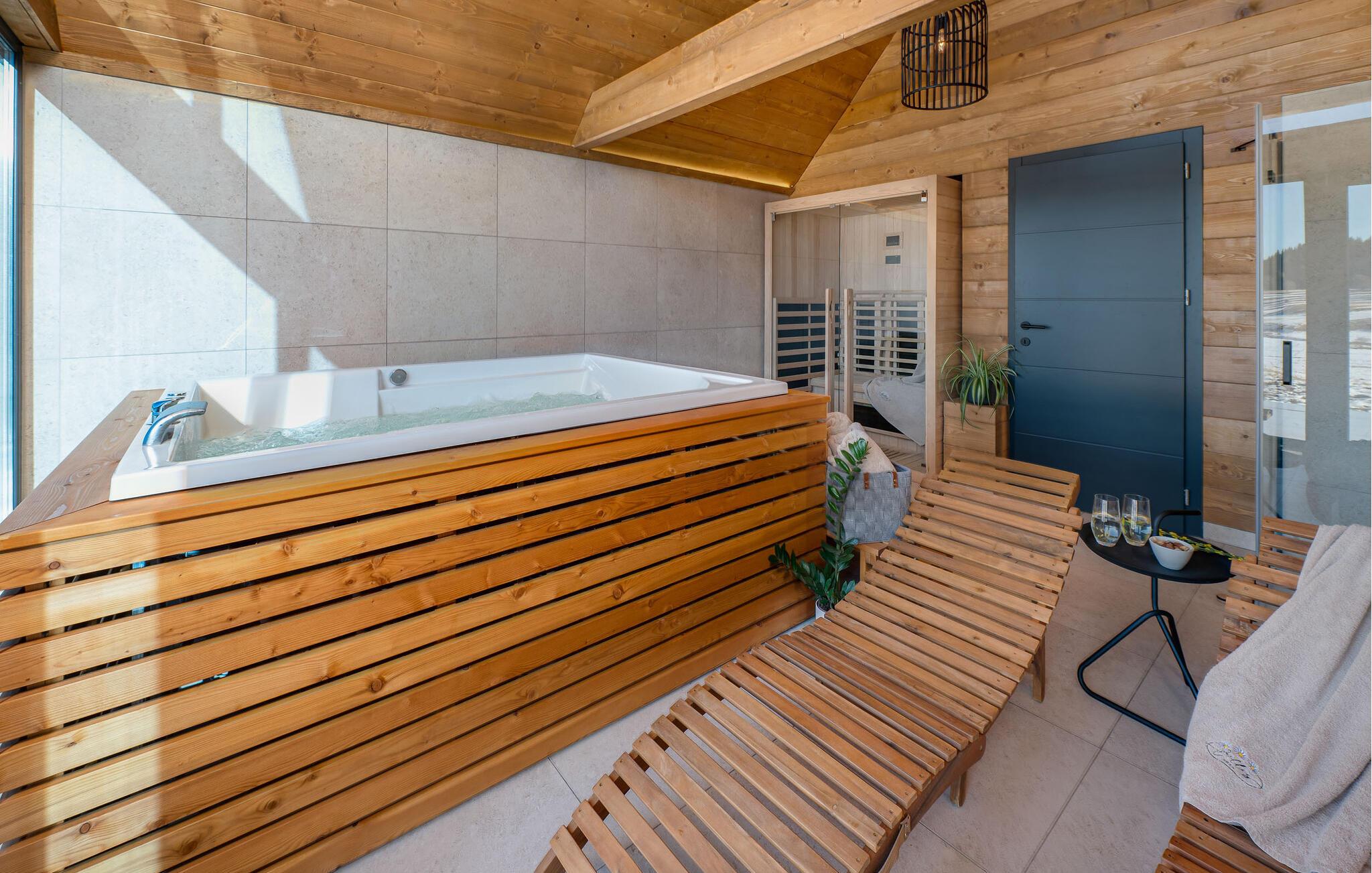 I vil straks føle jer hjemme i dette smukke telttaghus, som fordeler sig over to etager. Det rummelige feriehus kombinerer moderne design med rustik charme og byder på alt, hvad I skal bruge til en afslappende ferie. Det lyse interiør skaber en varm atmosfære, mens altanen og terrassen lægger op til afslappende timer i den friske luft. Husets højdepunkt er det luksuriøse wellness-område med sauna og spabad - perfekt til at slappe af efter en dag i naturen og nyde panoramaudsigten over det omkringliggende landskab.