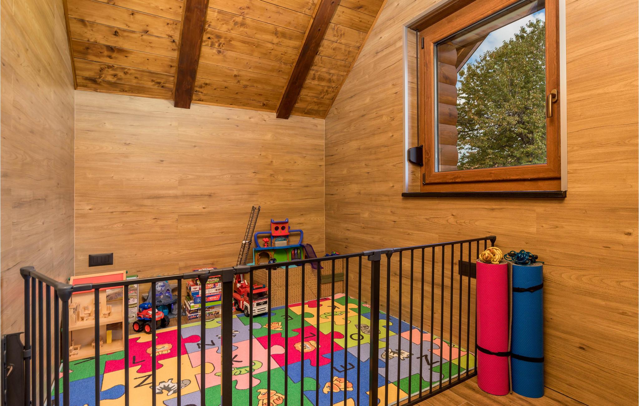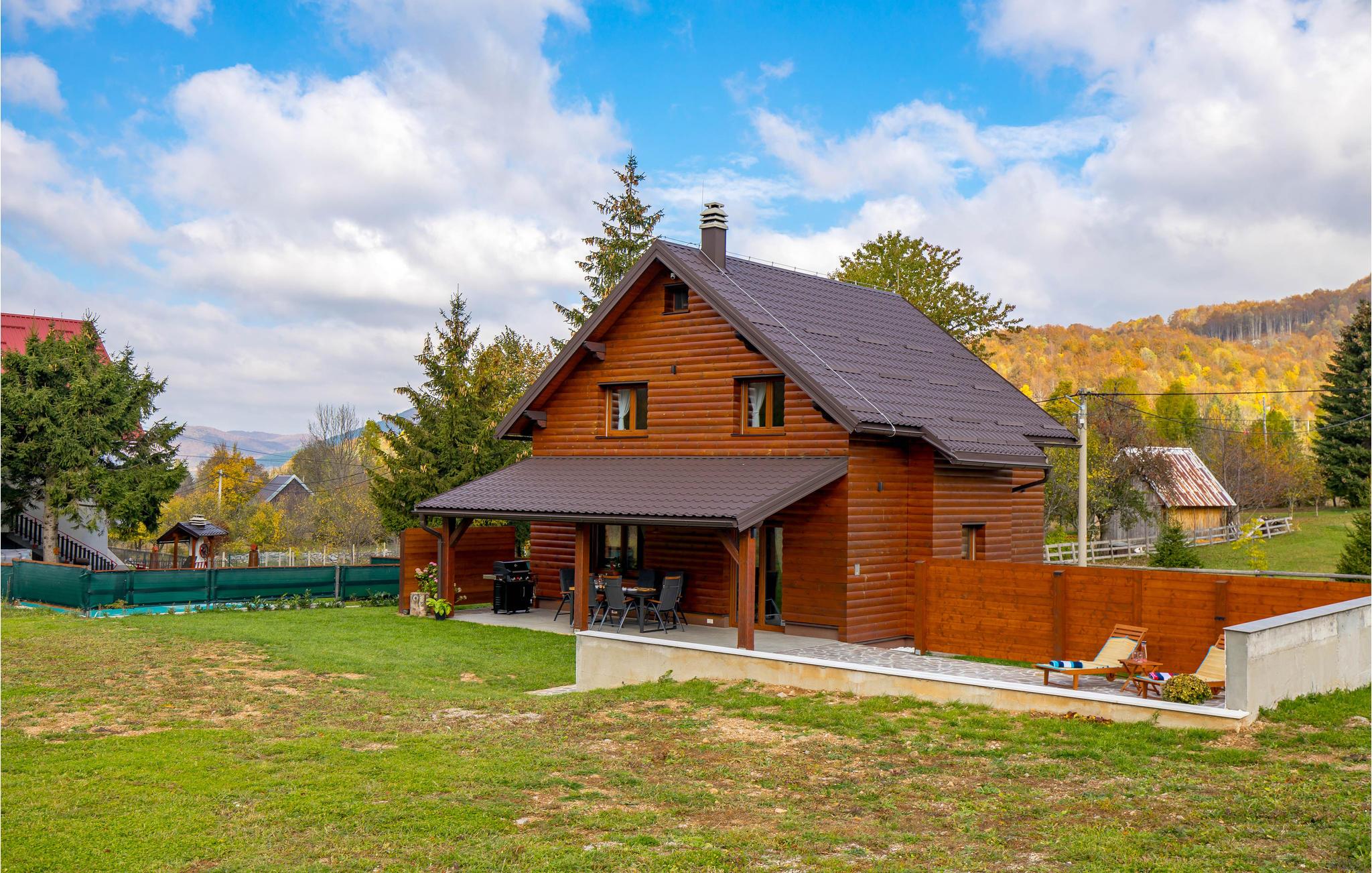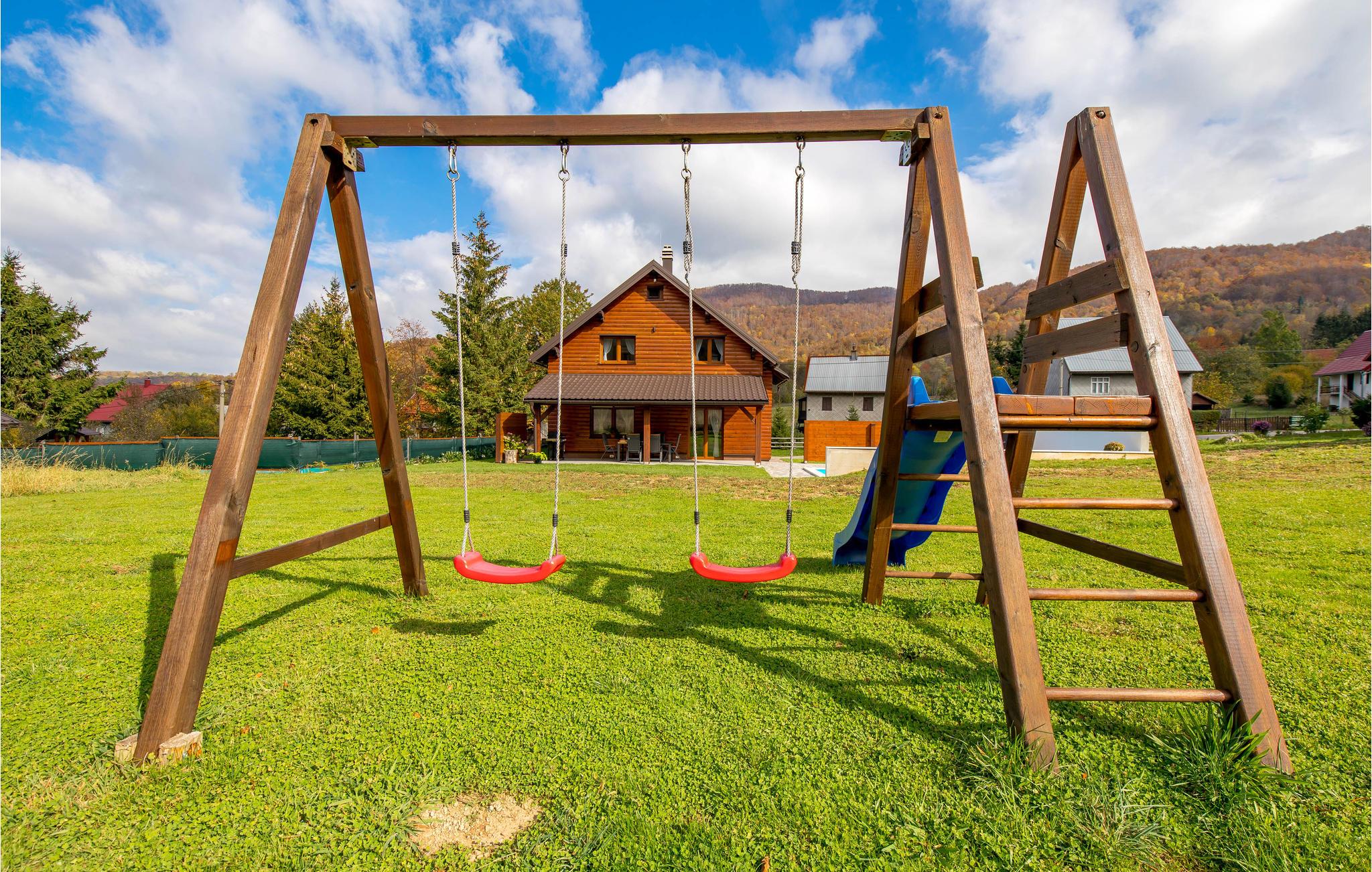 Fra huset træder I ud på en stor, skyggefuld terrasse, hvor I kan tilberede jeres yndlingsretter på grillen og nyde måltiderne sammen. Der er både pool og legestativer til børnene, så alle får det sjovt. Som prikken over i'et er der en fantastisk udsigt til de grønne bjerge længere ude.