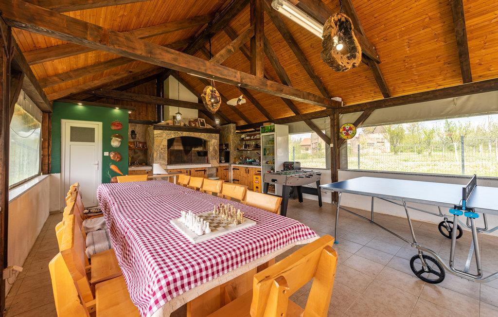 På ferie i dette feriehus vil I ikke mangle hverken underholdning eller den nødvendige komfort til en afslappende pause. Med sin smagfulde indretning i stil med et landsted med moderne møbler og nogle rustikke elementer, inviterer det jer til at slappe af her i tiltalende omgivelser. Om aftenen, efter en sprudlende leg ved bordfodboldbordet, kan I føle jer godt tilpas sammen ved pejsen, som skaber en hyggelig atmosfære med sin stille knitrende og hyggelige varme.
