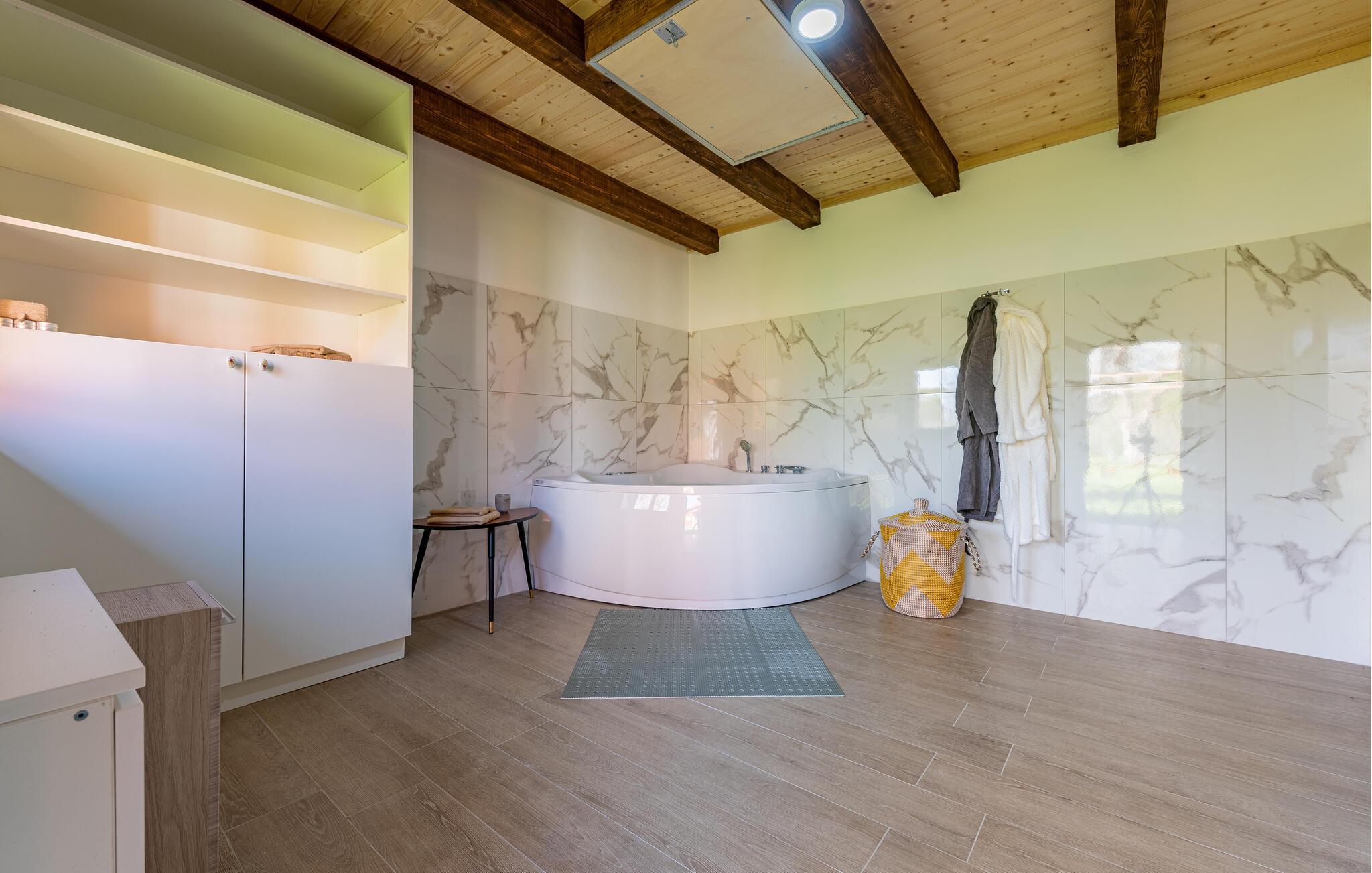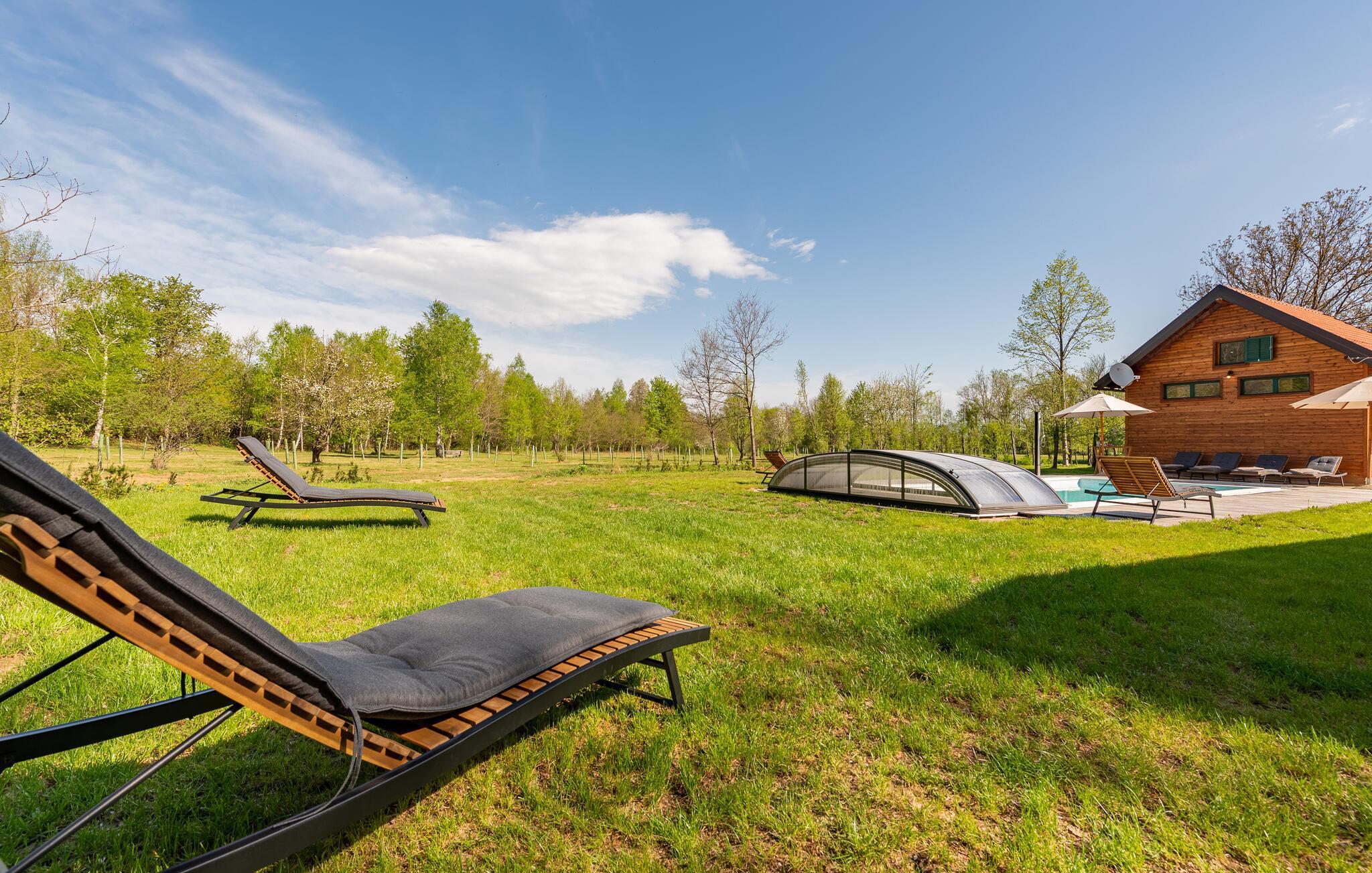 Udeområdet er minimum lige så lækkert og indbyder til mange timer i den bagende sol lige fra morgenstund. Nyd dagens første kaffe, lad solen bage jer godt igennem og hop en tur i poolen, lige som I lyster. Mens de voksne nyder solen og en god bog i liggestolene, kan børnene gå på opdagelse og brænde energi af med de fine legeredskaber på grunden. Holder vejret hele dagen, kan I fyre op i grillen og tilberede nogle saftige bøffer, lade blikket vandre over landskabet og runde aftenen af med en velfortjent tur i det udendørs spabad.