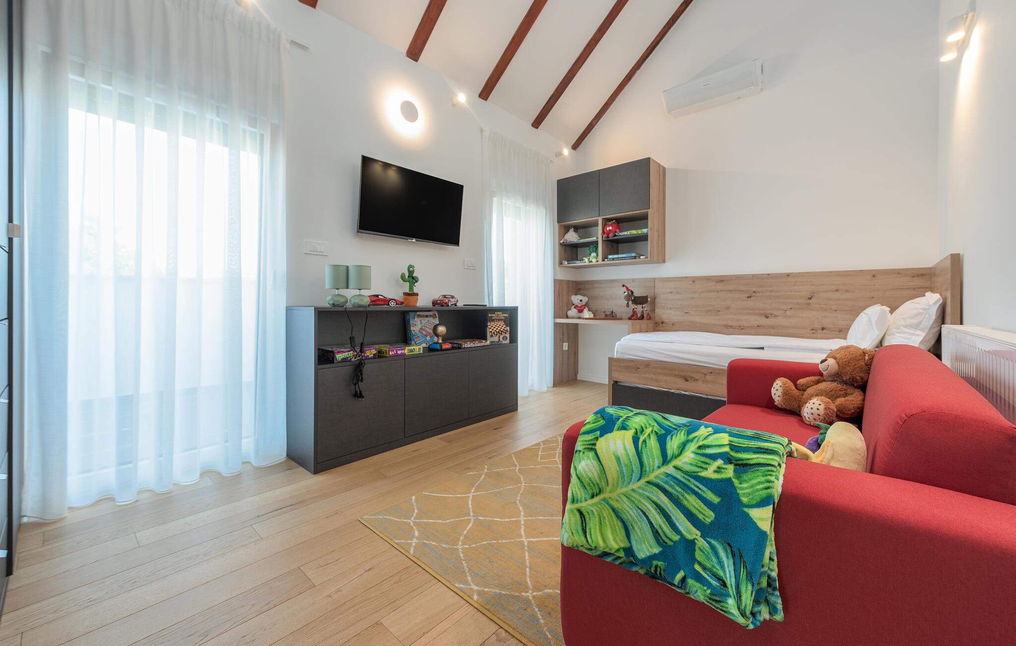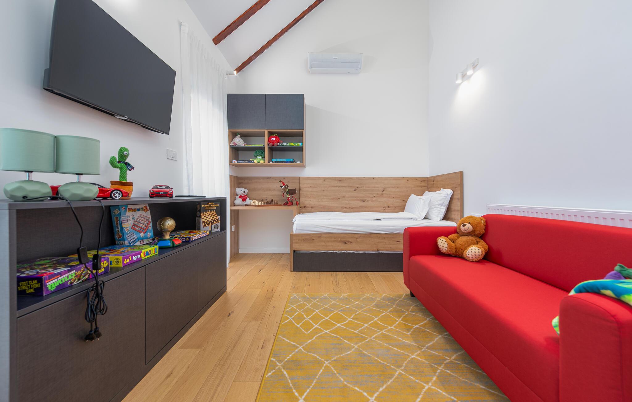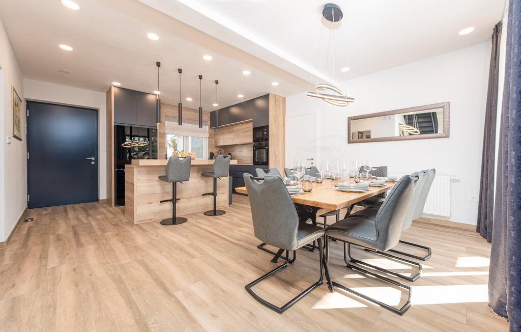 I dette hus er der plads til en stor familie eller en gruppe af venner. Tilbring en afslappende ferie i dette indbydende hus, der byder på masser af komfort, en elegant indretning og smukke designløsninger. På to rummelige etager kan I slappe af, mens jeres børn opdager børne- og legerummet. Brug også træhuset med sauna og spabad i haven samt den store pool. Se jeres børn plaske i vandet, mens I soler jer ved poolen eller på den store terrasse på første sal og nyder udsigten over den grønne natur. Glæd jer også til grillaftener på den overdækkede terrasse eller hyggelige stunder i den smukke taverna i haven.