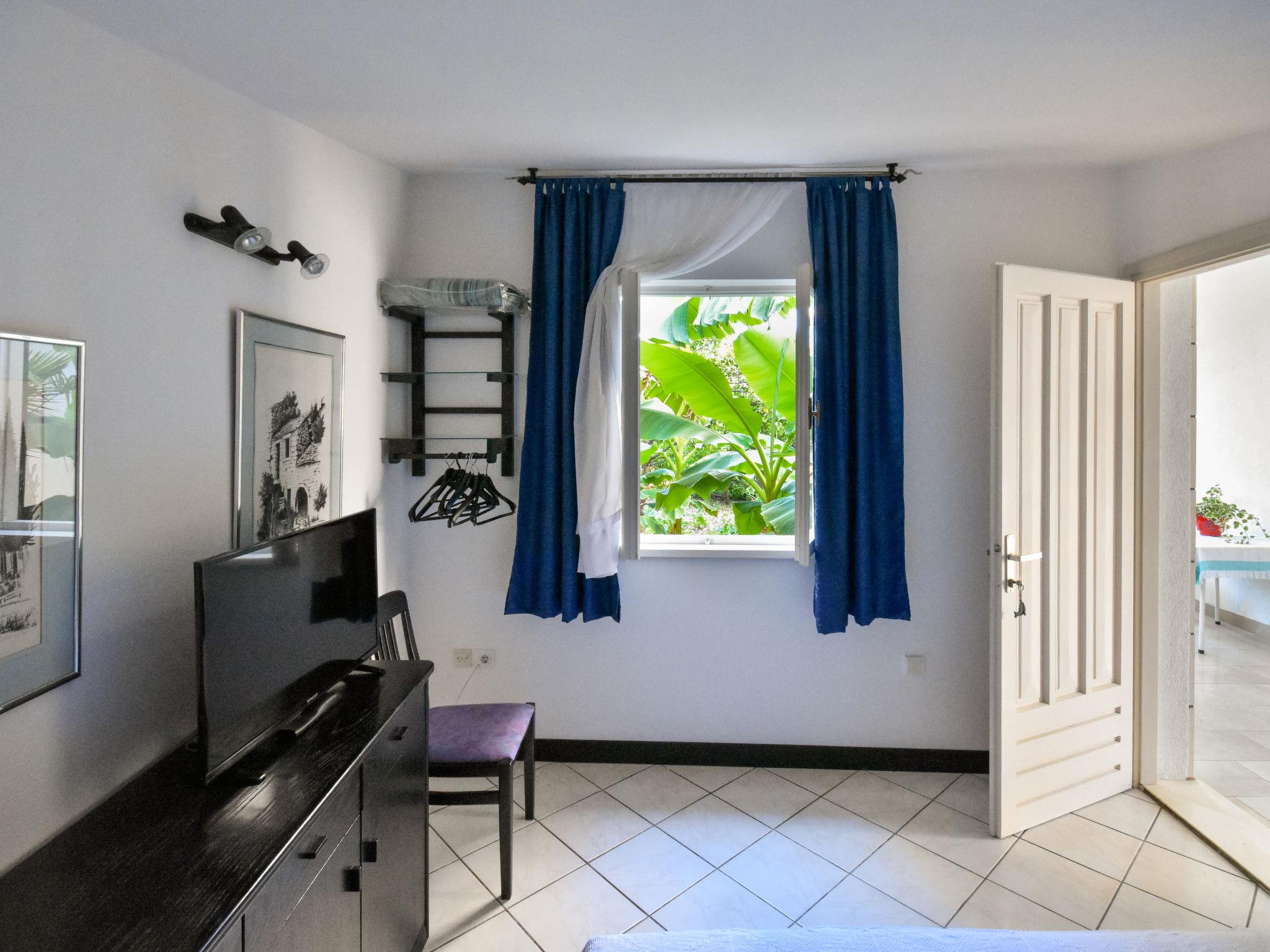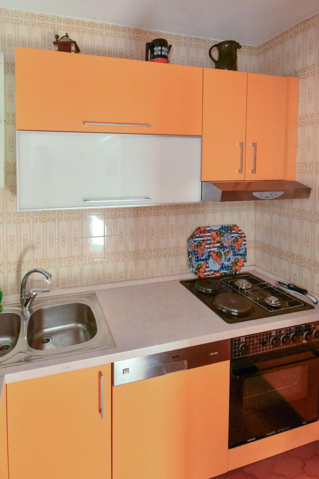 5-room house 240 m2, south facing position. Living/sleeping room with 1 french bed (180 cm, length 200 cm), dining table, kitchen corner, shower/WC and satellite TV (flat screen), air conditioning. Exit to the terrace. Living/dining room with TV and air conditioning. Exit to the terrace. Kitchen (4 hot plates, oven, dishwasher, toaster, kettle, microwave, freezer) with dining table. Bath/WC. Upper floor: 1 room with 1 french bed (180 cm, length 200 cm), air conditioning. Exit to the balcony. 1 room with 2 beds (90 cm, length 200 cm), air conditioning. Exit to the balcony. 1 room with 2 beds (80 cm, length 190 cm). Bath/bidet/WC. No heating option. Balcony 10 m2, terrace 15 m2 partly roofed. Terrace furniture, barbecue, deck chairs. Beautiful view of the sea. Facilities: washing machine. Internet (WiFi, free). One house with living/dining area with exit to terrace and kitchen on the ground floor, 3 bedrooms on the first floor. The other house with living/sleeping room and open kitchen on the ground floor.