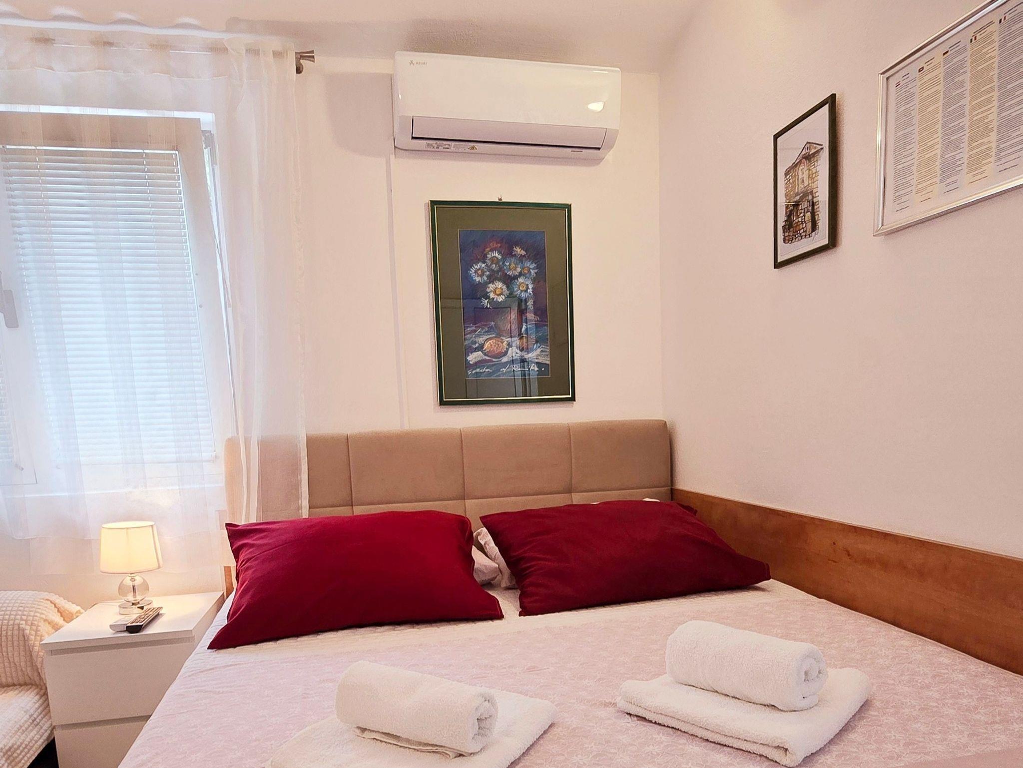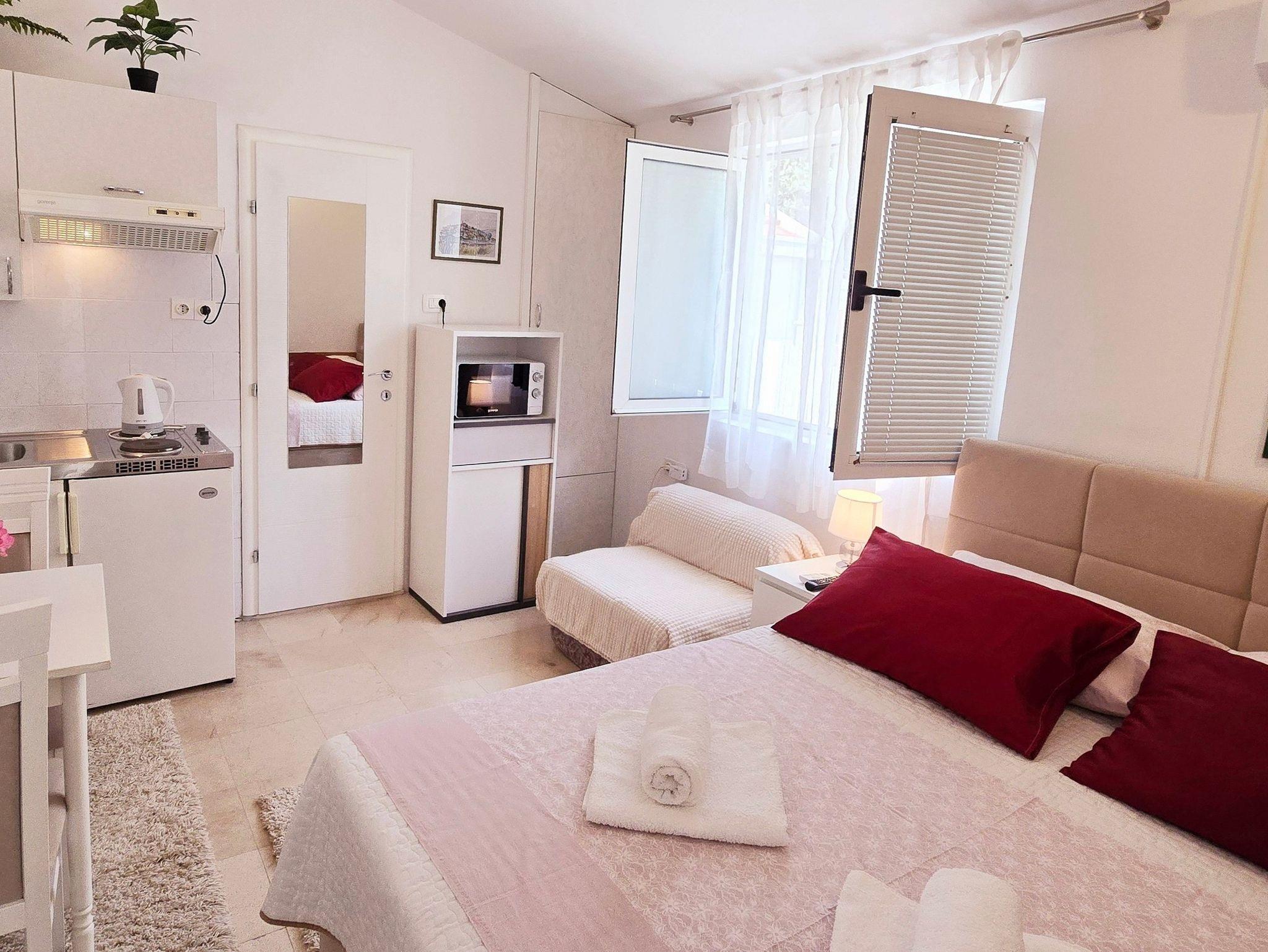 Studio bietet Platz für 2 Gäste. Die Betten sind in Schlafzimmern, die es 1 gibt, innerhalb einer Gesamtfläche von 21m2, angeordnet. Die Gäste haben einen eigenen Balkon zur Verfügung, auf der sie in warmen Sommernächten genießen können. Es ist erlaubt, Speisen auf dem Gemeinschafts-Grill vorzubereiten. IM PREIS INBEGRIFFEN: Kurtaxe, Endreinigung, Klimatisierung, Parkplatz, Internet, Bügeleisen, Bügelbrett, Föhn, tragbarer Grill. Die Verfügbarkeit zusätzlicher Dienstleistungen in Ihrem reservierten Termin und die Preise derselben (falls nicht aufgeführt) müssen im Voraus überprüft werden. Zusätzliche Dienstleistungen die in der Zahlungsaufforderung nicht aufgeführt sind werden direkt beim Vermieter bezahlt, angenommen der Gast nutzt auch diese. Ermäßigung auf den Grundpreis: Gratistag 14=13 (bei einem Aufenthalt von 14 Tagen oder mehr erhalten Sie einen Gratistag für den Aufenthalt bis 31.12.26).