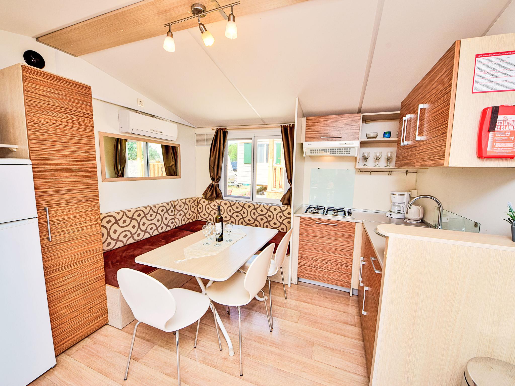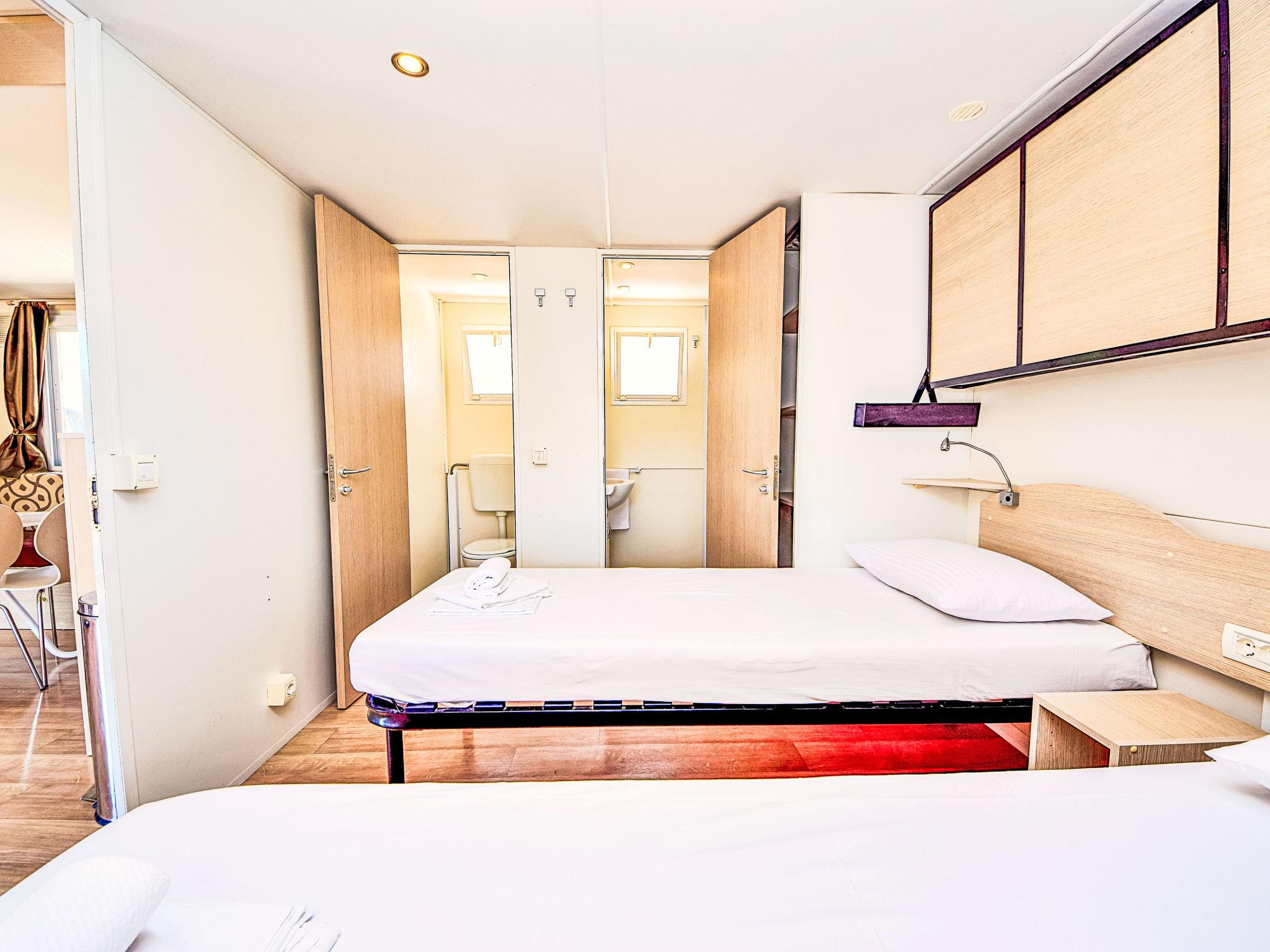 3-room bungalow 33 m2. Living/dining room with satellite TV (flat screen), air conditioning. Exit to the terrace. 1 room with 1 french bed (160 cm, length 200 cm), shower/WC. 1 room with 2 beds (80 cm, length 200 cm), shower/WC. Kitchen (dishwasher, 4 gas rings, toaster, kettle, microwave, freezer, electric coffee machine) with dining table. Terrace 17 m2, roofed. Terrace furniture. Facilities: hair dryer. Internet (WiFi, free). Parking (1 car).