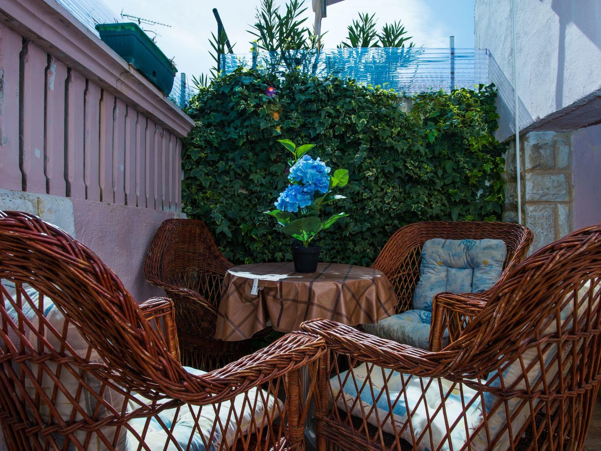 The flat Superior has 52m² living space for 5 persons and has a terrace of 12m² with seating and dining area and a Tenda, not sea view. The flat has 2 bedrooms, a fully equipped kitchen and a living room with a dining area. Flat has two bathrooms with shower cabin and WC. Here are also air conditioning, Wi-Fi, safe, family games, electric kitchen appliances / kettle, coffee maker. Car park is in front of the house.