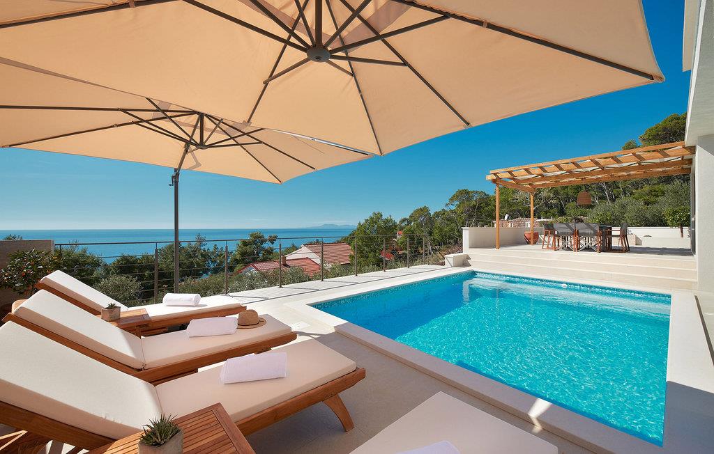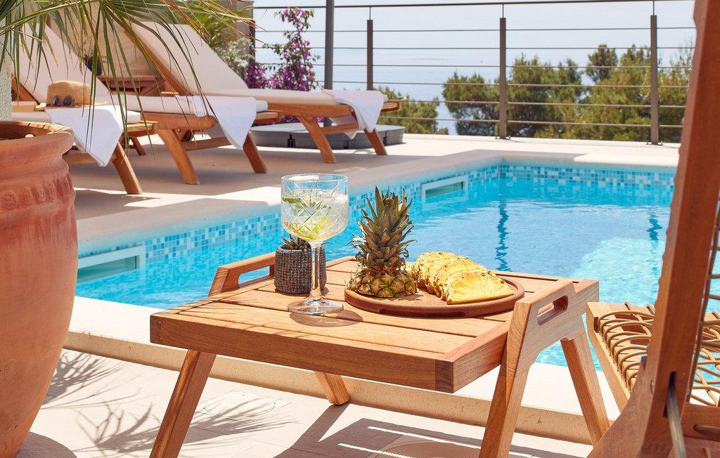 Glæd jer til magiske solnedgange i dette sensationelle feriehus med pool og havudsigt. Med en sublim beliggenhed på en bakke over havet tilbyder den luksuriøse designer Villa Bianca Hvar en uforglemmelig udsigt over Adriaterhavet og den vilde middelhavsvegetation. Træd indenfor og bliv betaget af det stilfulde interiør af høj kvalitet, hvor store vinduer gentagne gange afslører en storslået udsigt over havet og bader de harmoniske rum i et behageligt, varmt lys. Nyd harmoniske måltider i den lyse spisestue, sæt jer til rette i den hyggelige stue med en god bog efter en begivenhedsrig dag eller lyt til den bløde knitren fra pejsen, mens I nyder en stimulerende samtale. Lange solskinstimer under den dybblå himmel venter jer også i det elegante udendørsområde. snup en frisk dukkert i poolen som det første om morgenen, luk øjnene på de komfortable liggestole og nyd den fredelige atmosfære. Server jer selv en lækker morgenmad i det diskret skyggefulde udendørs spiseområde, tilbered lækre grillmåltider i sommerkøkkenet, og lyt til cikadernes kvidren, mens I nipper til et glas vin. Oplev de smukke, uberørte strande og snorkel i det krystalklare vand i stille bugter. Cykl eller vandre gennem olivenlunde og vinmarker og prøv regionens fremragende vine. Windsurf, prøv lykken med at fiske eller klatr frit på eventyrlystne klipper. Den smukke by Hvar tilbyder et udvalg af restauranter og barer af høj kvalitet samt et pulserende natteliv.