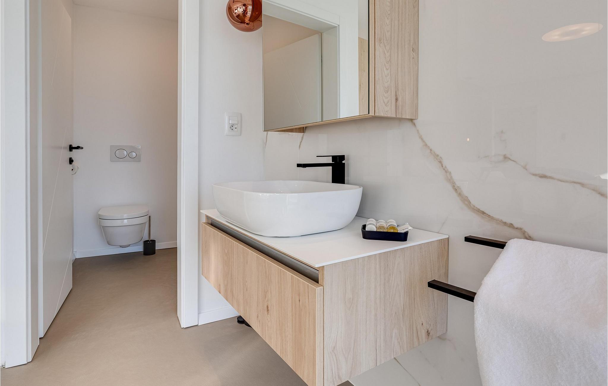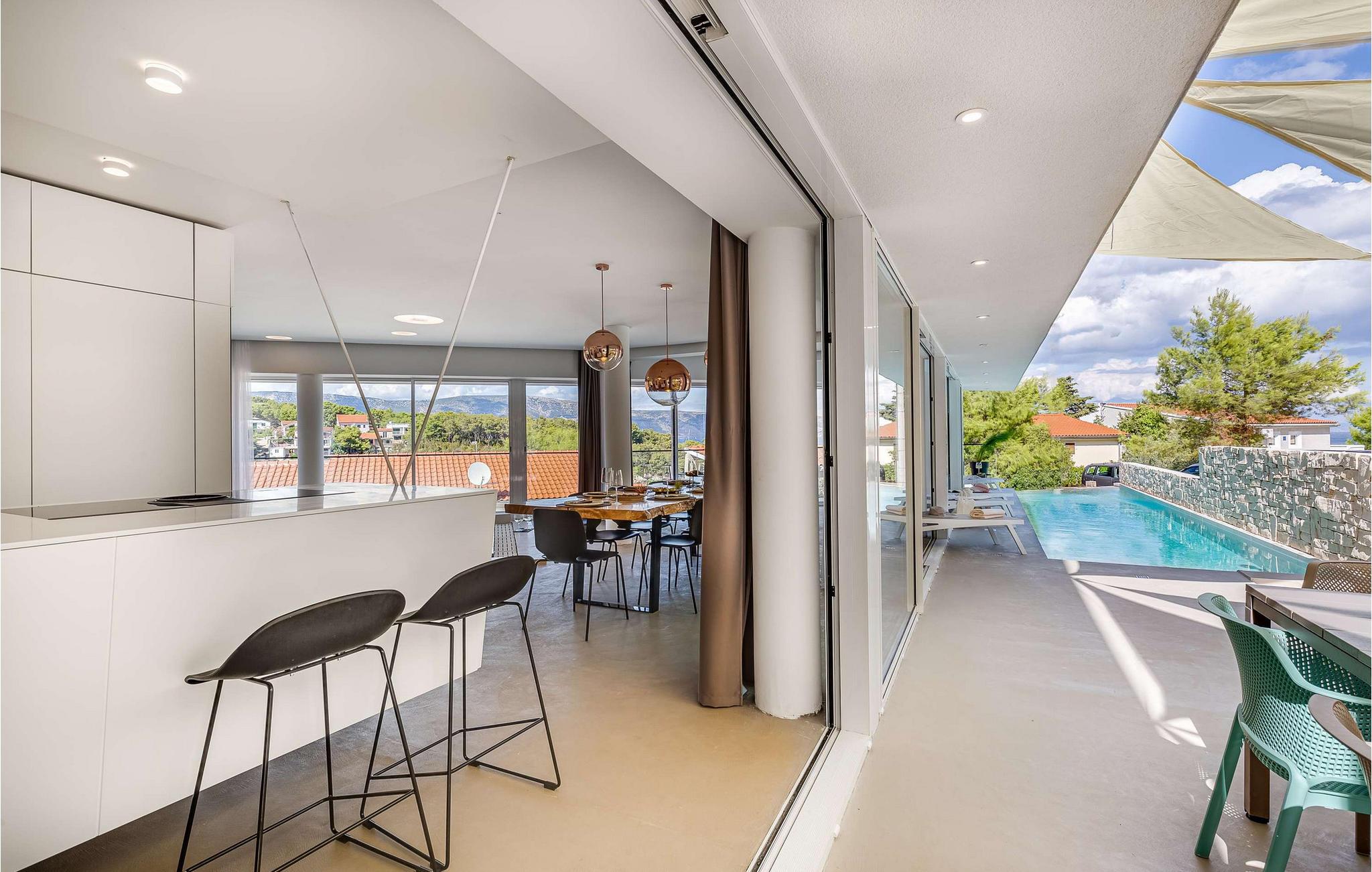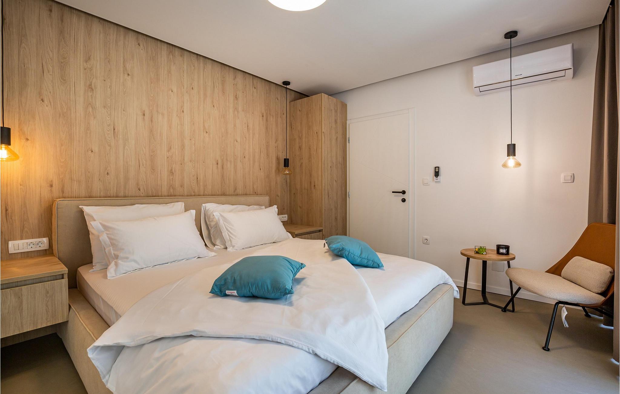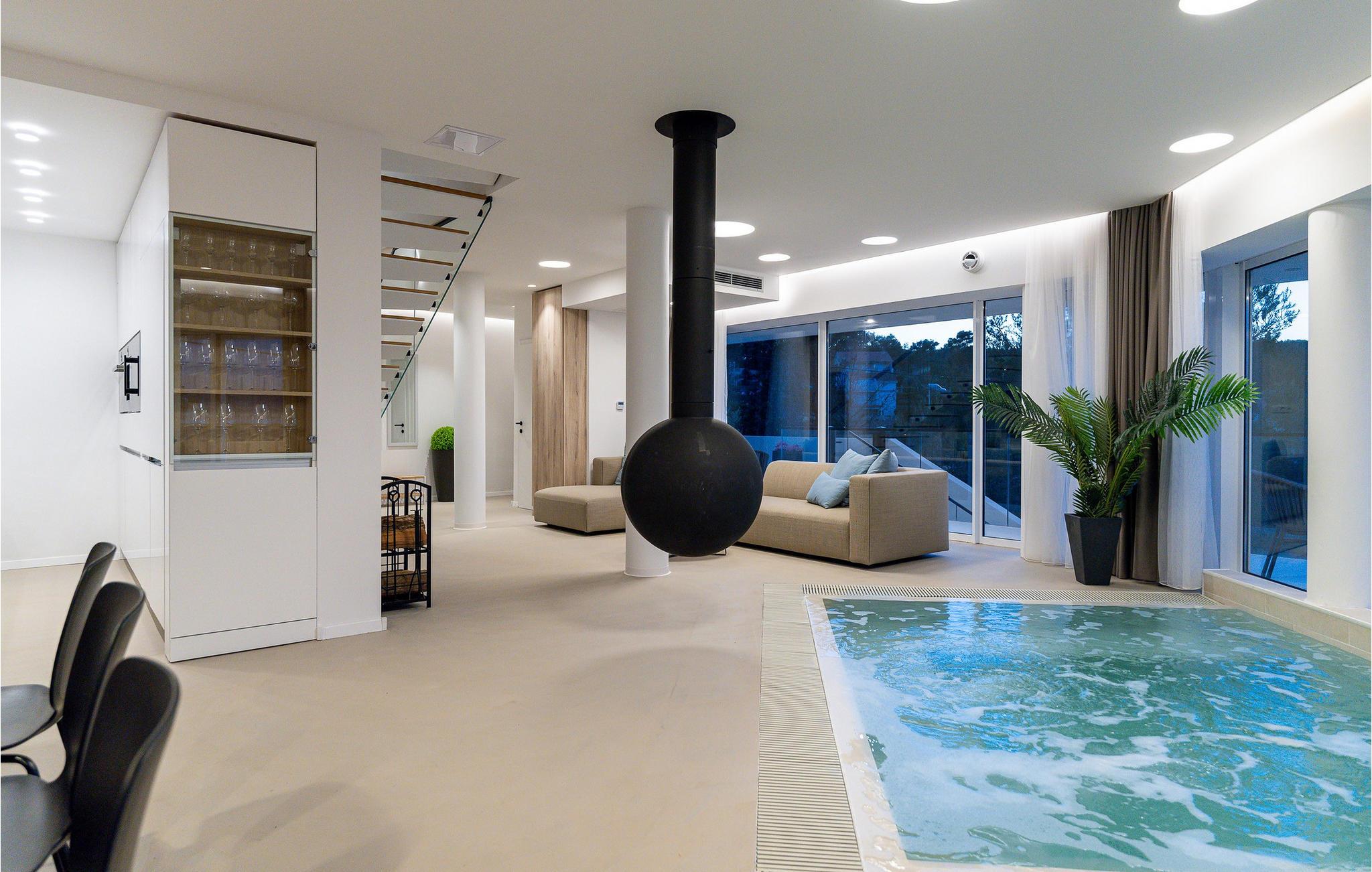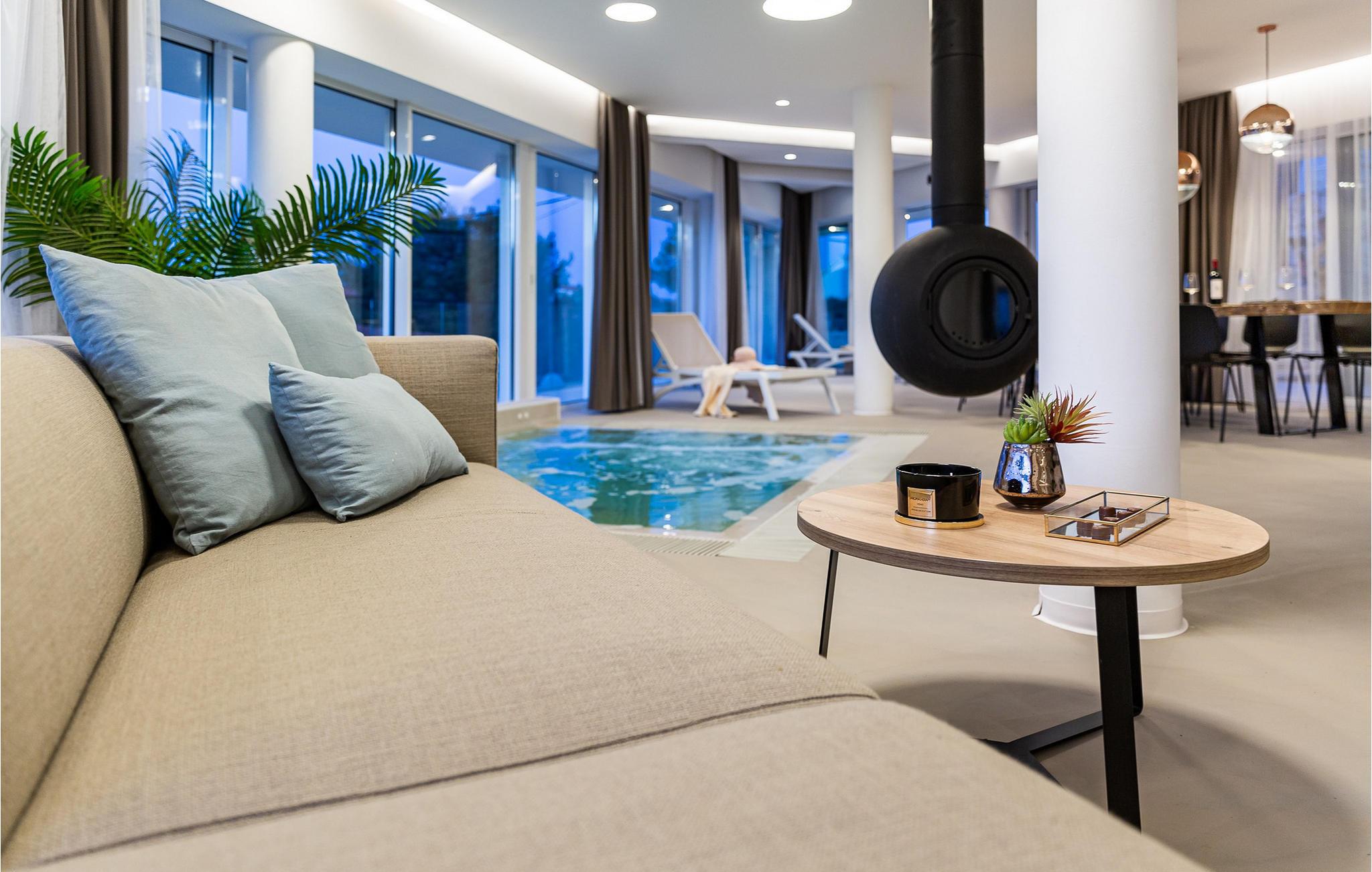 Beliggende kun få skridt fra kysten kan den luksuriøse Villa Aestas prale af et sensationelt arkitektonisk design og har et smagfuldt og luksuriøst møbleret interiør. Skab kulinariske mesterværker i det moderne køkken, nyd harmoniske måltider i den åbne spisestue, og lad jer betage af den opvarmede indendørs pool i den elegante stue, hvor I kan nyde hyggelige stunder selv i de køligere måneder. Slap af i saunaen, snak ved pejsen eller nyd den behagelige atmosfære med en stille bog.