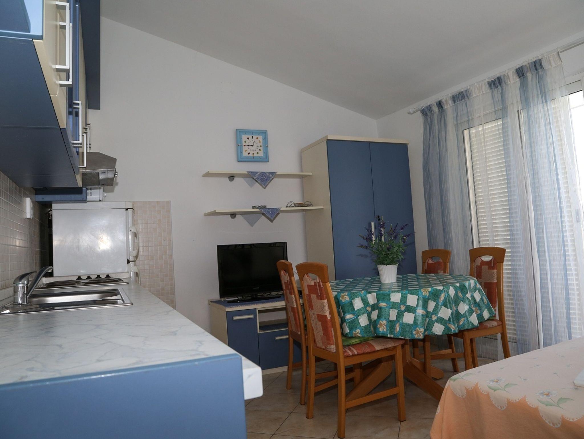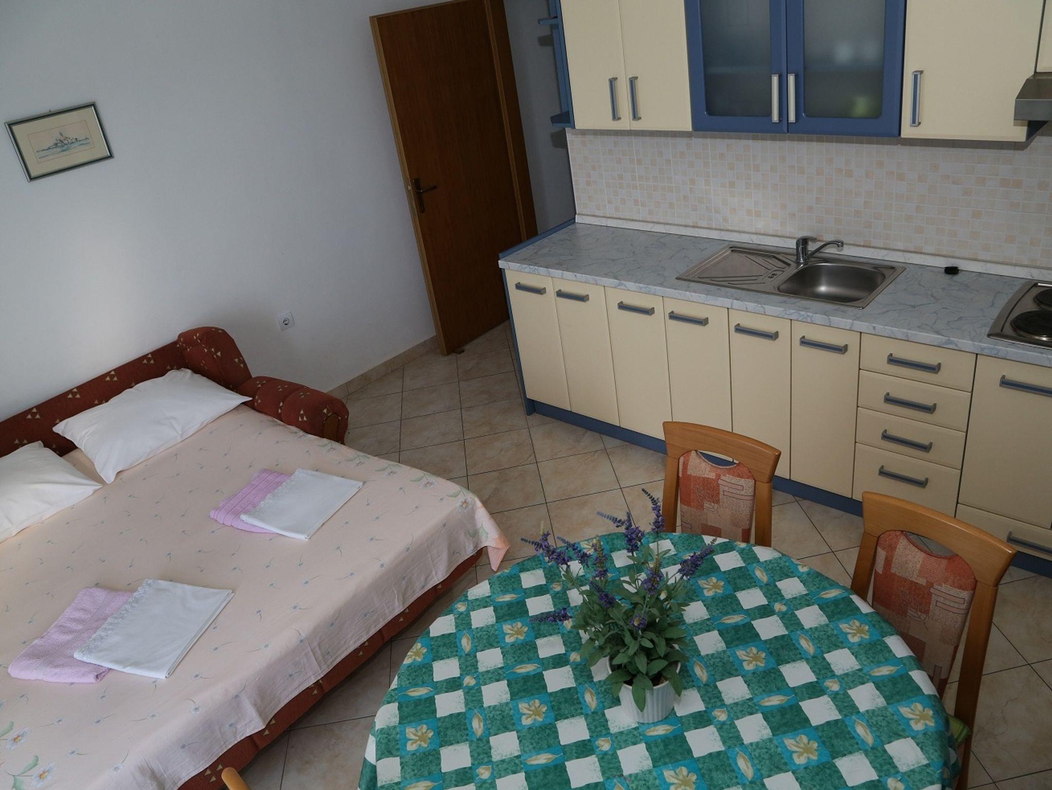 Ferienwohnung bietet Platz für 4 Gäste. Die Betten sind in Schlafzimmern, die es 1 gibt, und in Esszimmer, innerhalb einer Gesamtfläche von 33m2, angeordnet. Die Gäste haben eine eigene Terrasse zur Verfügung, auf der sie in warmen Sommernächten genießen können. Das Apartment bietet Meerblick. Es ist erlaubt, Speisen auf dem Gemeinschafts-Grill vorzubereiten. IM PREIS INBEGRIFFEN: Kurtaxe, Endreinigung, Klimatisierung, Internet, Zusatzbett. Die Verfügbarkeit zusätzlicher Dienstleistungen in Ihrem reservierten Termin und die Preise derselben (falls nicht aufgeführt) müssen im Voraus überprüft werden. Zusätzliche Dienstleistungen die in der Zahlungsaufforderung nicht aufgeführt sind werden direkt beim Vermieter bezahlt, angenommen der Gast nutzt auch diese.
