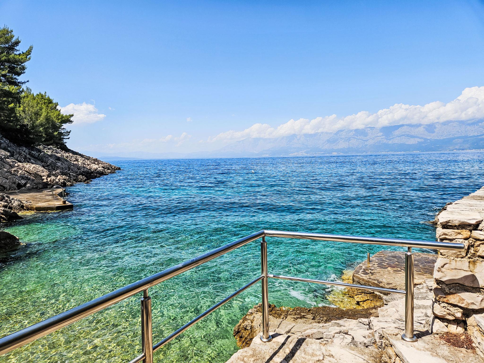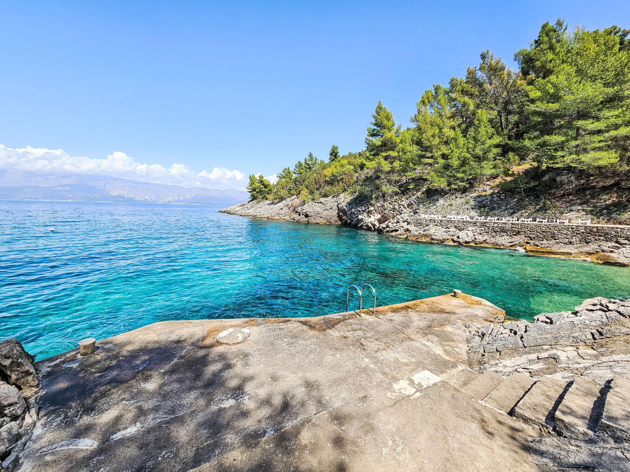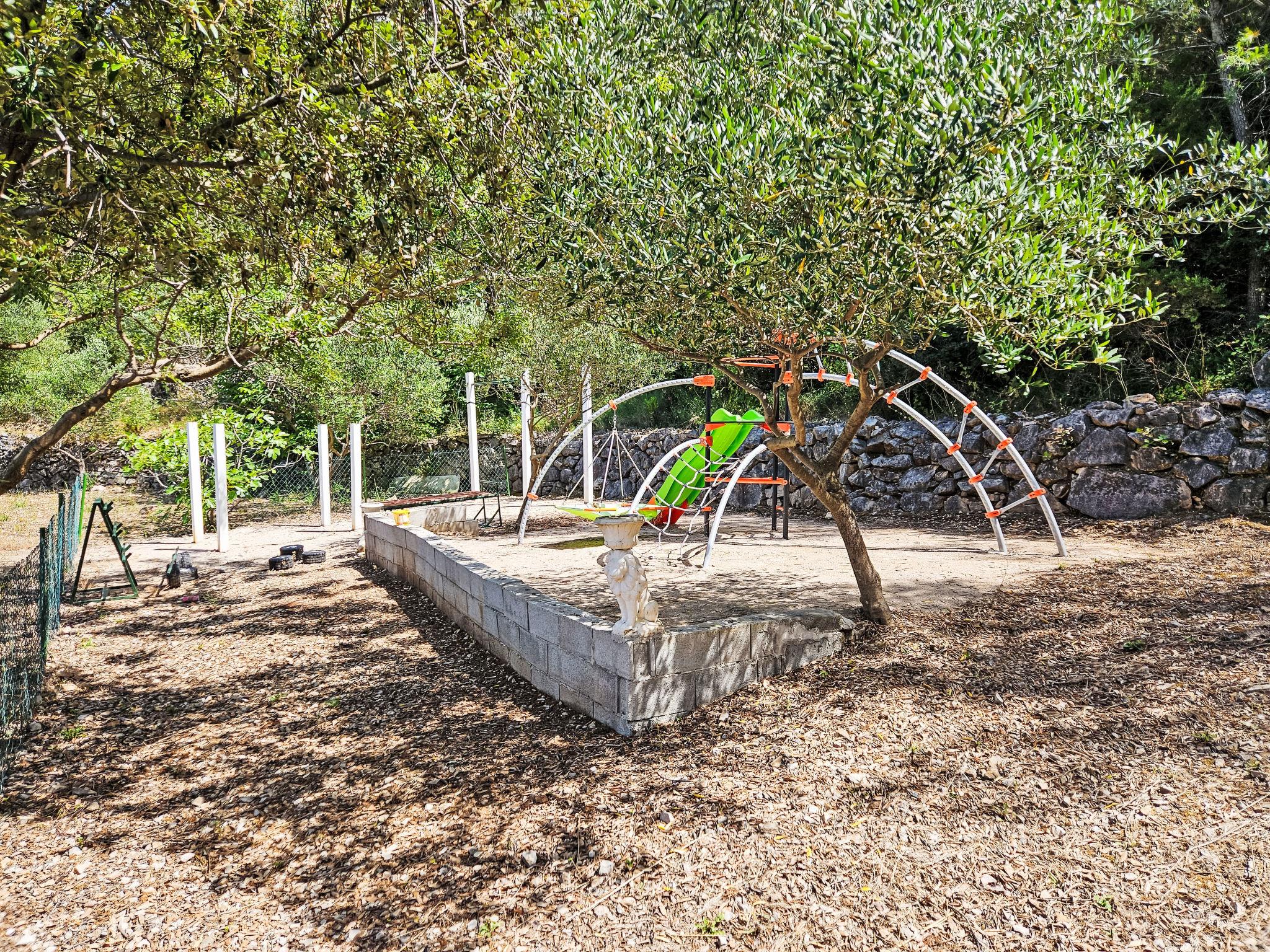 Apartment block "Octopus". 37 km from the centre of Jelsa, in a secluded, quiet, sunny position on a slope, from the sea, 10 m from the beach. For shared use: property 1'500 m2. Terrace (50 m2), garden furniture, barbecue house, children's playground (slide, swing). In the house: internet access, washing machine. Parking at the house on the premises. Shop 3.3 km, bus stop 29.1 km, pebble beach, shingle beach 10 m. Please note: private mooring, on request. The owner lives in the same residence. The tap water has no drinking water quality.