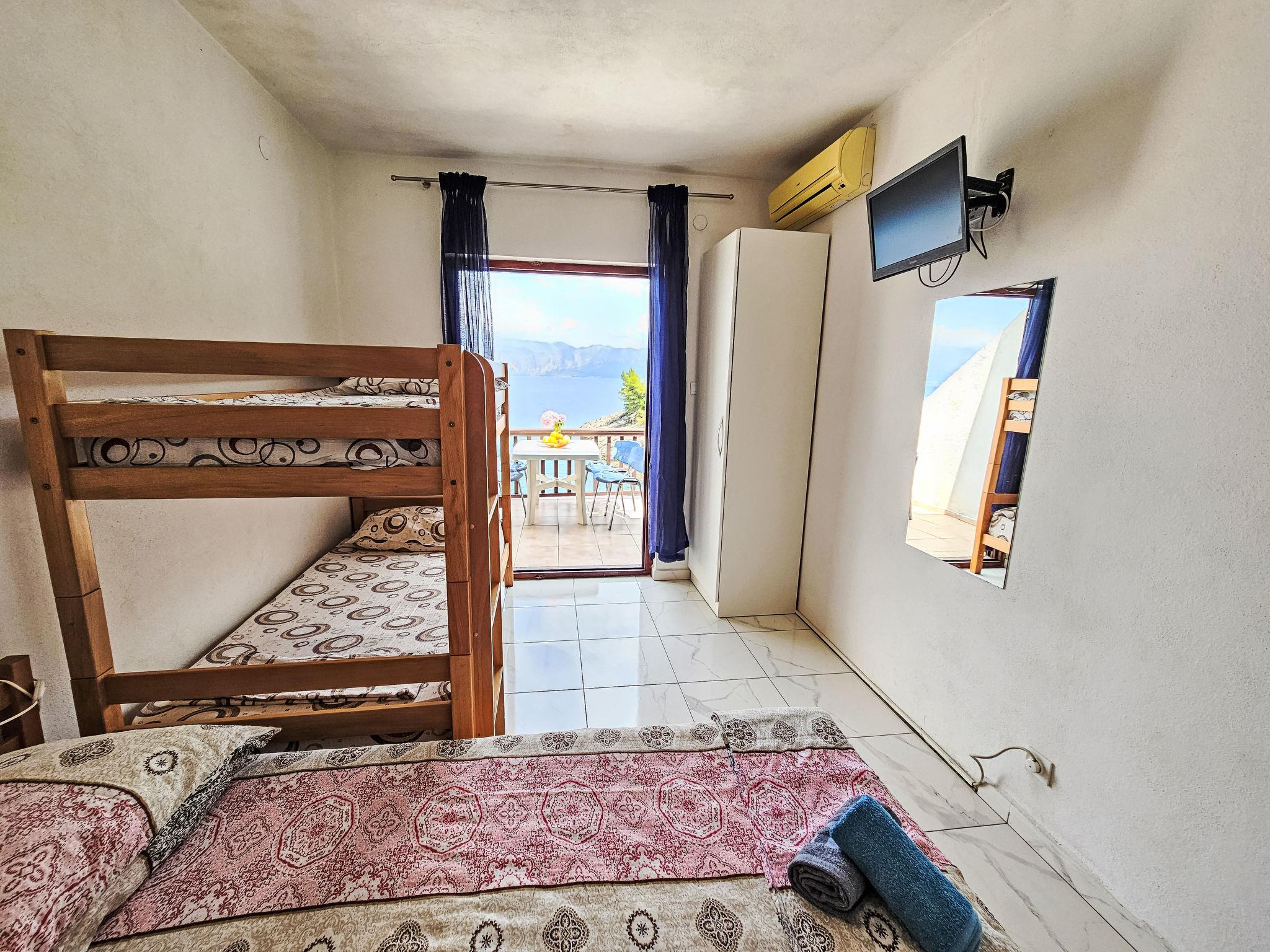 2-room apartment 35 m2 on 2nd floor. 1 room with 1 x 2 bunk beds (90 cm, length 200 cm), 1 french bed (160 cm, length 200 cm), satellite TV and air conditioning. Exit to the balcony. Small kitchen (oven, Gas stove, 4 gas rings, kettle, microwave, freezer) with dining table. Shower/WC. Balcony 6 m2. Balcony furniture, deck chairs (20). Marvellous panoramic view of the sea. Facilities: iron, hair dryer. Internet (WiFi, free). 1 small pet/ dog allowed.