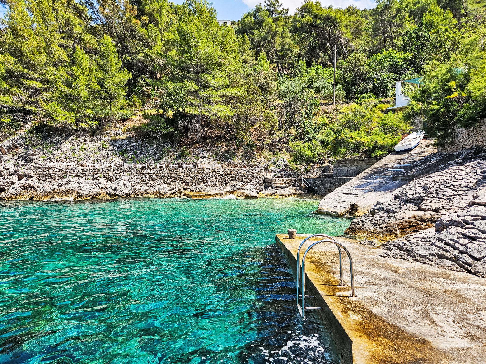 Apartment block "Octopus". 37 km from the centre of Jelsa, in a secluded, quiet, sunny position on a slope, from the sea, 10 m from the beach. For shared use: property 1'500 m2. Terrace (50 m2), garden furniture, barbecue house, children's playground (slide, swing). In the house: internet access, washing machine. Parking at the house on the premises. Shop 3.3 km, bus stop 29.1 km, pebble beach, shingle beach 10 m. Please note: private mooring, on request. The owner lives in the same residence. The tap water has no drinking water quality.