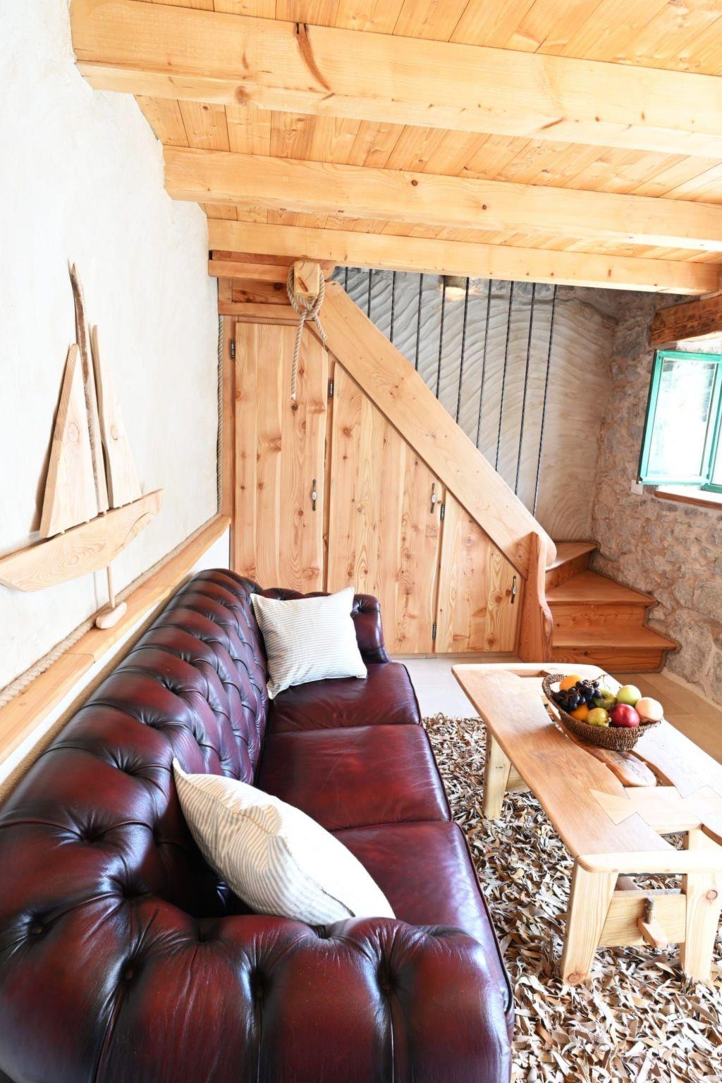 On the ground floor, the villa has a living room area with charming Chesterfield sofa and couches, perfect for enjoying your morning coffee or evening glass of wine, as well as a toilet. Next to the living area, there is a fully equipped kitchen and comfortable dining area.