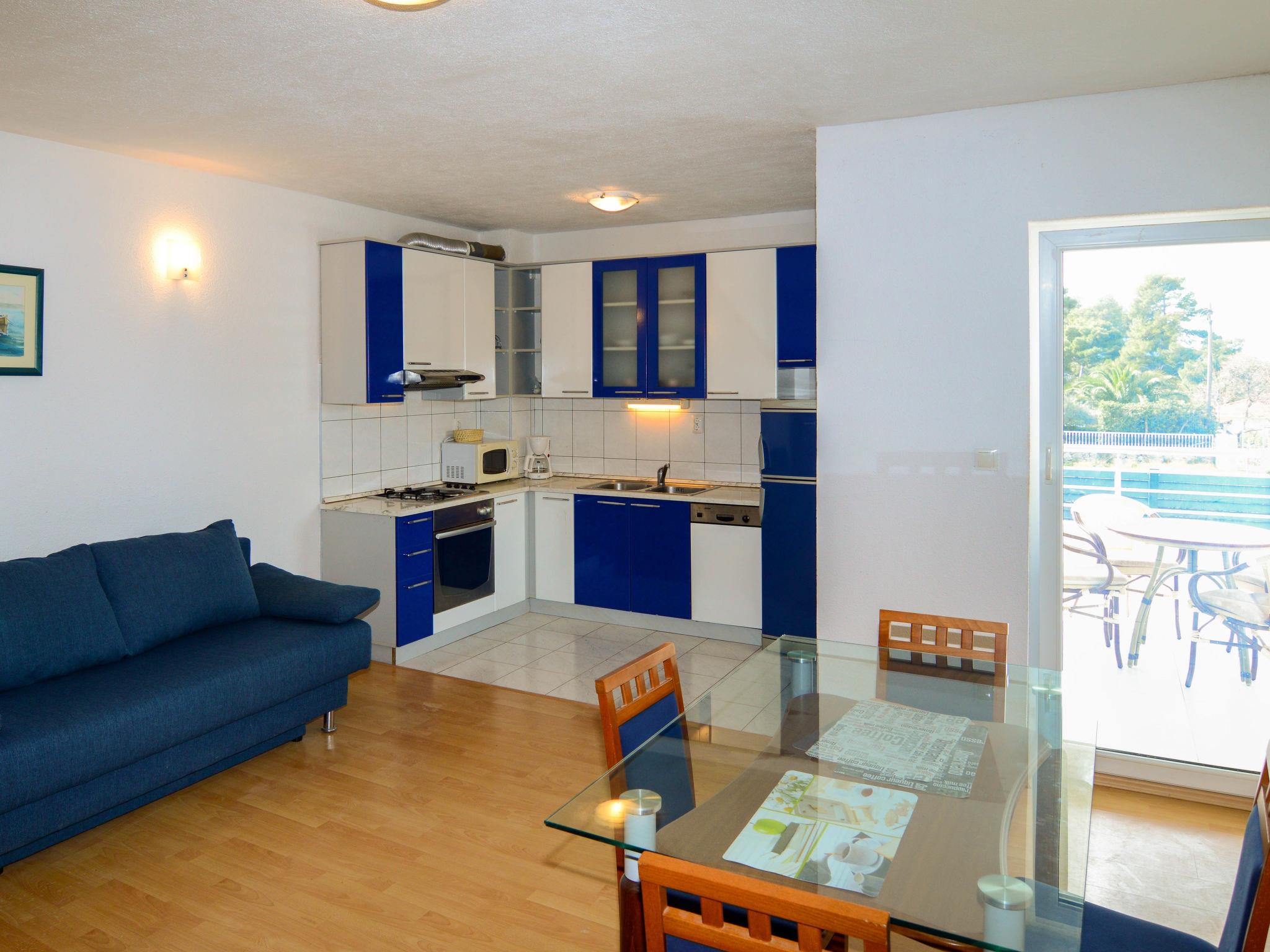 2-room apartment 62 m2, on the upper ground floor. Living/dining room with 1 double sofabed (140 cm, length 200 cm), satellite TV and air conditioning. Exit to the balcony. 1 room with 1 french bed (160 cm, length 200 cm), air conditioning and fan. Exit to the balcony. Open kitchen (2 hot plates, oven, dishwasher, 2 gas rings, microwave, freezer, electric coffee machine). Shower/bidet/WC. No heating option. Balcony 15 m2. Balcony furniture, deck chairs (4). View of the swimming pool. Facilities: Internet (WiFi, free). 2181-01/01-17-2