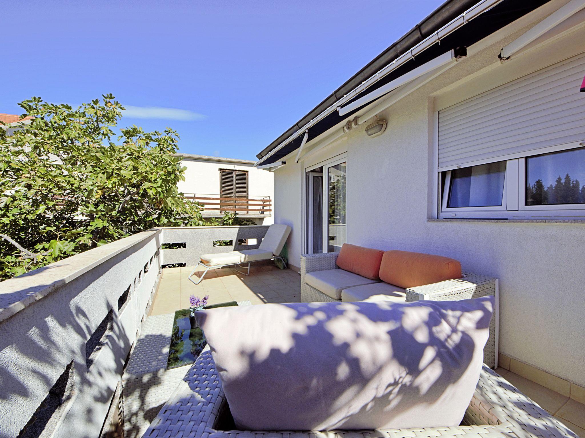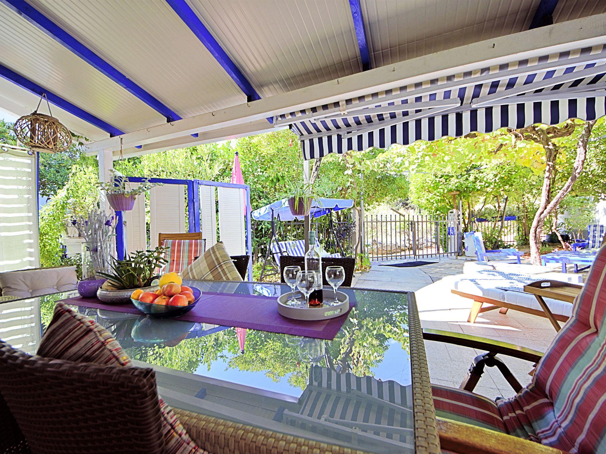 4-room semi-detached house 110 m2 on 2 levels, west facing position. Living/dining room with satellite TV (flat screen), air conditioning. Exit to the terrace. Open kitchen (2 hot plates, oven, dishwasher, microwave, freezer, electric coffee machine). Shower/WC. Upper floor: 1 room with 1 french bed (160 cm, length 200 cm). Exit to the balcony. 1 room with 2 beds (90 cm, length 200 cm). 1 room with 1 bed (90 cm, length 200 cm). Shower/WC. No heating option. Balcony 5 m2, small balcony terrace 15 m2. Terrace furniture, balcony furniture, deck chairs. Facilities: Internet (WiFi, free). Maximum 2 pets/ dogs allowed.