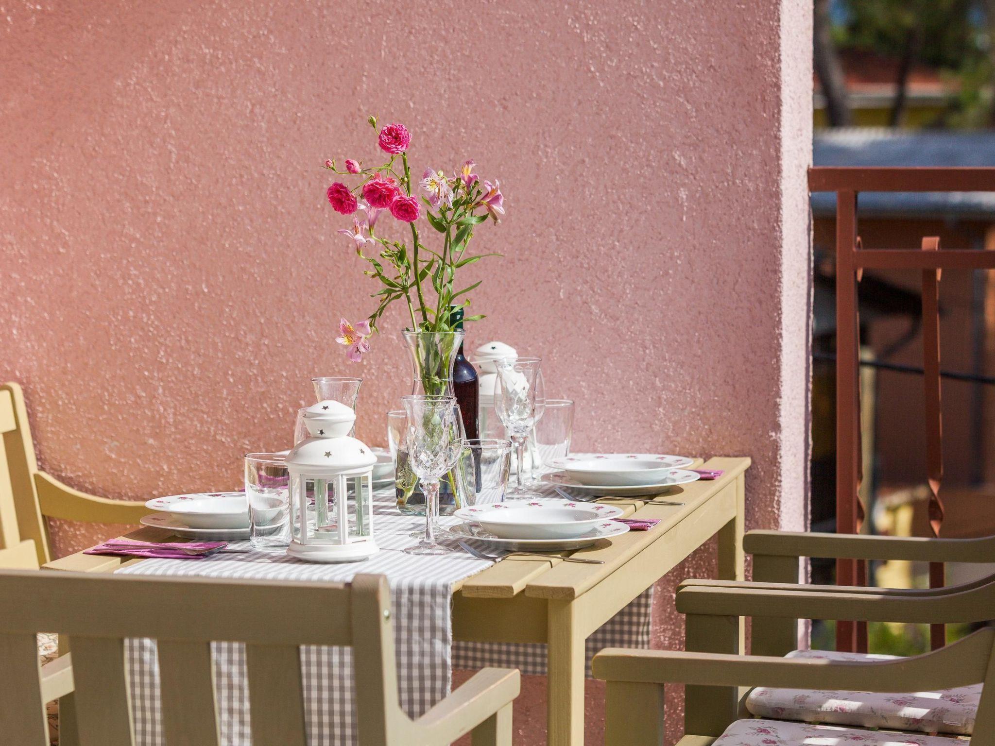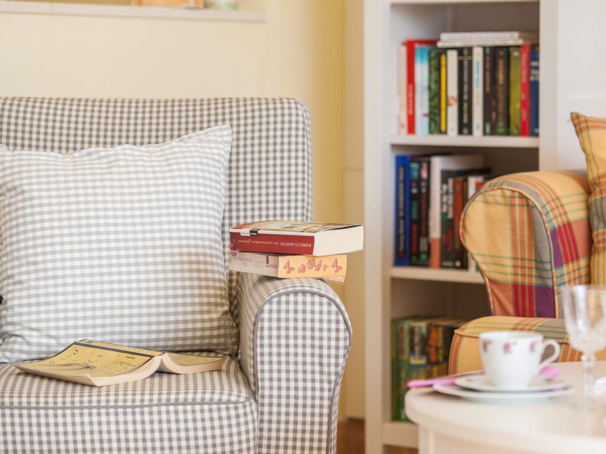 The 30 m2 terrace is furnished with a large dining table, a bench and three chairs. You can also enjoy the evening sea breeze in the cosy lounge area with upholstered armchairs and a two-seater. Two sun loungers are waiting for you to sunbathe or relax. There is also a large, enclosed private car park directly in front of the flat.