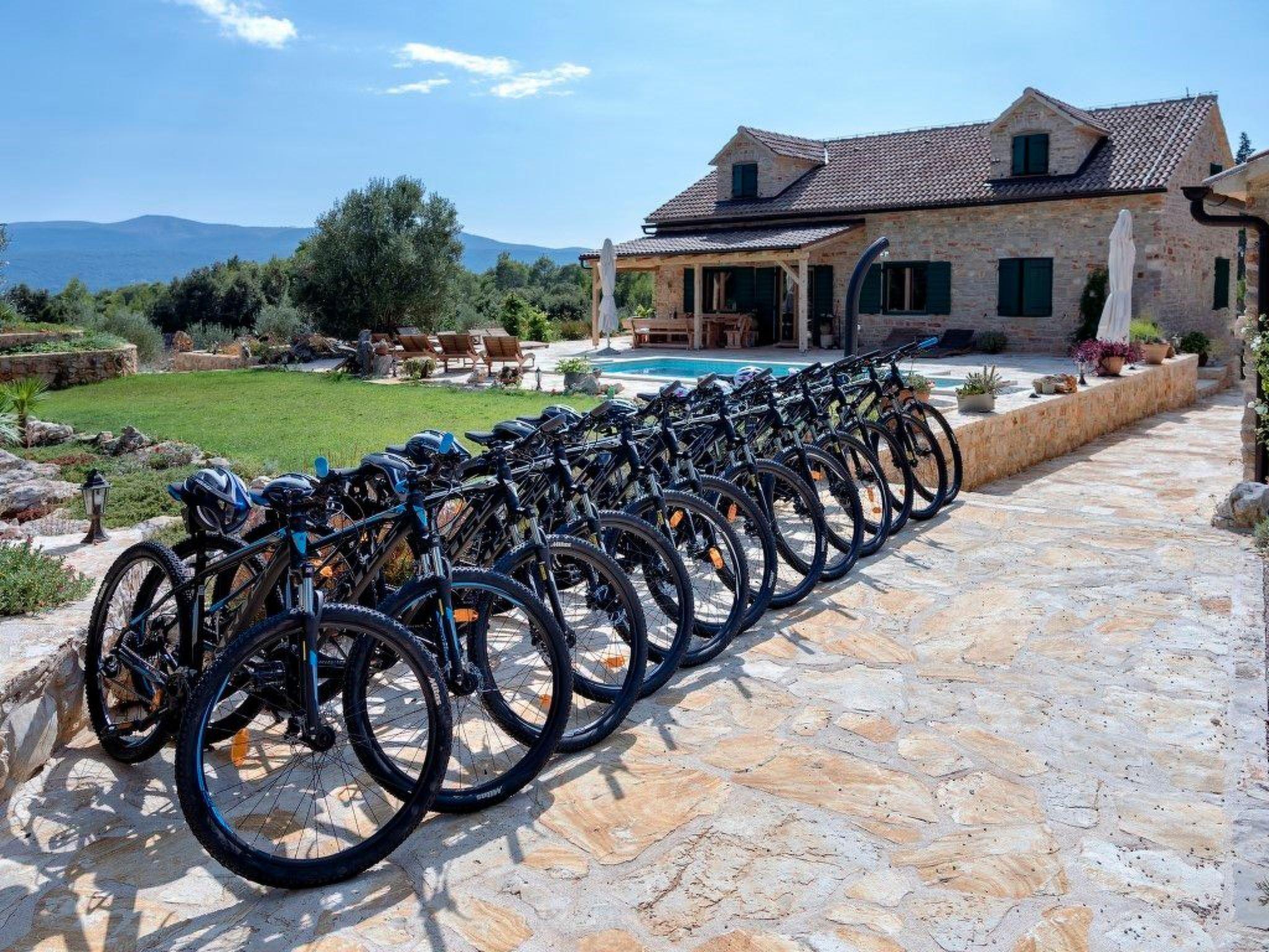 The exterior of the villa is a true Mediterranean paradise for every guest who wants to enjoy nature, complete privacy and a heated swimming pool of 28 m2. Guests also have 12 bikes available.