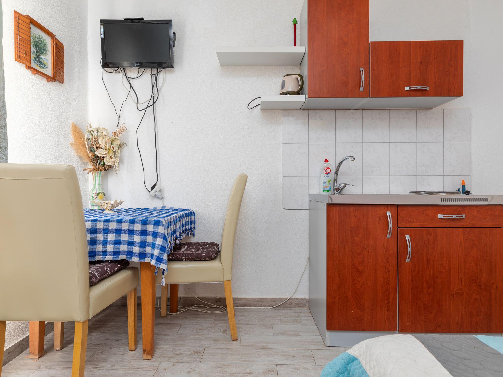 Studio bietet Platz für 2 Gäste. Die Betten sind in Schlafzimmern, die es 1 gibt, innerhalb einer Gesamtfläche von 19m2, angeordnet. Die Gäste haben einen eigenen Balkon zur Verfügung, auf der sie in warmen Sommernächten genießen können. Das Studio-Apartment bietet Meerblick. Es ist erlaubt, Speisen auf dem Gemeinschafts-Grill vorzubereiten. In der Unterkunftseinheit besteht die Möglichkeit des Mitbringens von Haustieren gegen Aufpreis. IM PREIS INBEGRIFFEN: Kurtaxe, Endreinigung, Klimatisierung, Parkplatz, Internet, Kinderbett, tragbarer Grill. VERBINDLICHE ZUSÄTZLICHE KOSTEN: Aufzahlung für Kurzaufenthalte (prozentualer Zuschlag pro Nächtigungsanzahl: 30% - 1, 20% - 2, 10% - 3). UNVERBINDLICHE ZUSÄTZLICHE KOSTEN: Haustiere (5,00 € pro Nacht). Die Verfügbarkeit zusätzlicher Dienstleistungen in Ihrem reservierten Termin und die Preise derselben (falls nicht aufgeführt) müssen im Voraus überprüft werden. Zusätzliche Dienstleistungen die in der Zahlungsaufforderung nicht aufgeführt sind werden direkt beim Vermieter bezahlt, angenommen der Gast nutzt auch diese. Ermäßigung auf den Grundpreis: Gratistag 14=13 (bei einem Aufenthalt von 14 Tagen oder mehr erhalten Sie einen Gratistag für den Aufenthalt bis 31.12.26).