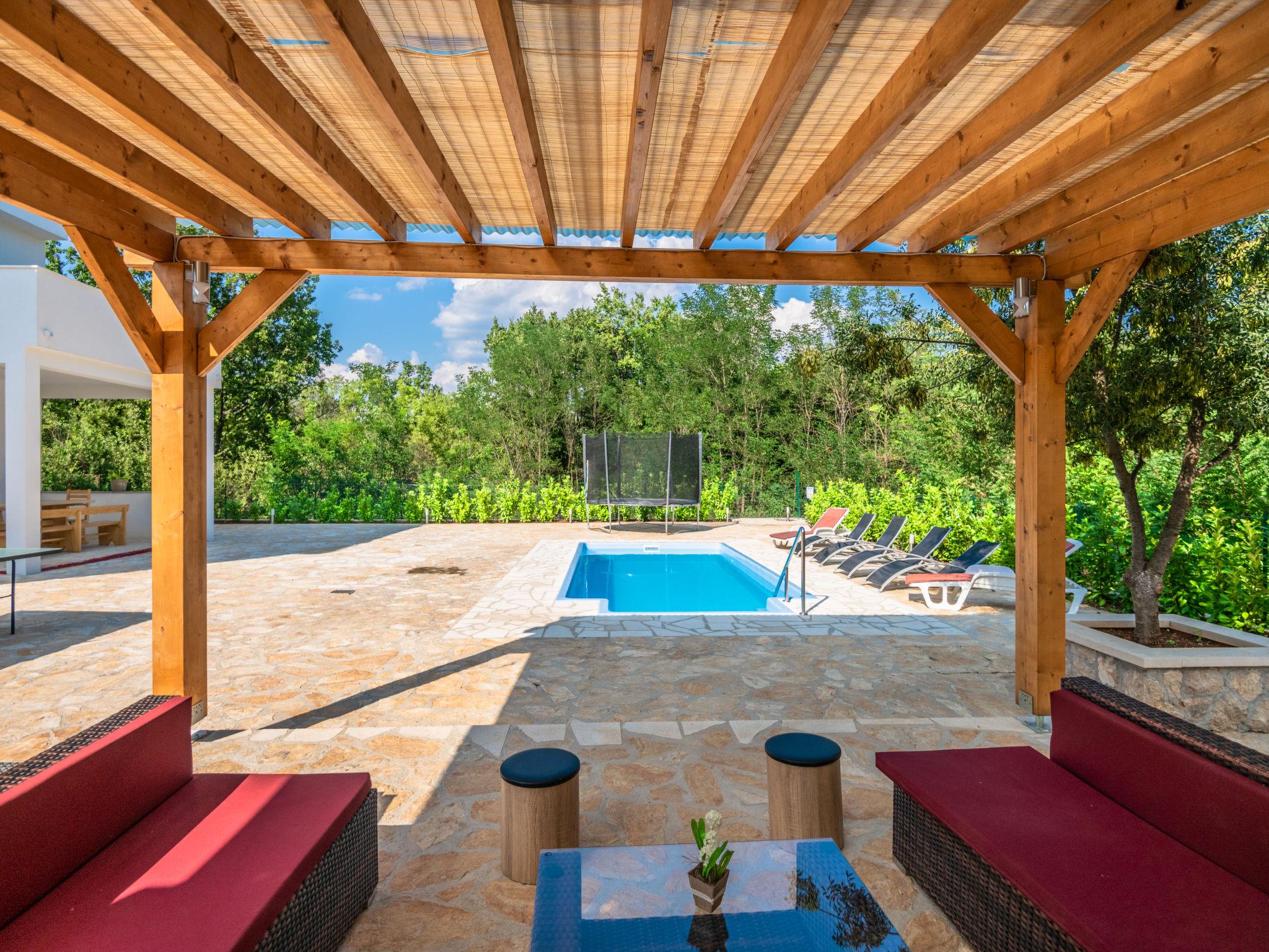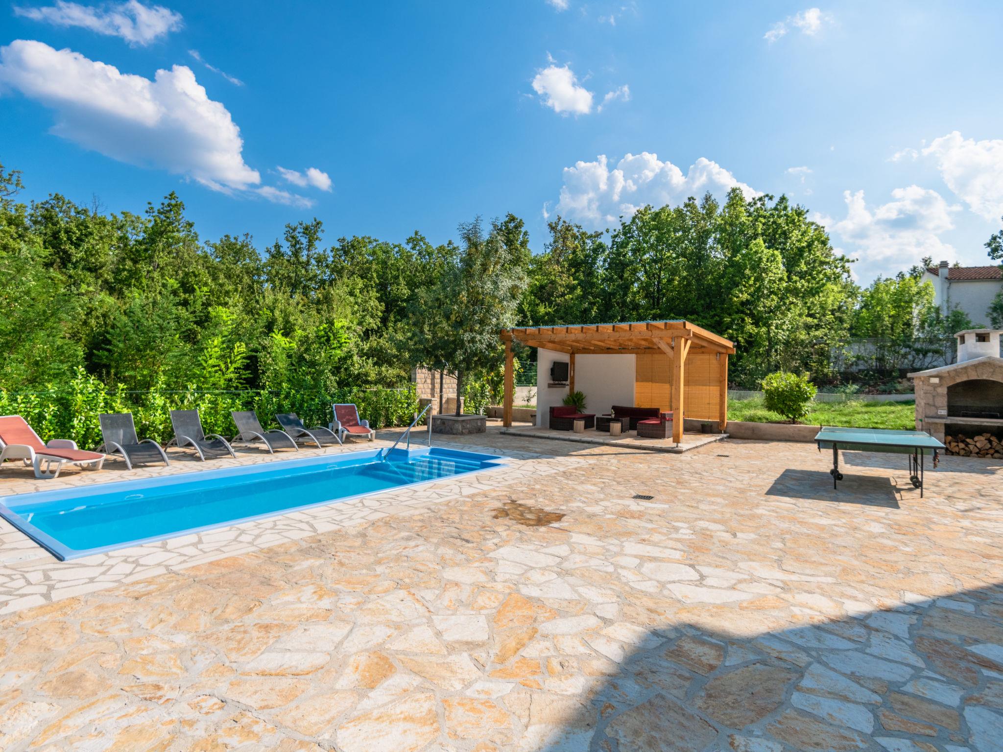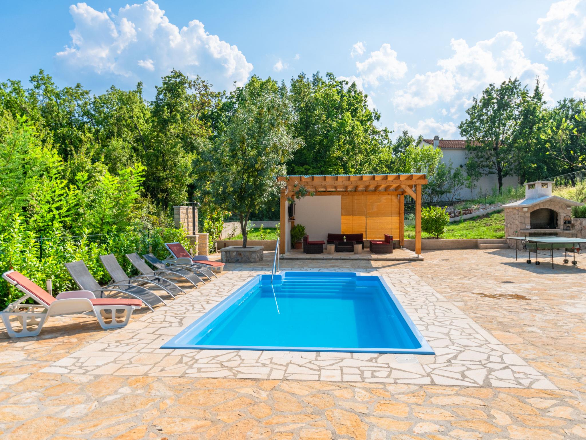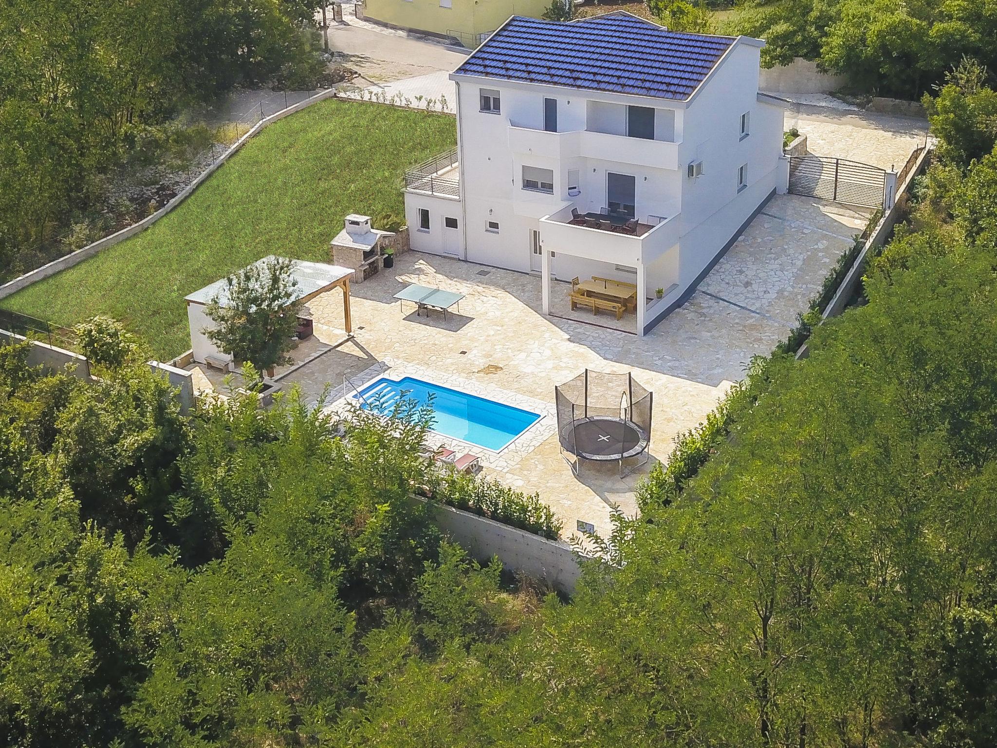 Single-family house "Villa Dalmatina", 2 storeys. 7.5 km from the centre of Imotski, in a quiet, sunny position, 30 km from the sea, 30 km from the beach, in a cul-de-sac. Private: property 3'000 m2 (fenced) with trees, swimming pool angular (7 x 4 m, depth 150 cm, seasonal availability: 15.Jun. - 01.Oct.). WC in the pool area, outdoor shower, pool house with fridge and cooking stove, table tennis, terrace (30 m2), barbecue. In the house: internet access, trampoline. Parking (for 5 cars) at the house on the premises. Shop 250 m, restaurant 7.5 km, bus stop 260 m, pebble beach 30 m. Nearby attractions: Modro jezero 10 km.