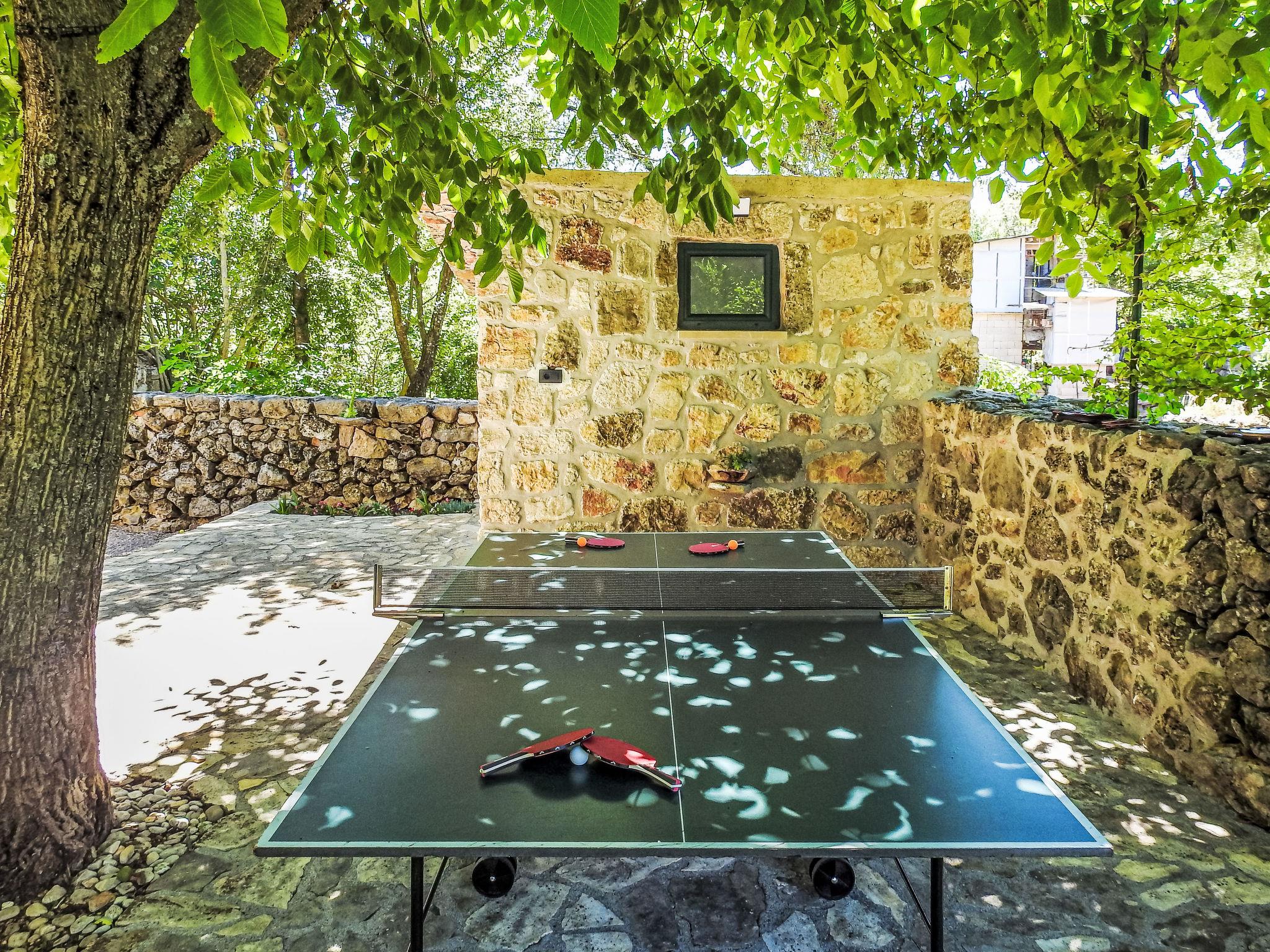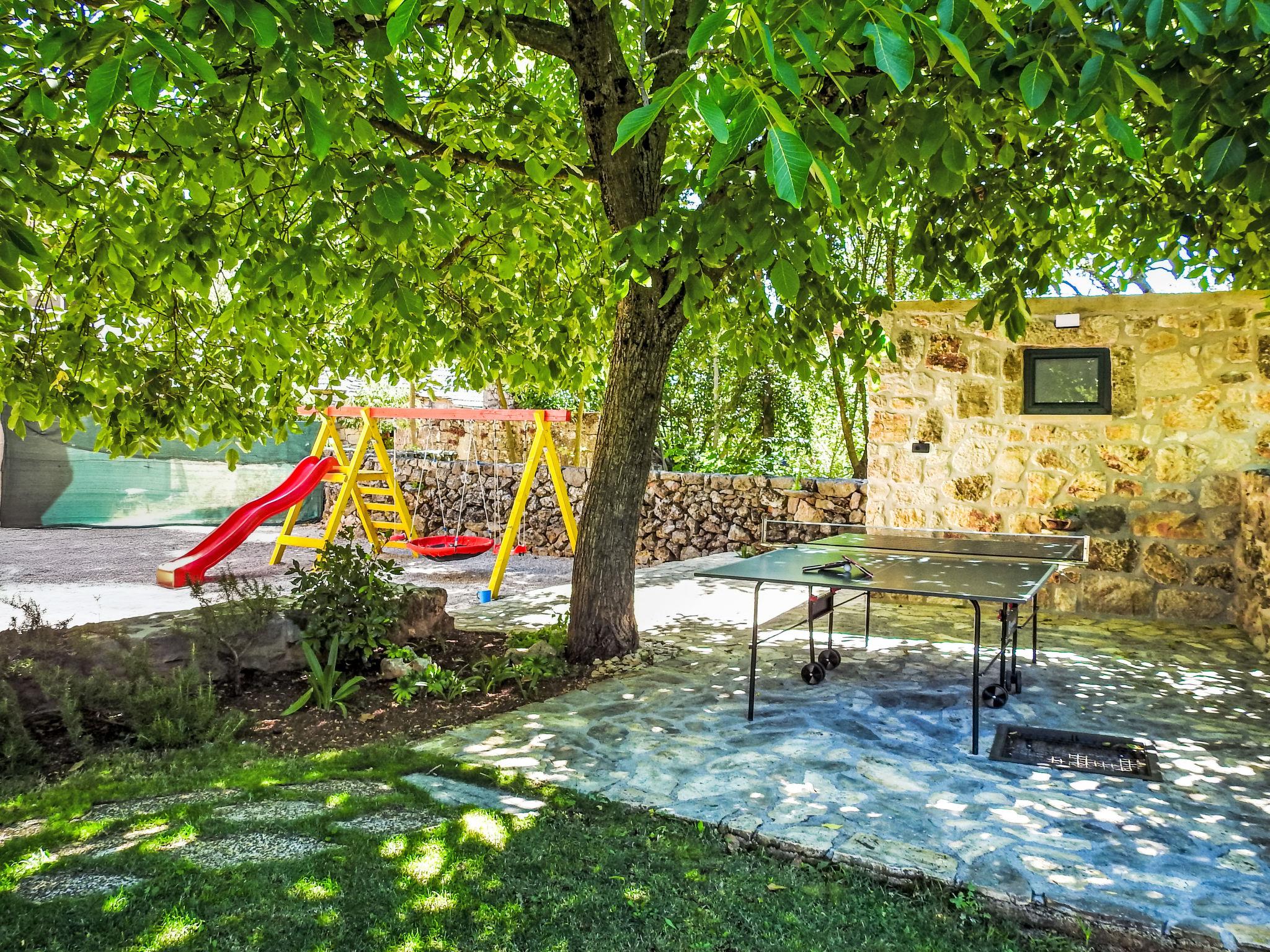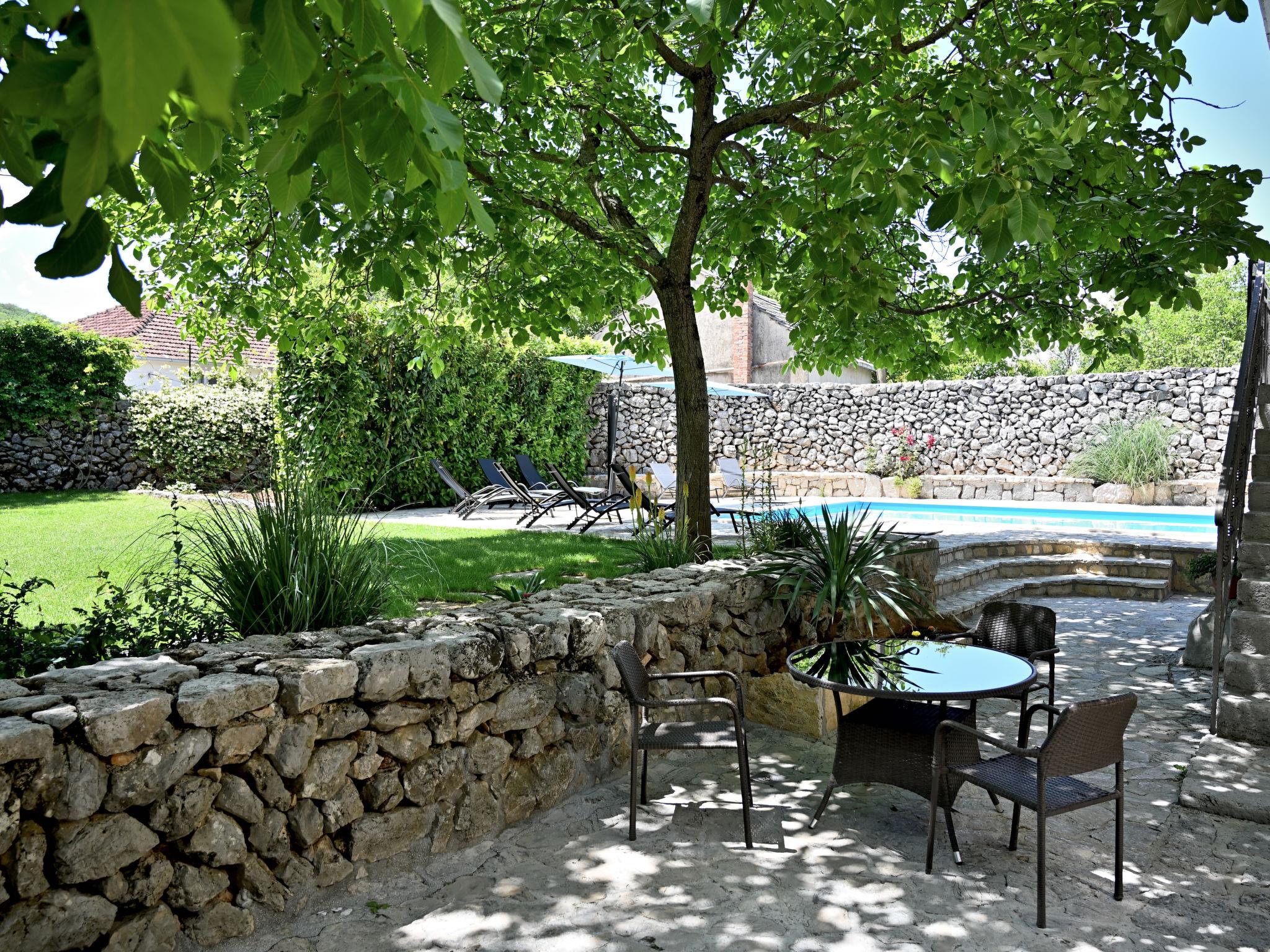 Single-family house "Markanovi Dvori", renovated in 2024. 8 km from the centre of Imotski, in a quiet position, 35 km from the sea, in the countryside. Private: property 1'500 m2 (fenced), garden with lawn and trees, swimming pool angular (8 x 5 m, depth 150 cm, seasonal availability: 01.Jun. - 01.Oct.) with internal staircase. Outdoor shower, table tennis, terrace (30 m2), garden furniture, barbecue, children's playground. In the house: internet access, table football. Parking (for 5 cars) at the house on the premises. Shop 800 m, restaurant 1 km, bus stop 7.2 km, pebble beach 35 km. Nearby attractions: Modro jezero 10 km.