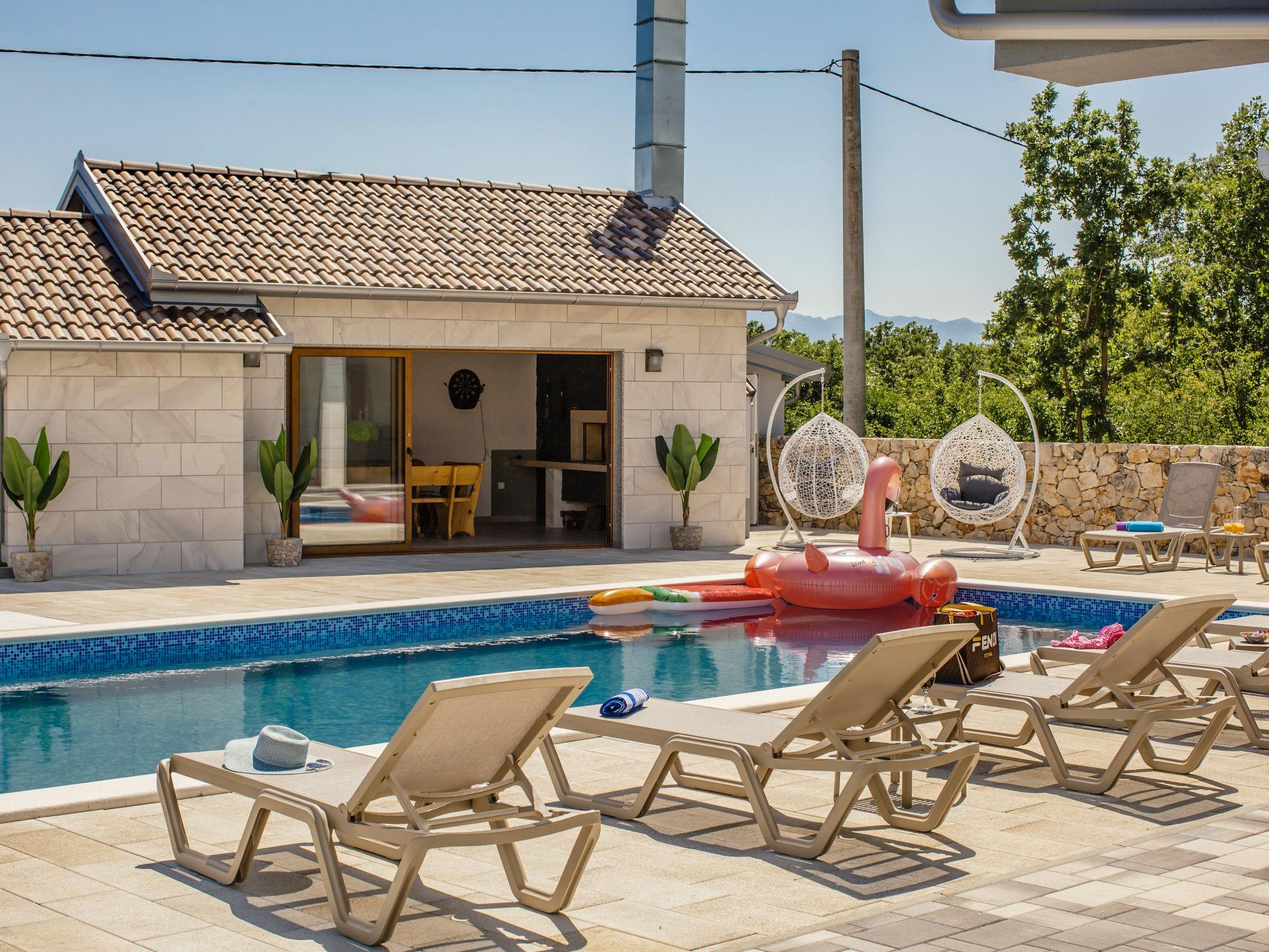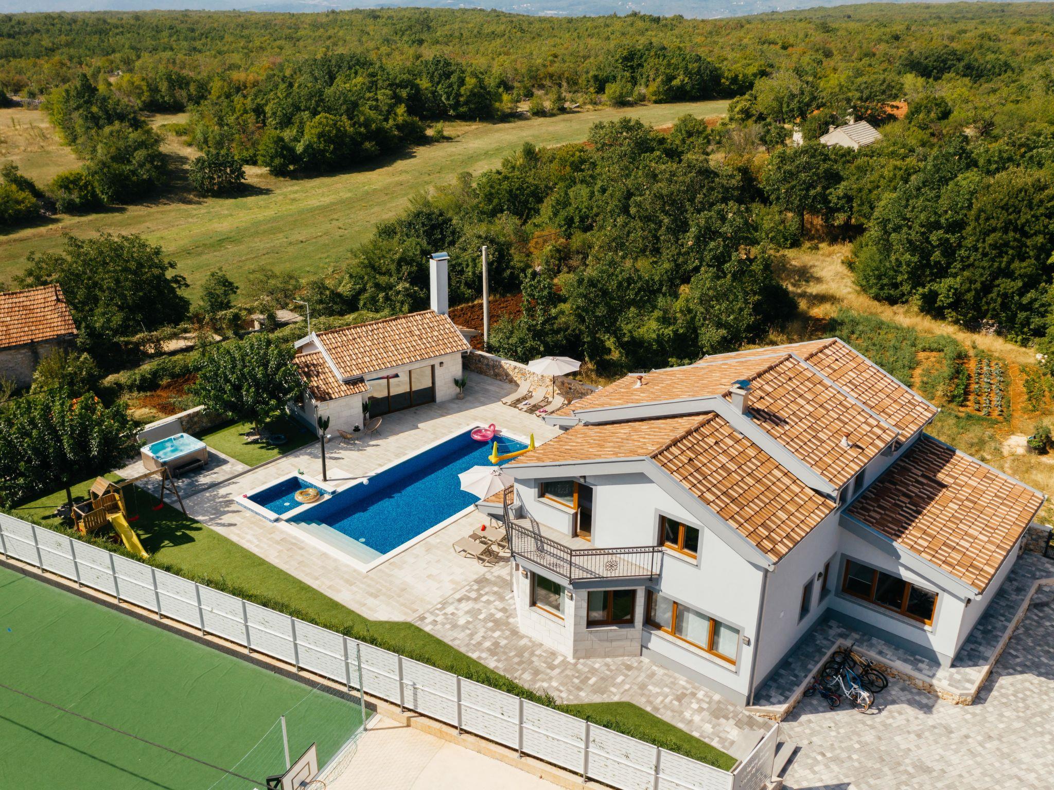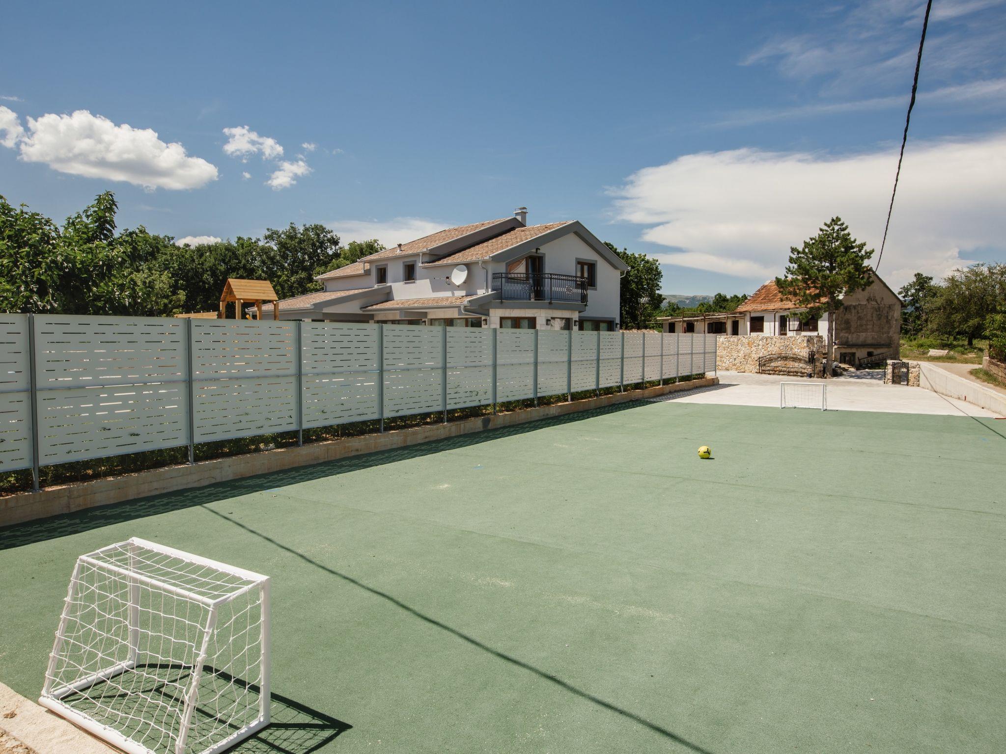 Gornji Proložac 6 km from Imotski: Child friendly, modern, beautiful villa "Oasis of peace", 2 storeys, built in 2019. In a quiet, sunny position, 38 km from the sea. Private: property 1'370 m2 (fenced), swimming pool angular, heated (12 x 5 m, depth 150 cm, seasonal availability: 01.May. - 01.Oct.) with internal staircase and salt-electrolysis pool-cleaning system. Paddling pool, outdoor shower, hot tub, pool house with fridge, WC and cooking stove, barbecue, children's playground (slide, swing). In the house: internet access, storage room for bicycles, washing machine. Available: bicycles. Parking (for 4 cars) at the house on the premises. Shop 6 km, restaurant 1 km, bus stop 7.3 km, pebble beach 38 km. Walking paths from the house 1 km, cycle lane 1 km. Well-known lakes can easily be reached: Modro jezero 1 km, Crveno jezero 1 km. Please note: suitable for families. The owner does not accept any youth groups. It is necessary to announce 7 days in advance if the pool heating is required. Pool house: kitchen with dining table and satellite TV. Private: small football playground (included).