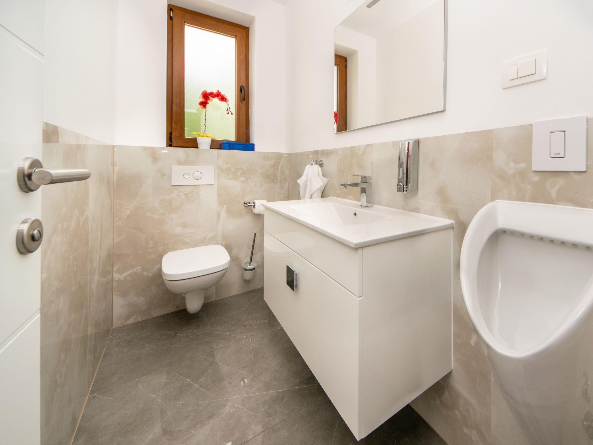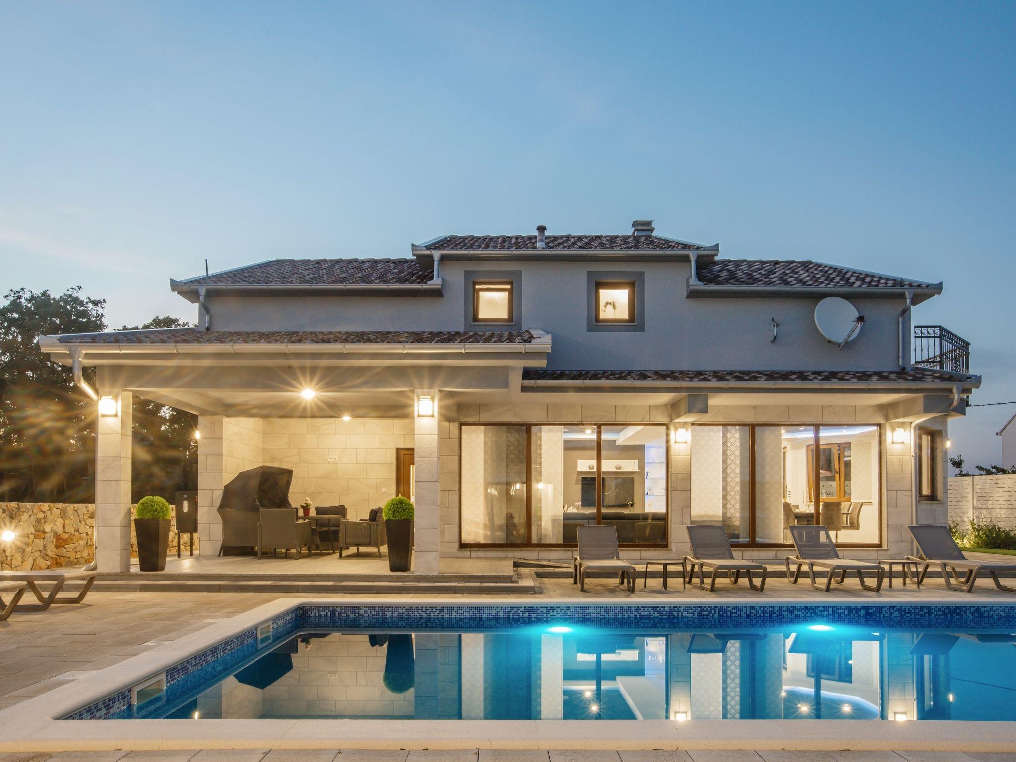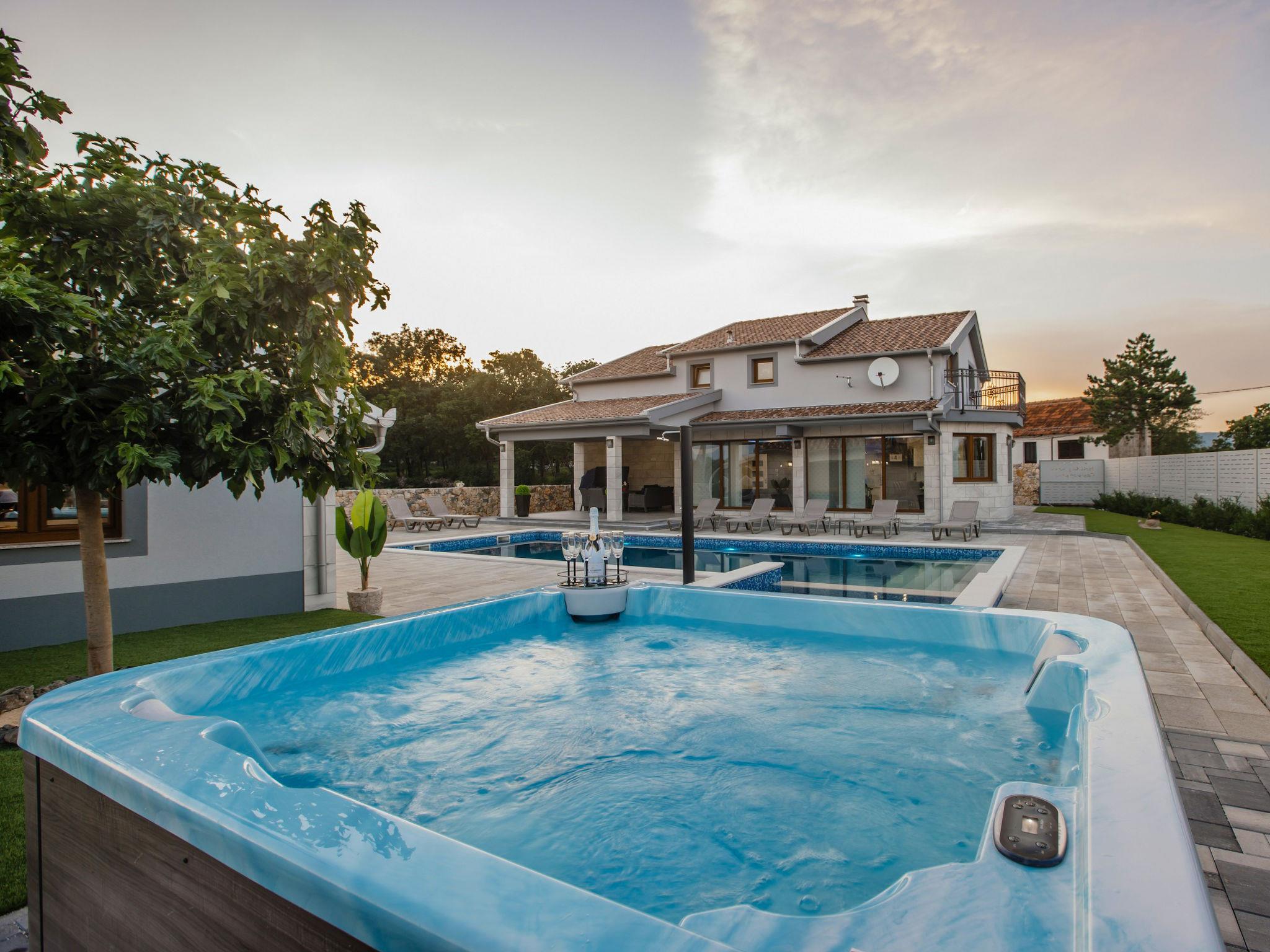 Gornji Proložac 6 km from Imotski: Child friendly, modern, beautiful villa "Oasis of peace", 2 storeys, built in 2019. In a quiet, sunny position, 38 km from the sea. Private: property 1'370 m2 (fenced), swimming pool angular, heated (12 x 5 m, depth 150 cm, seasonal availability: 01.May. - 01.Oct.) with internal staircase and salt-electrolysis pool-cleaning system. Paddling pool, outdoor shower, hot tub, pool house with fridge, WC and cooking stove, barbecue, children's playground (slide, swing). In the house: internet access, storage room for bicycles, washing machine. Available: bicycles. Parking (for 4 cars) at the house on the premises. Shop 6 km, restaurant 1 km, bus stop 7.3 km, pebble beach 38 km. Walking paths from the house 1 km, cycle lane 1 km. Well-known lakes can easily be reached: Modro jezero 1 km, Crveno jezero 1 km. Please note: suitable for families. The owner does not accept any youth groups. It is necessary to announce 7 days in advance if the pool heating is required. Pool house: kitchen with dining table and satellite TV. Private: small football playground (included).